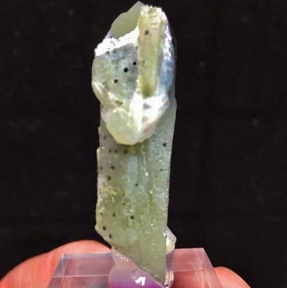 中心部にはクリアクリスタル、またはアメジストが入っており、周りの黒い斑点は「ヘデンベルガイト」。このヘデンベルガイト成分がクリスタルに溶け込むとクリスタルが緑色になります。