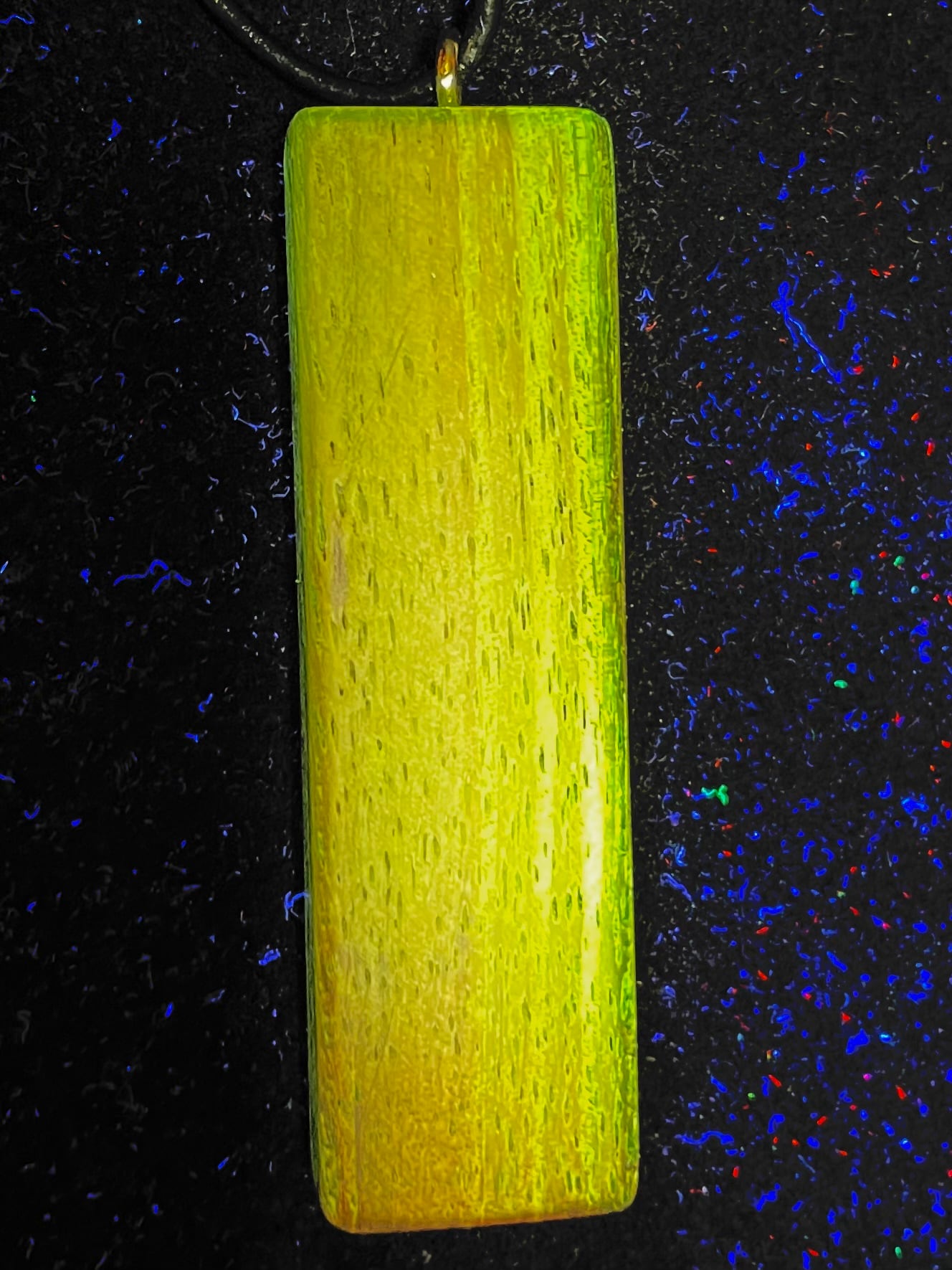 ペンダントのものは、光沢塗装が施されているため、まず表面の塗装がブルーに反射してしまいますが、よく見ますと塗装の下で薄っすら黄色っぽく蛍光しているのがわかります。