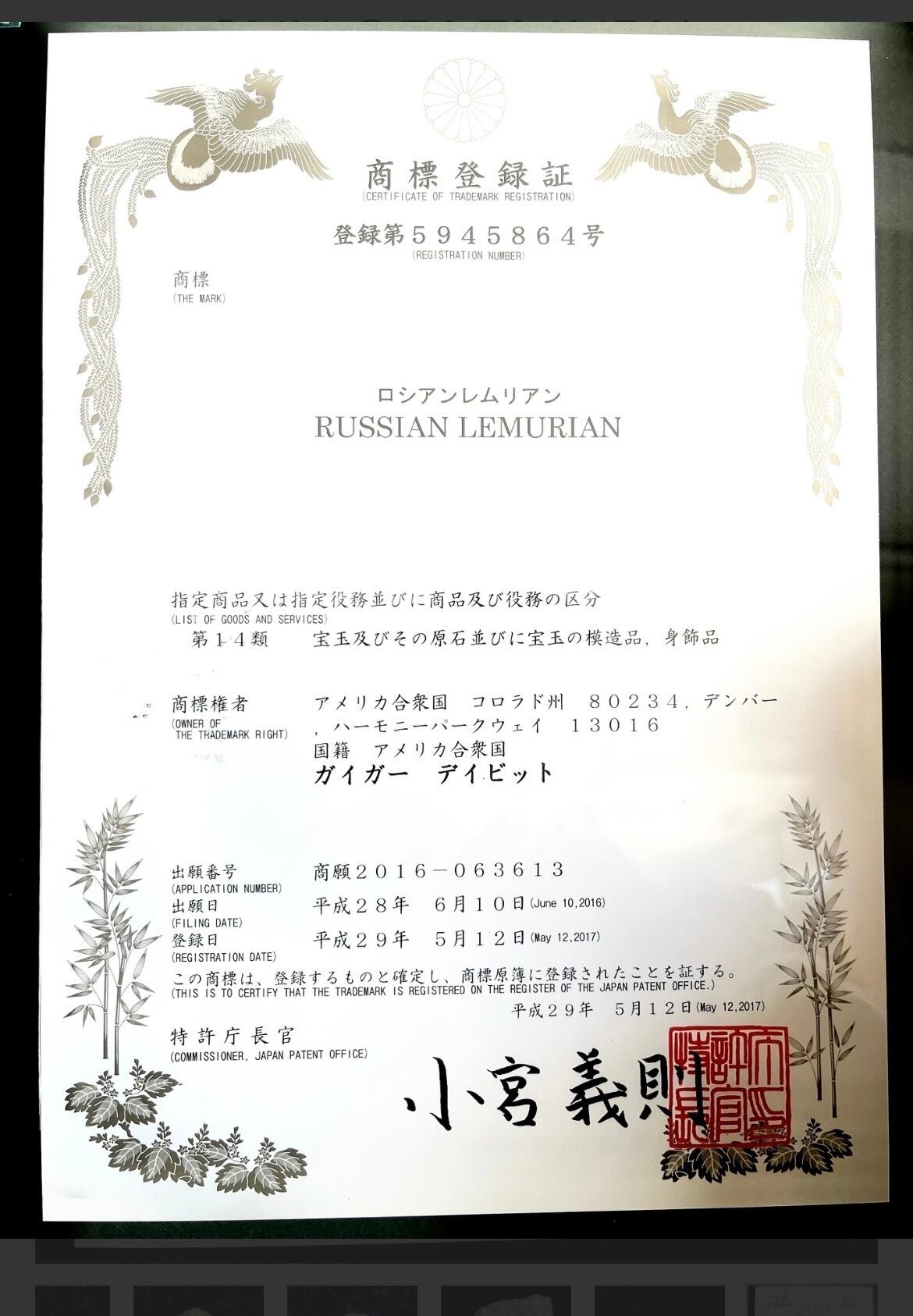 デイヴィッド・ガイガー氏のロシアンレムリアン意匠登録のコピー、直筆サイン入り名刺をお付けします。