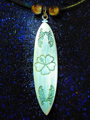 ペンダントのものは、光沢塗装が施されているため、まず表面の塗装がブルーに反射してしまいますが、よく見ますと塗装の下で薄っすら黄色っぽく蛍光しているのがわかります。