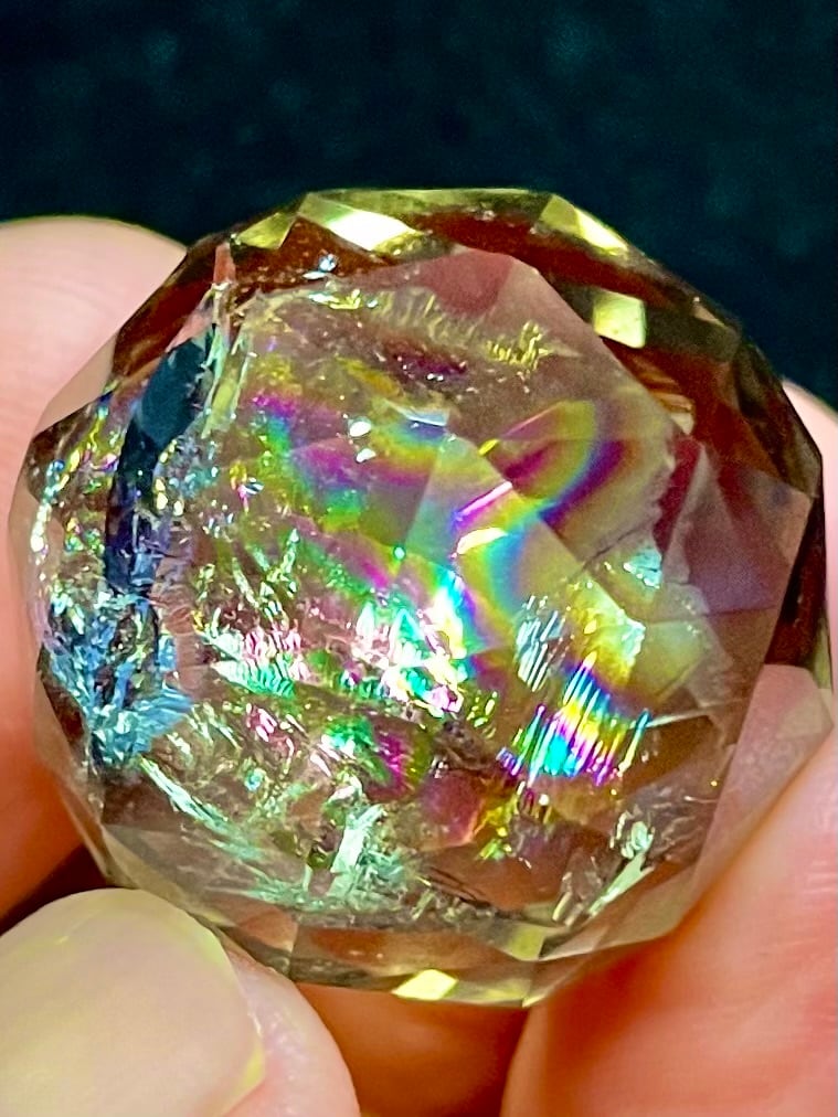 この美しいレインボー「スモーキー・クオーツ」は、多面体カットが施され、光を受け止めるごとに虹色の輝きを放ちます。