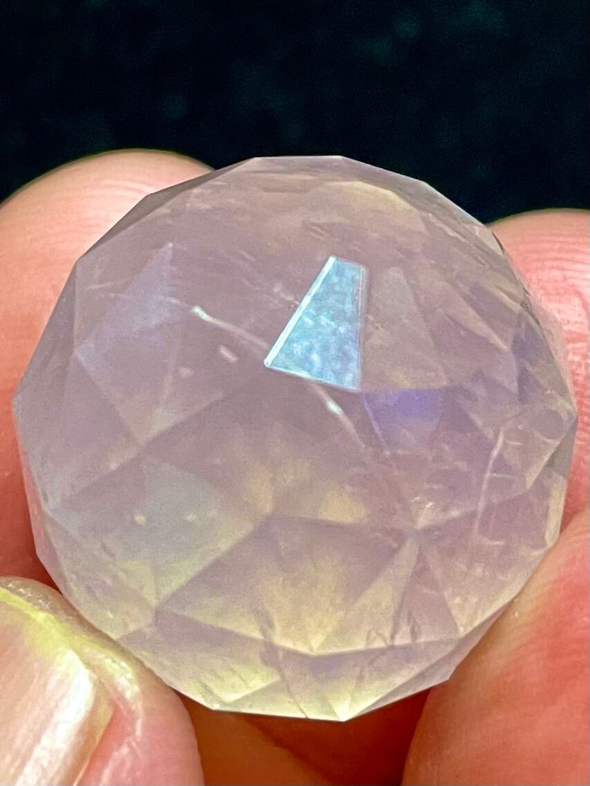 この美しい「ローズ・クオーツ」は、多面体カットが施されており、光を受けると優しいピンク色の輝きを放ちます。