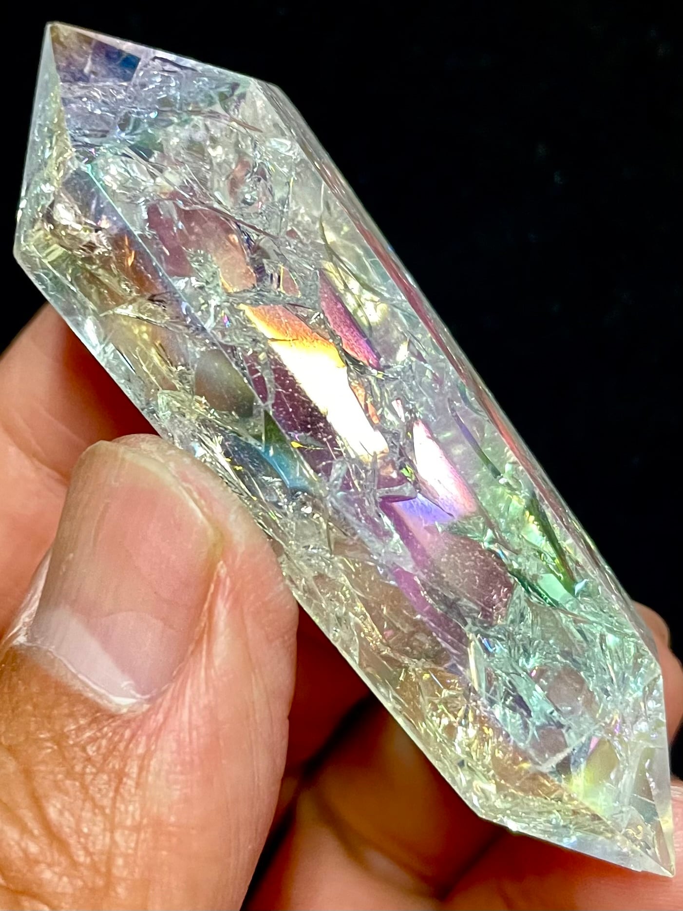 人工的にクラックを入れ、オーラ加工を施して、エネルギーレベルを上げている水晶です。