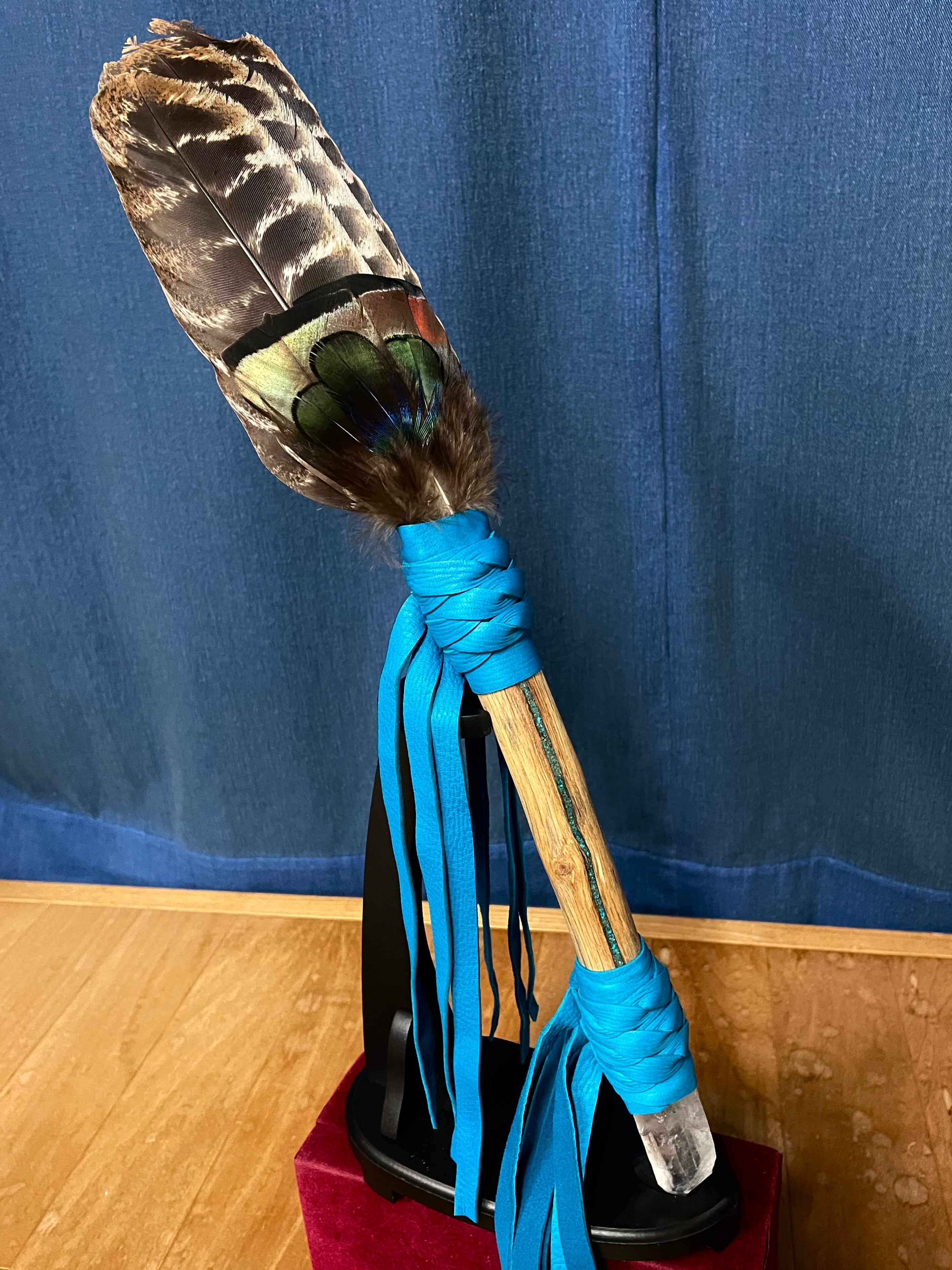 羽根と石で飾られた水晶の杖(ワンド)は、現界(地上)のエネルギー、霊的なエネルギー、天界のエネルギーが鮮やかに融合した象徴です。