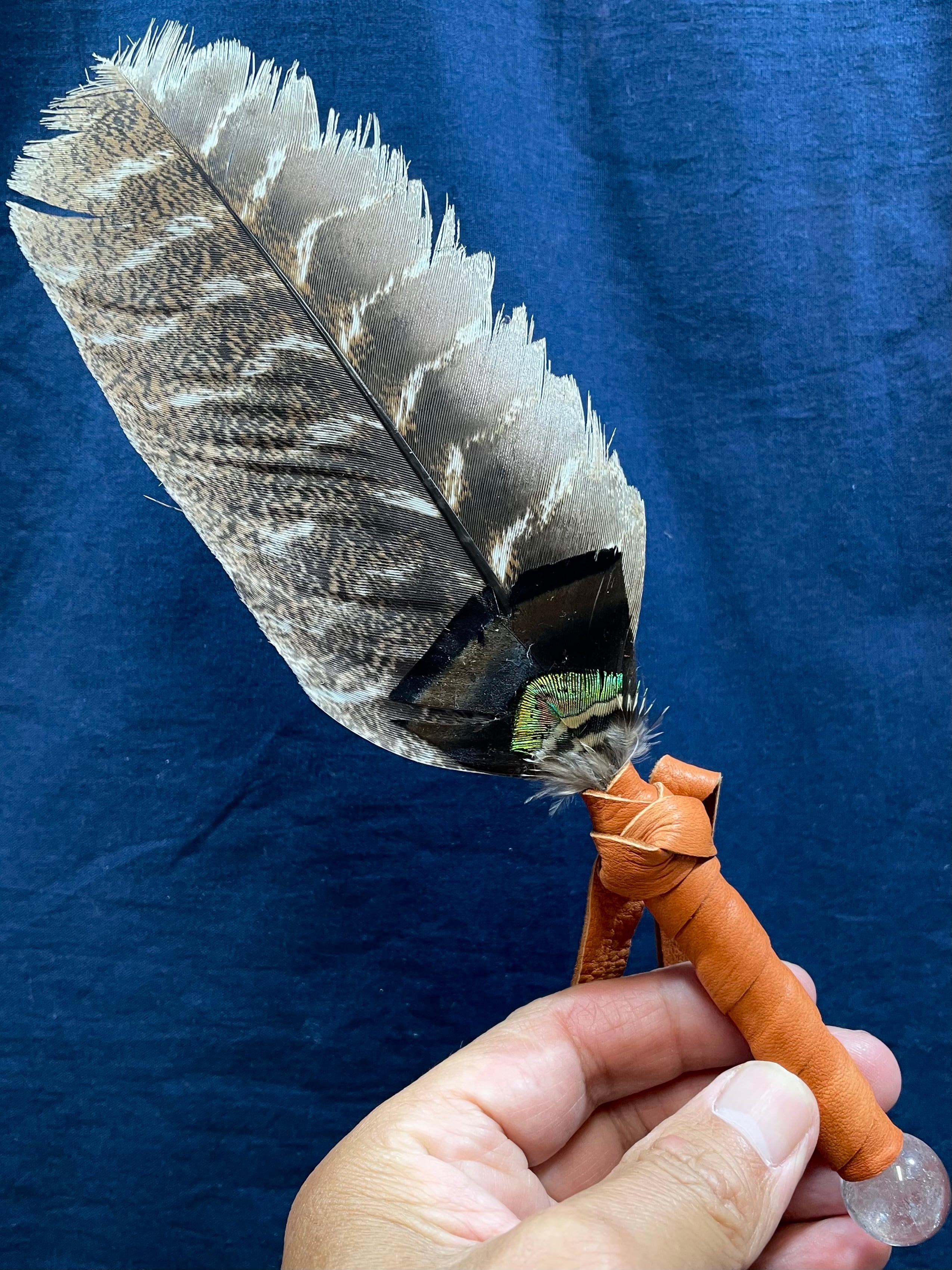 セージやパロサントなどのハーブと併用することで、羽根は煙を漂わせ導き、停滞したエネルギーや負のエネルギーを掃き清めます。羽根の掃くような動きは、飛翔する鳥の浄化作用を映し出しています。