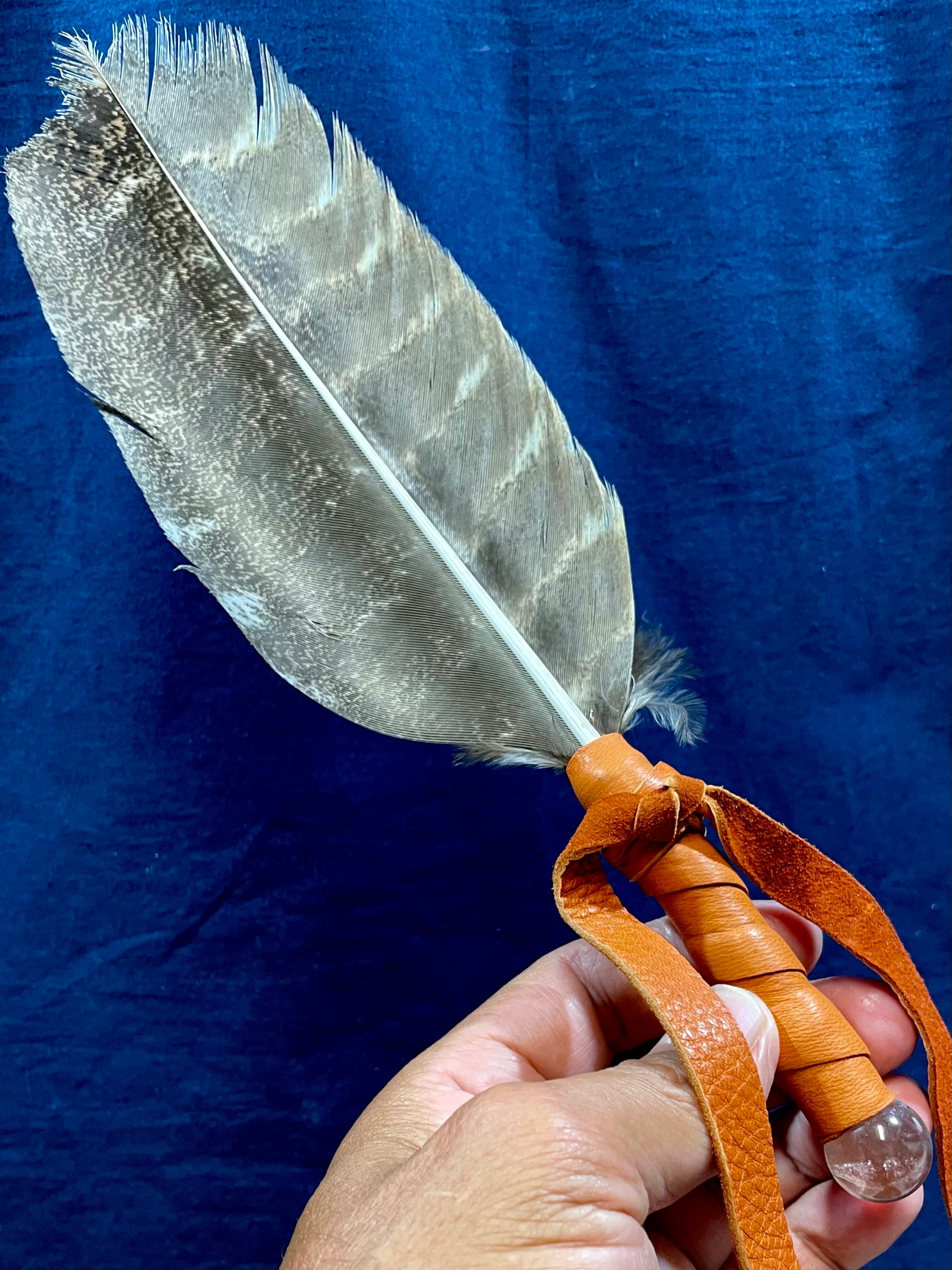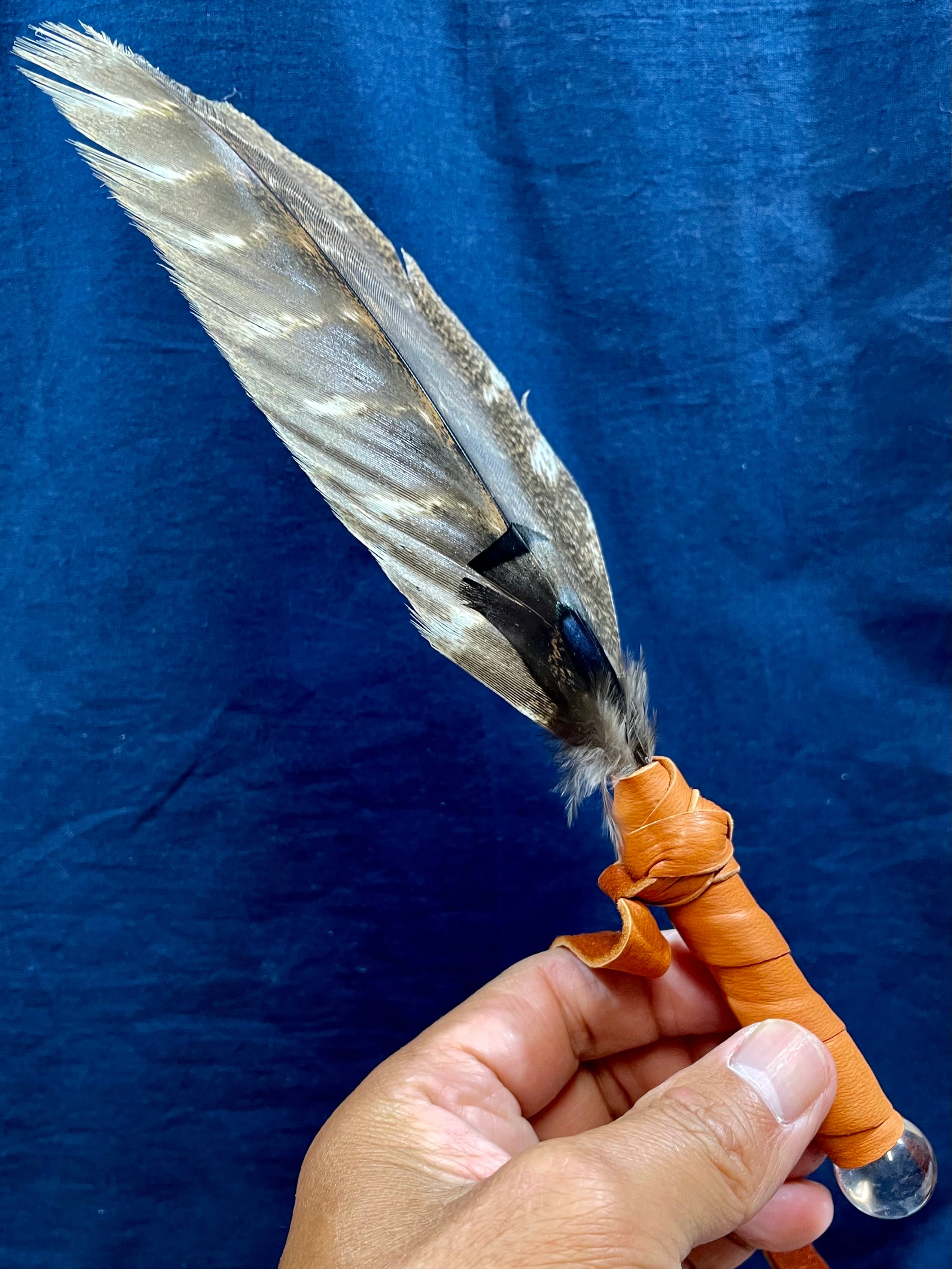 セージやパロサントなどのハーブと併用することで、羽根は煙を漂わせ導き、停滞したエネルギーや負のエネルギーを掃き清めます。羽根の掃くような動きは、飛翔する鳥の浄化作用を映し出しています。