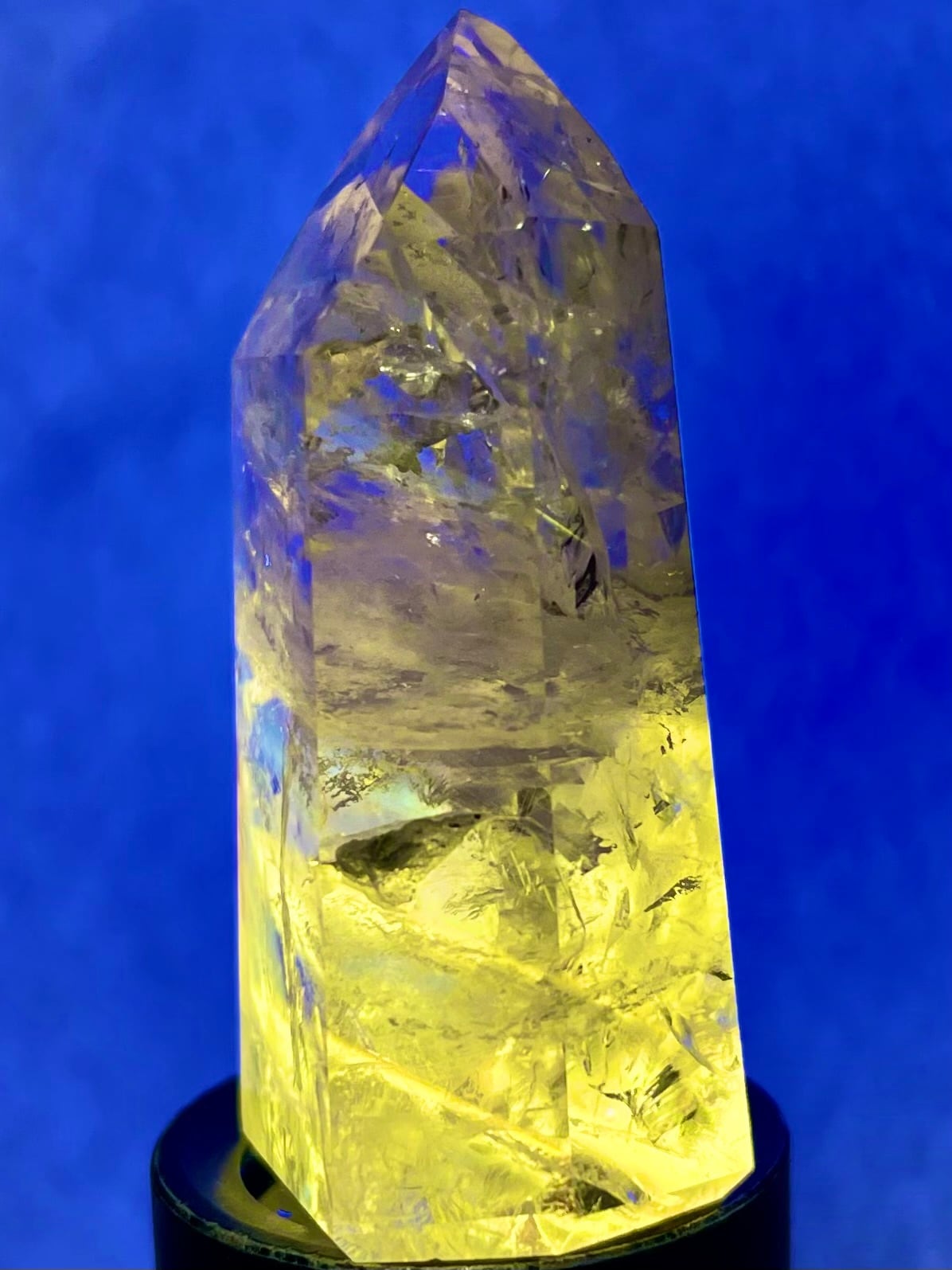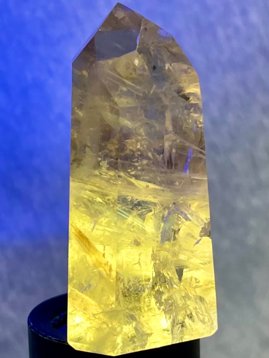 紫外線(UV)照射下でパウエライトの内包物が蛍光を発する様子は、隠された力と内なる真実を顕在化させる象徴です。