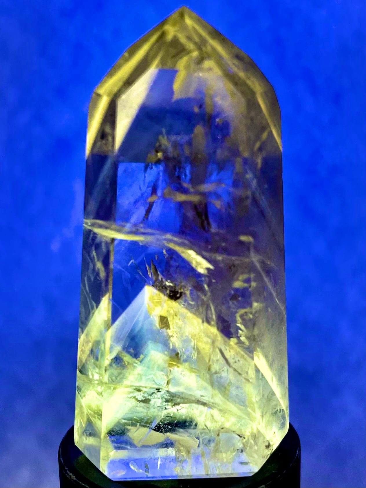 紫外線(UV)照射下でパウエライトの内包物が蛍光を発する様子は、隠された力と内なる真実を顕在化させる象徴です。
