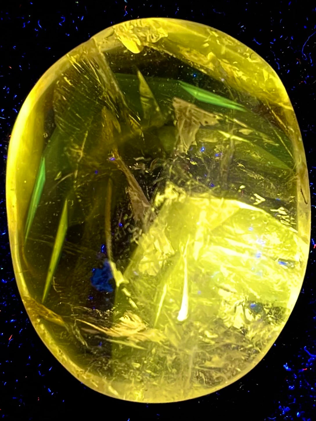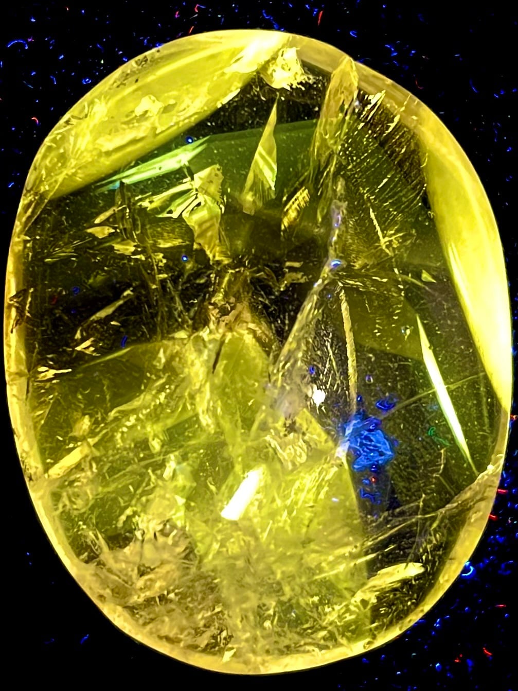 紫外線(UV)照射下でパウエライトの内包物が蛍光を発する様子は、隠された力と内なる真実を顕在化させる象徴です。
