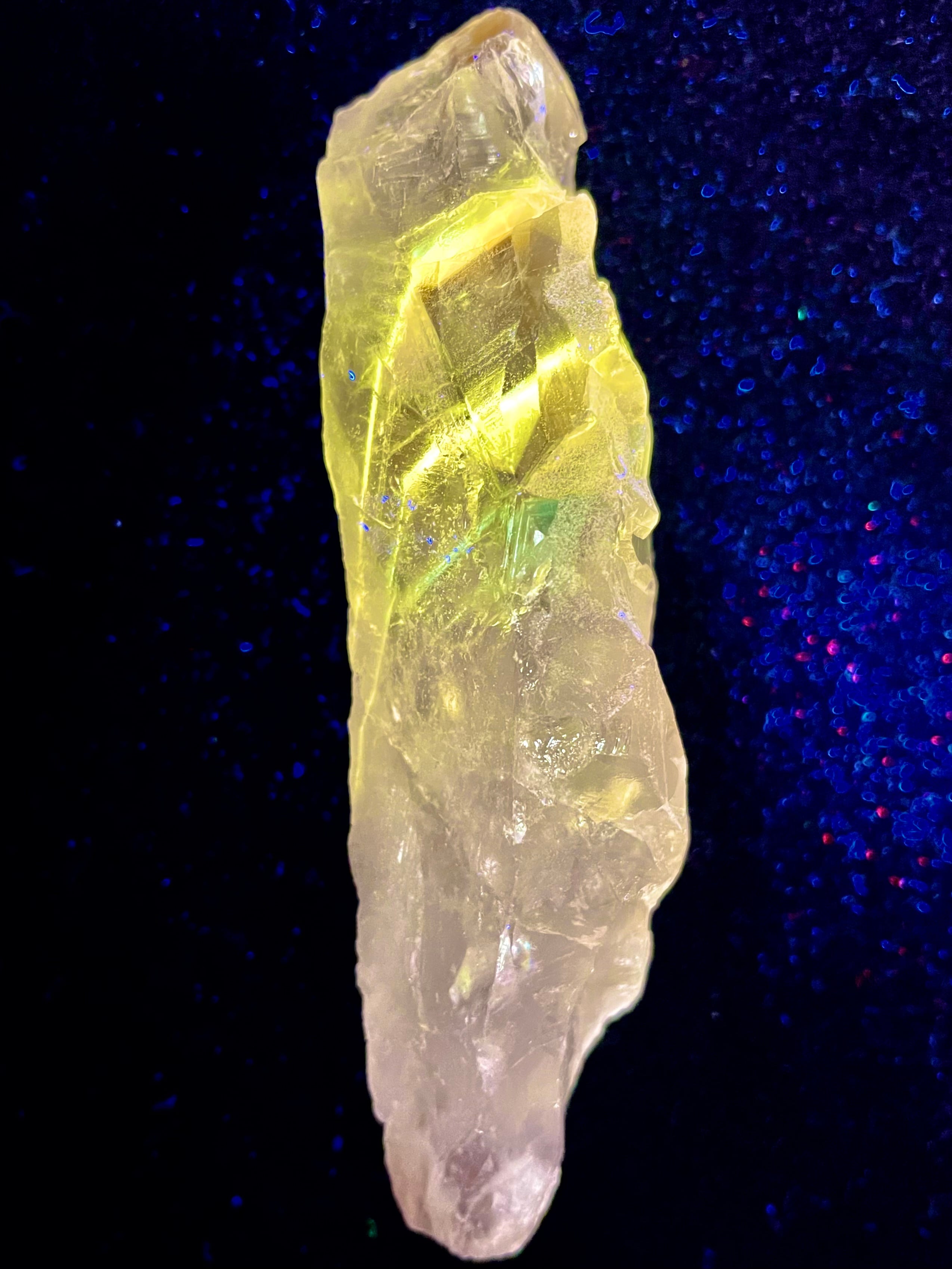 紫外線下で発光するパウエル石内包物は、この結晶の霊的意味の中核を成す。