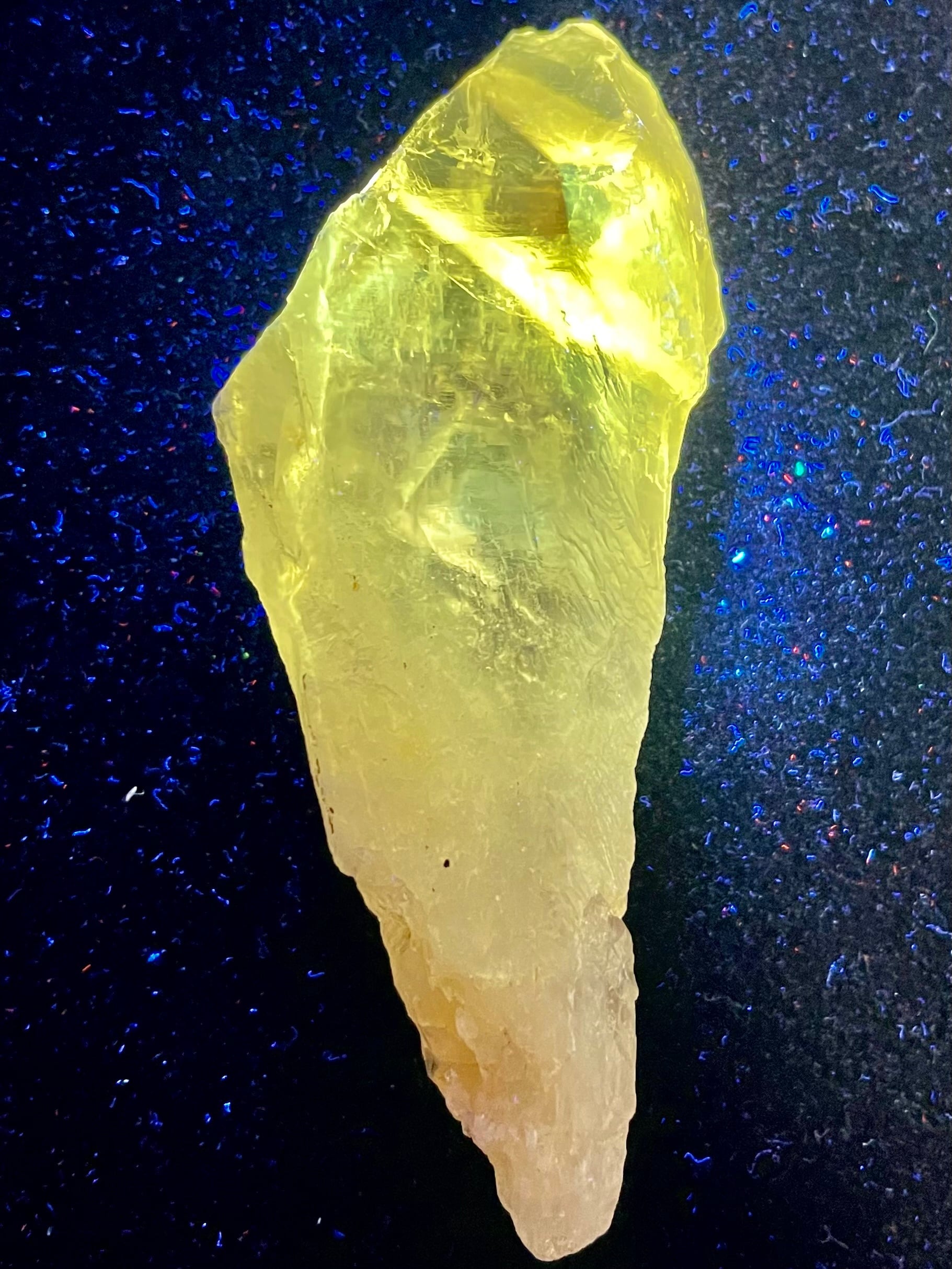 紫外線下で発光するパウエル石内包物は、この結晶の霊的意味の中核を成す。