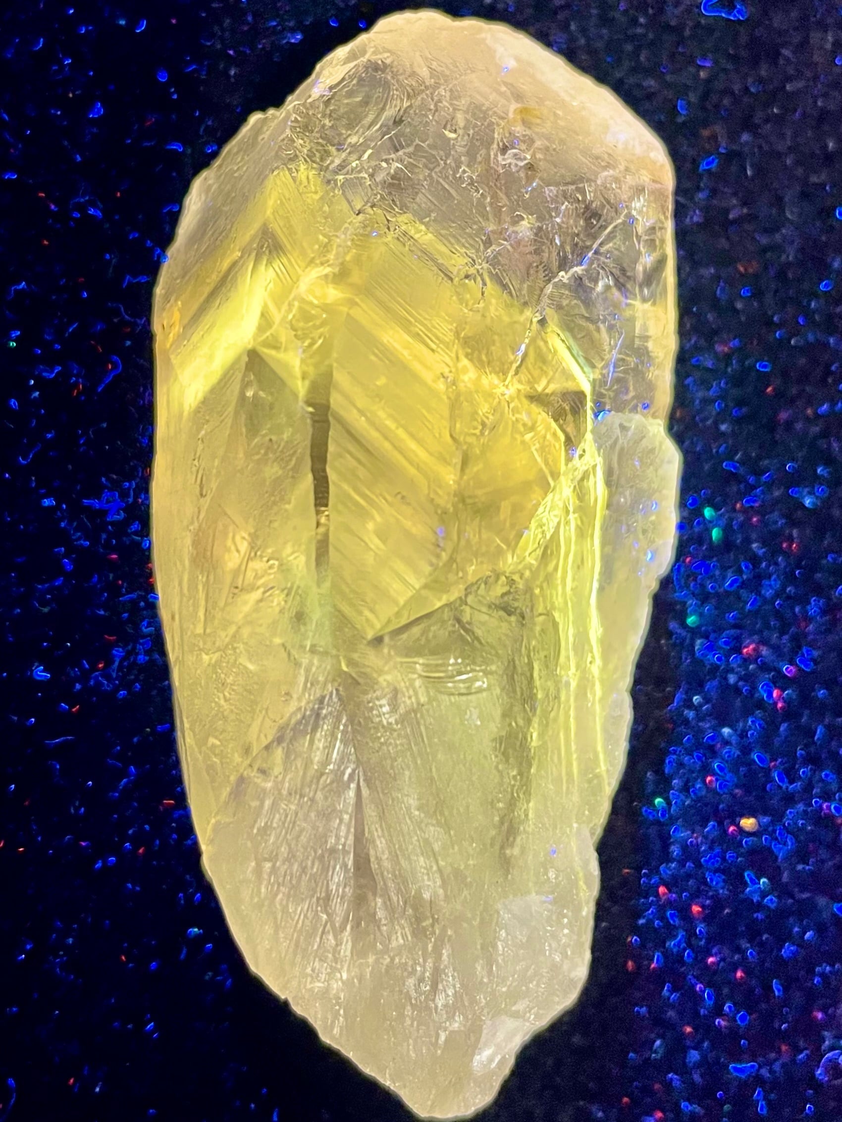 紫外線下で発光するパウエル石内包物は、この結晶の霊的意味の中核を成す。