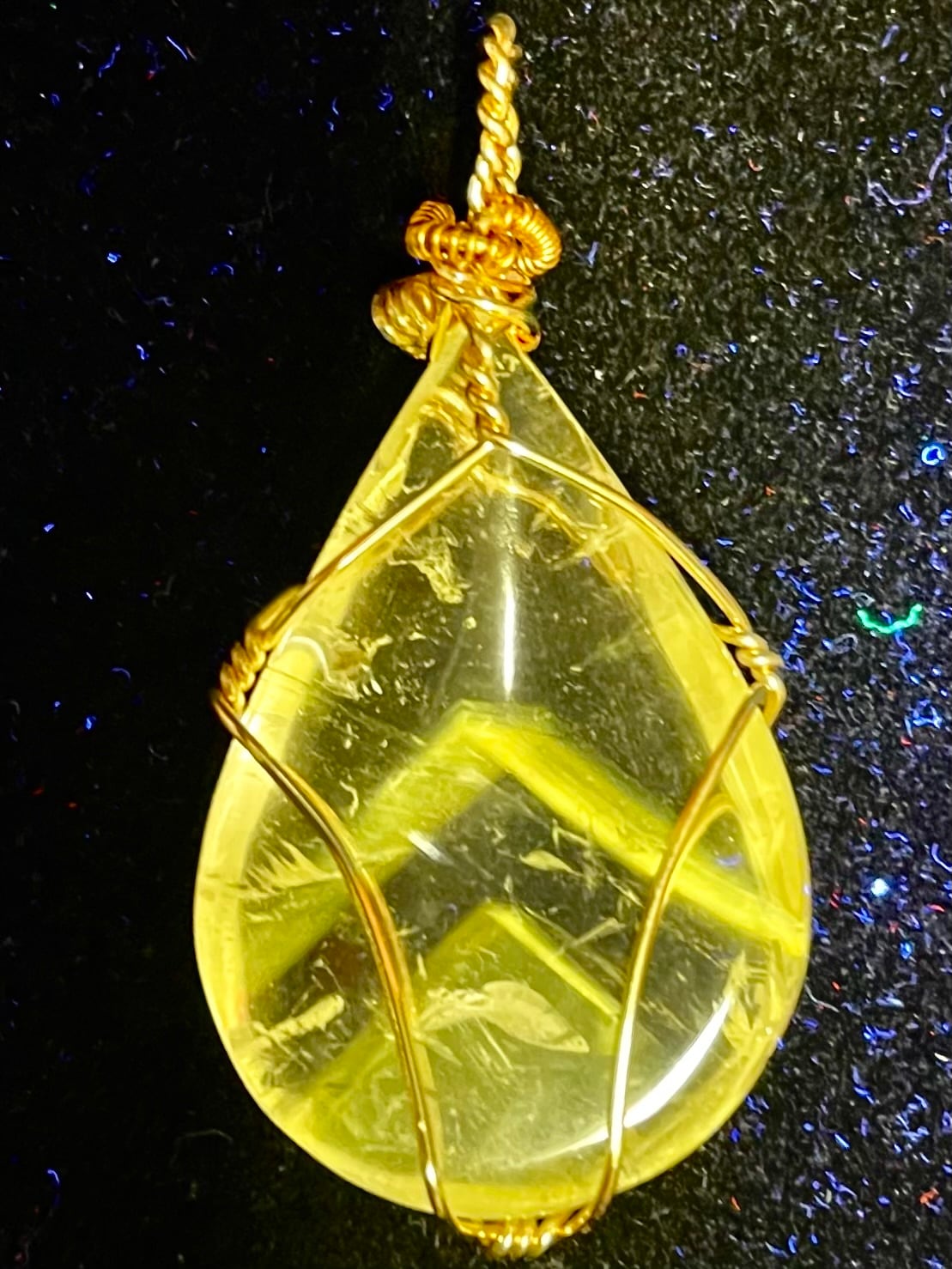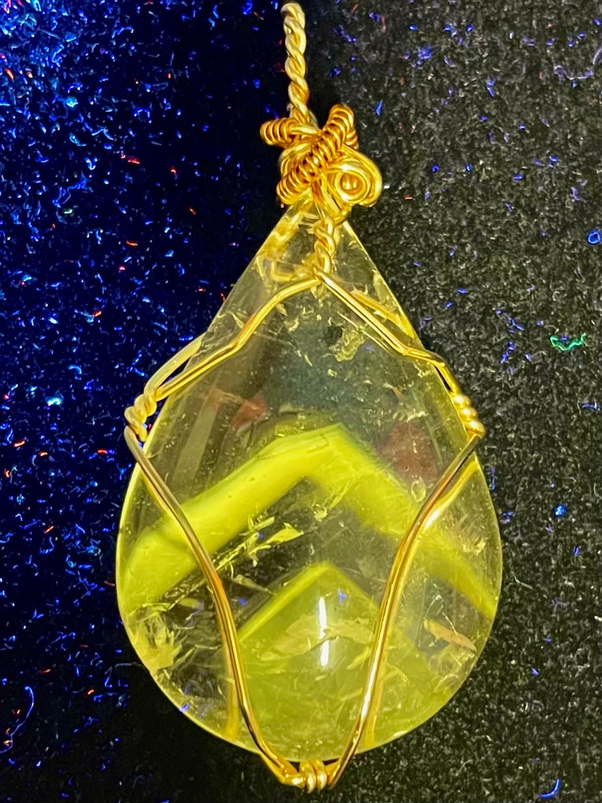 紫外線下で発光するパウエル石内包物は、この結晶の霊的意味の中核を成す。