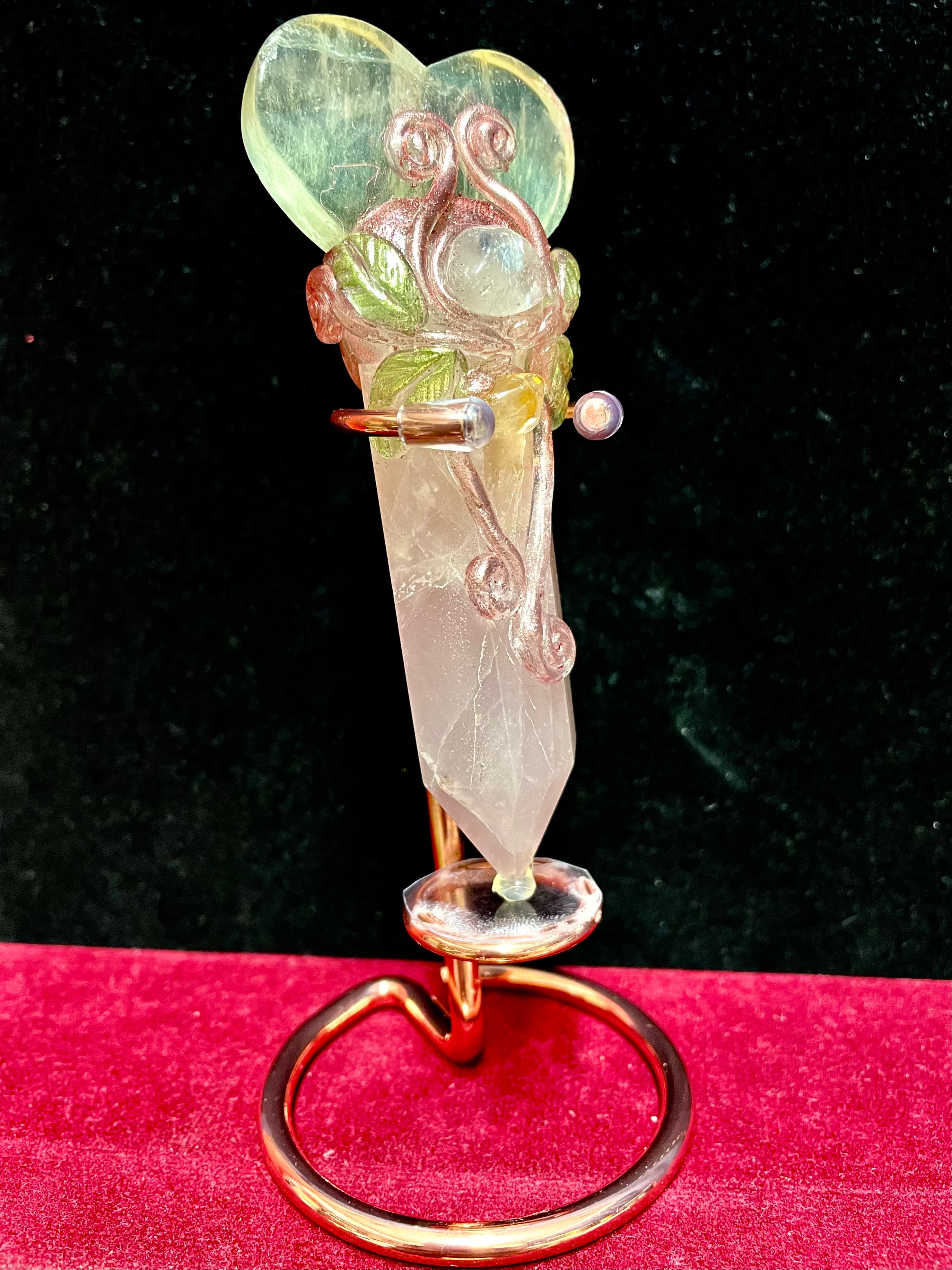 3) 愛と平和のエナジー「ローズクオーツ&ハート・フローライト」クリスタルワンドB(スタンド付き)