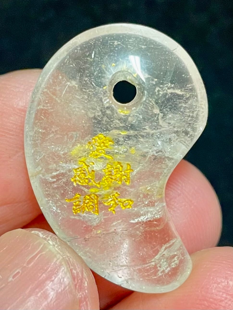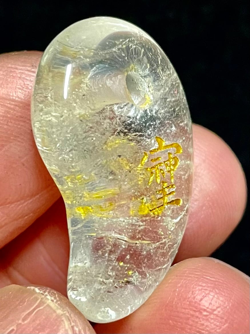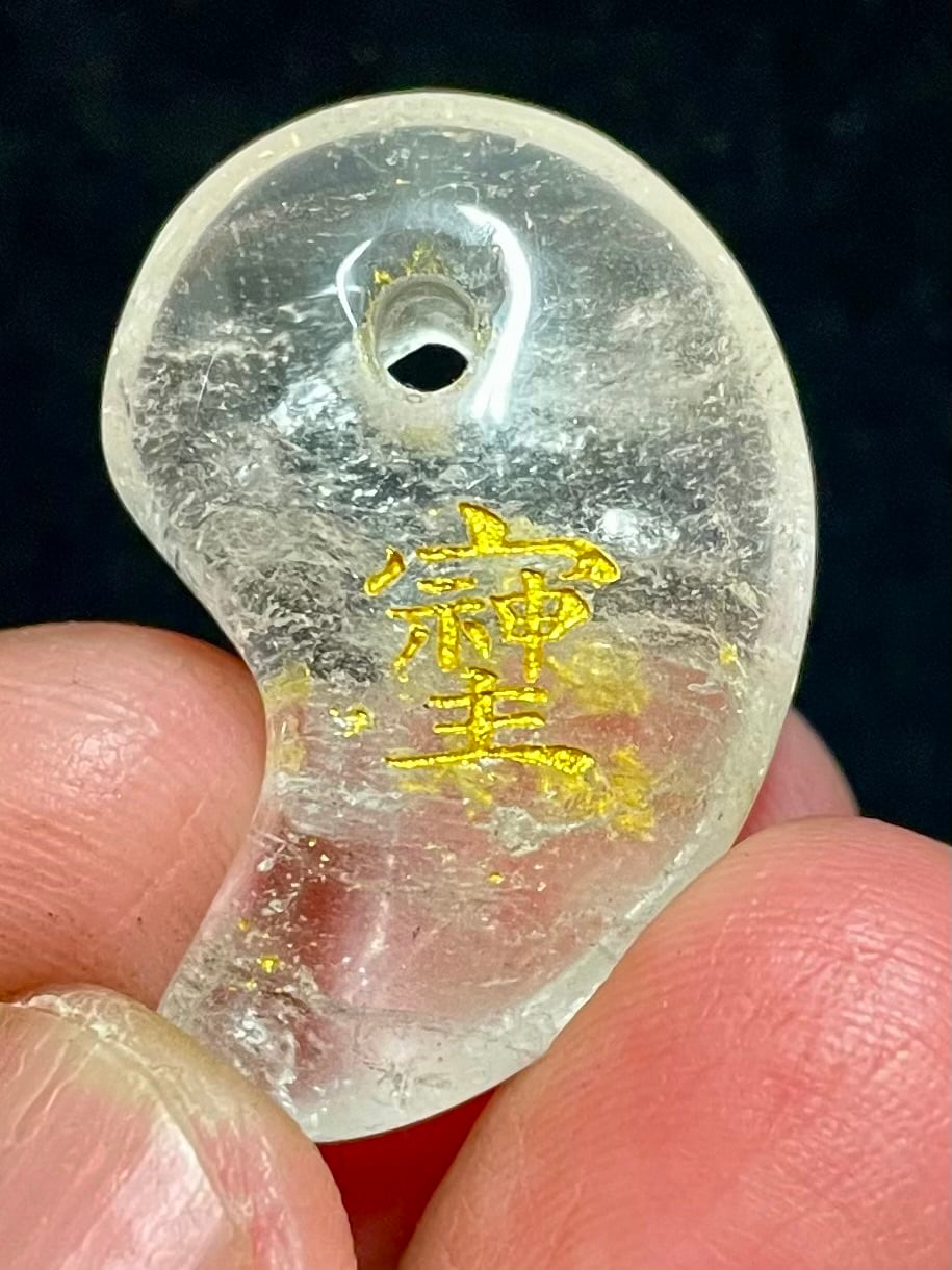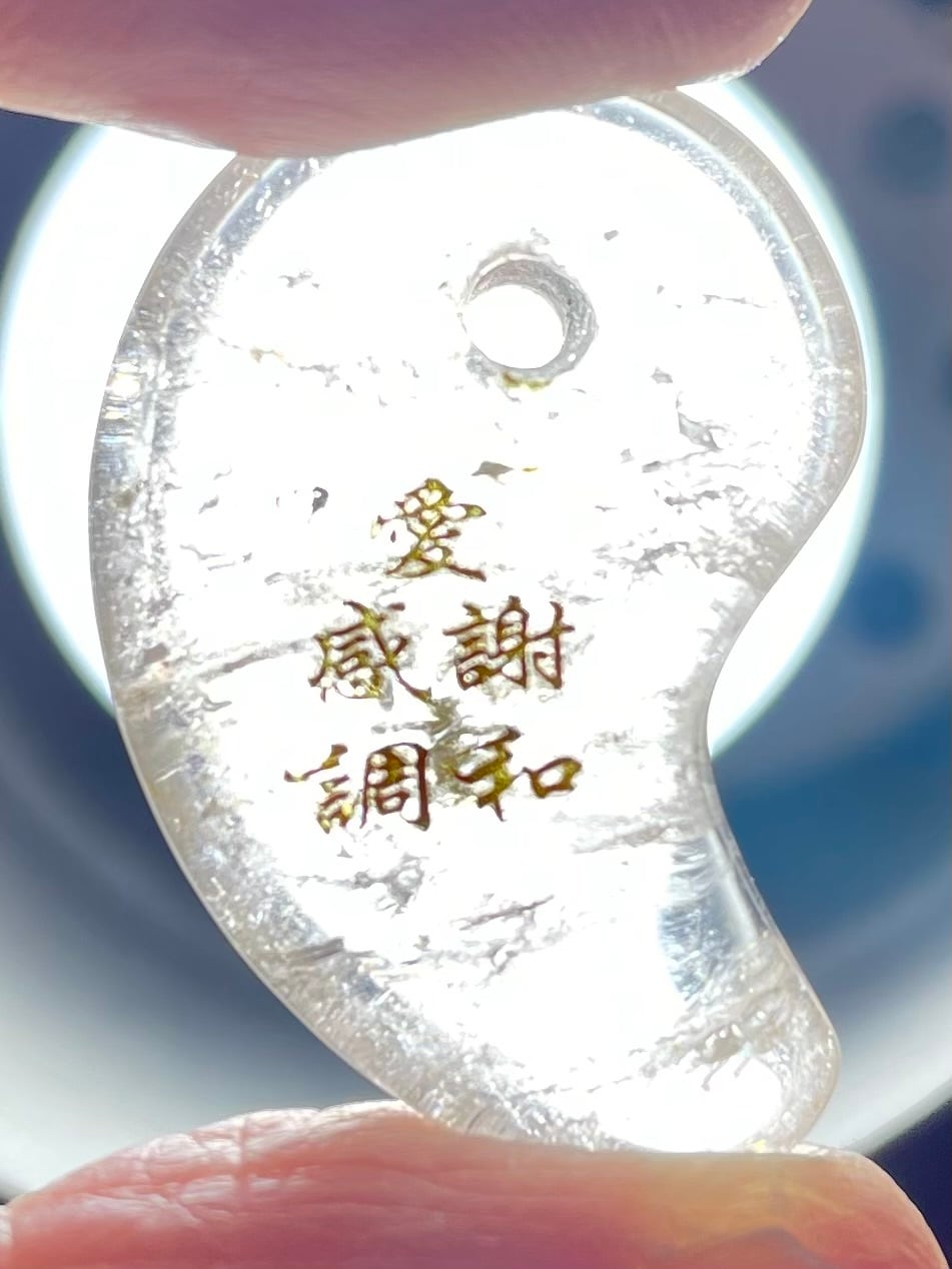 ブラジル産クオーツで作られた勾玉の表に「そしじ」の漢字、裏に「愛」「感謝」「調和」の漢字が彫刻されています。