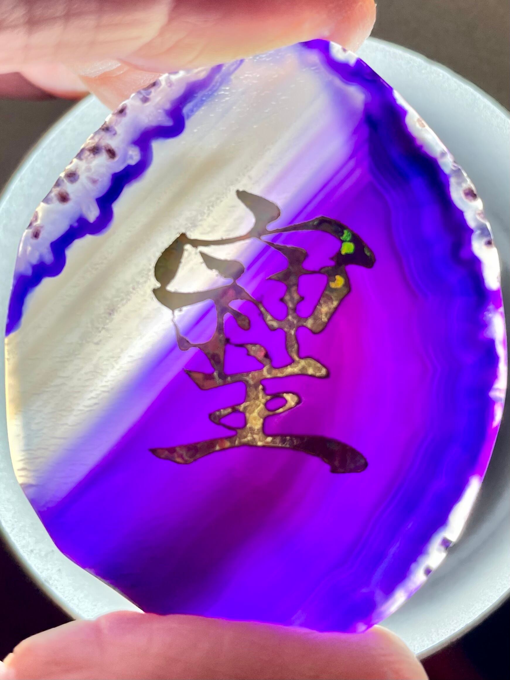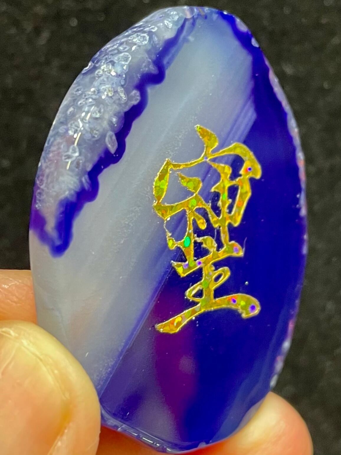 鮮やかなブラジル産アゲート(染色)に「そしじ」レインボー・ラメ入り高品質ステッカー(無防水)を貼っています。