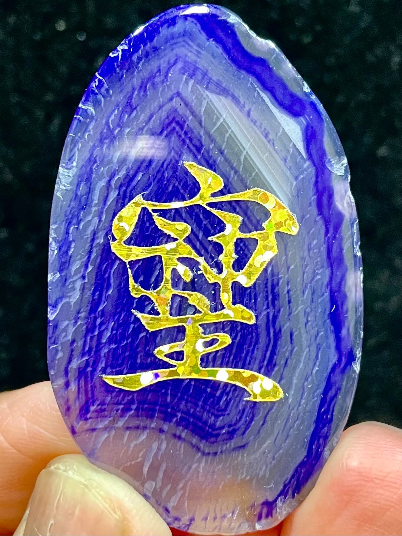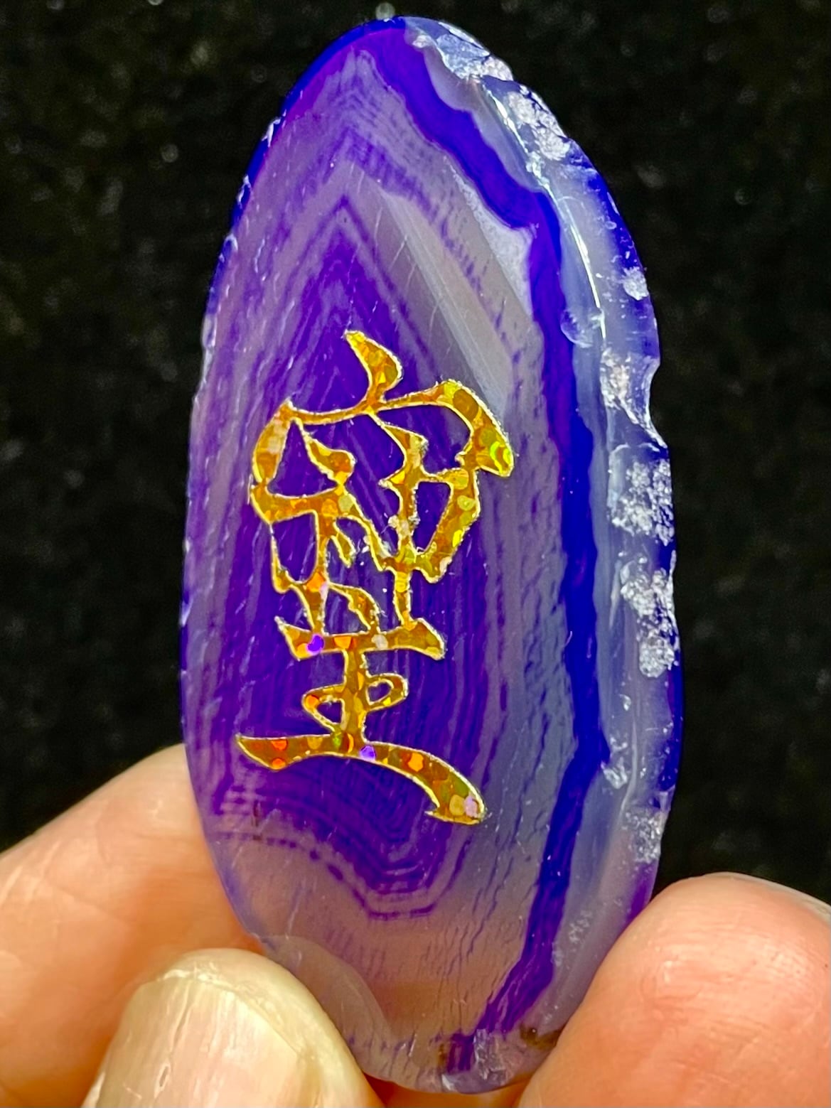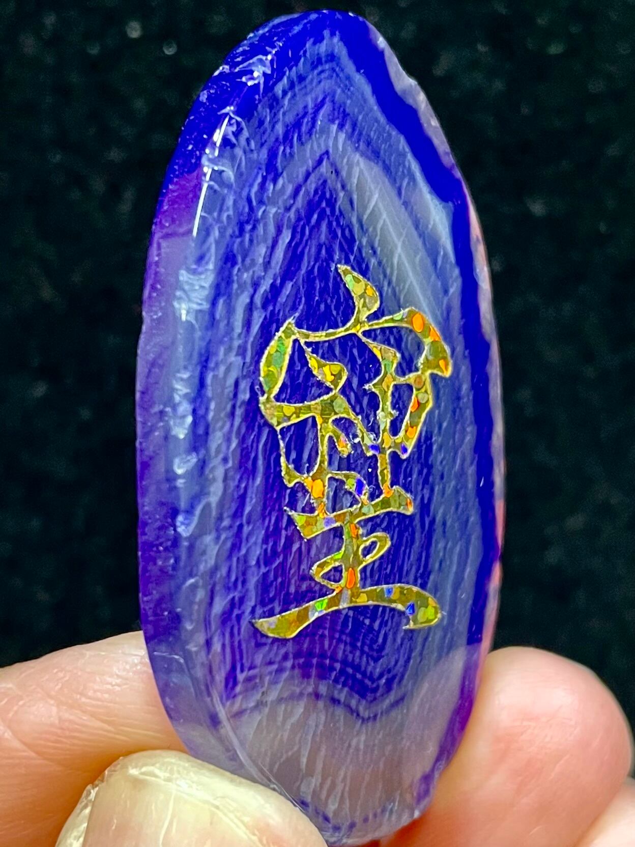 鮮やかなブラジル産アゲート(染色)に「そしじ」レインボー・ラメ入り高品質ステッカー(無防水)を貼っています。