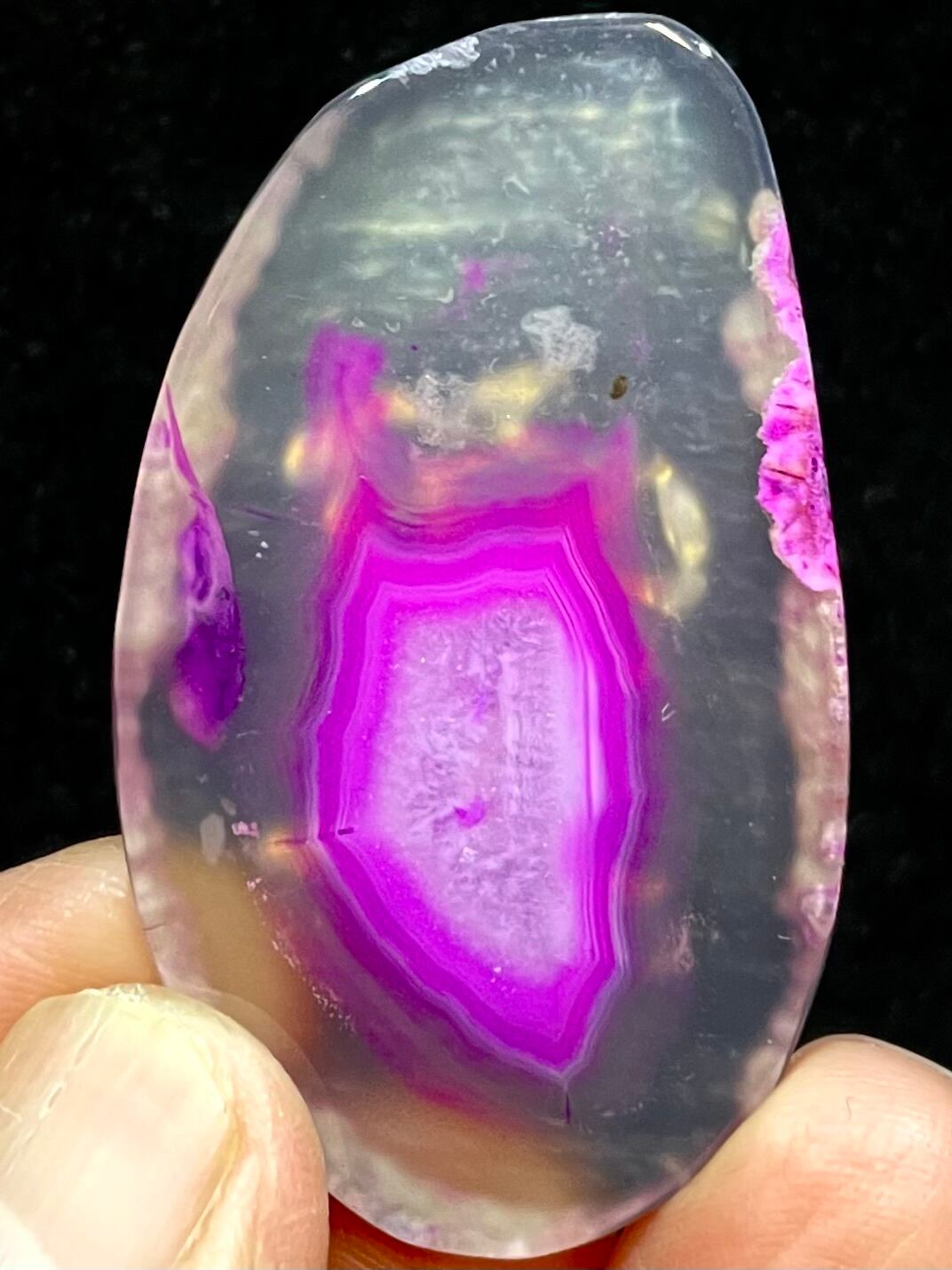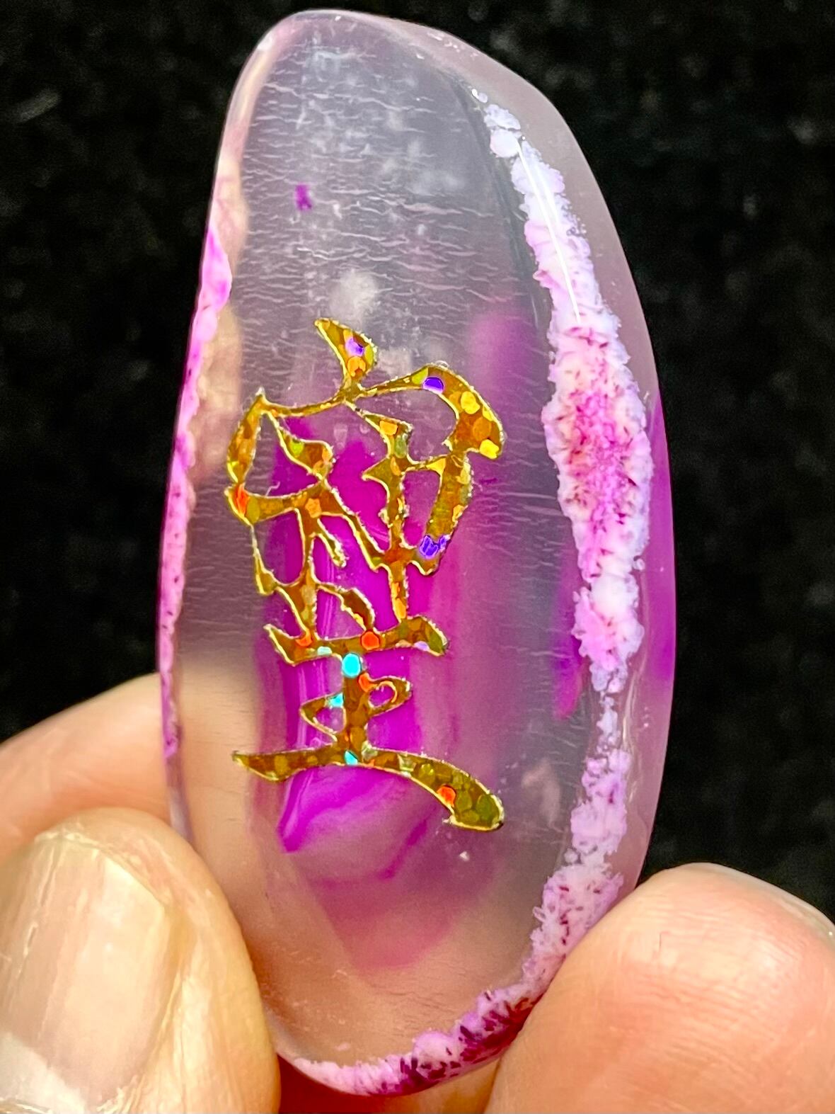 鮮やかなブラジル産アゲート(染色)に「そしじ」レインボー・ラメ入り高品質ステッカー(無防水)を貼っています。