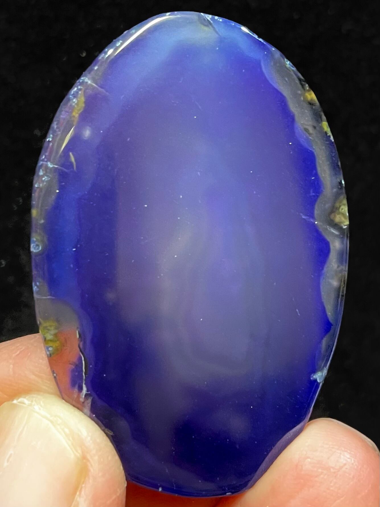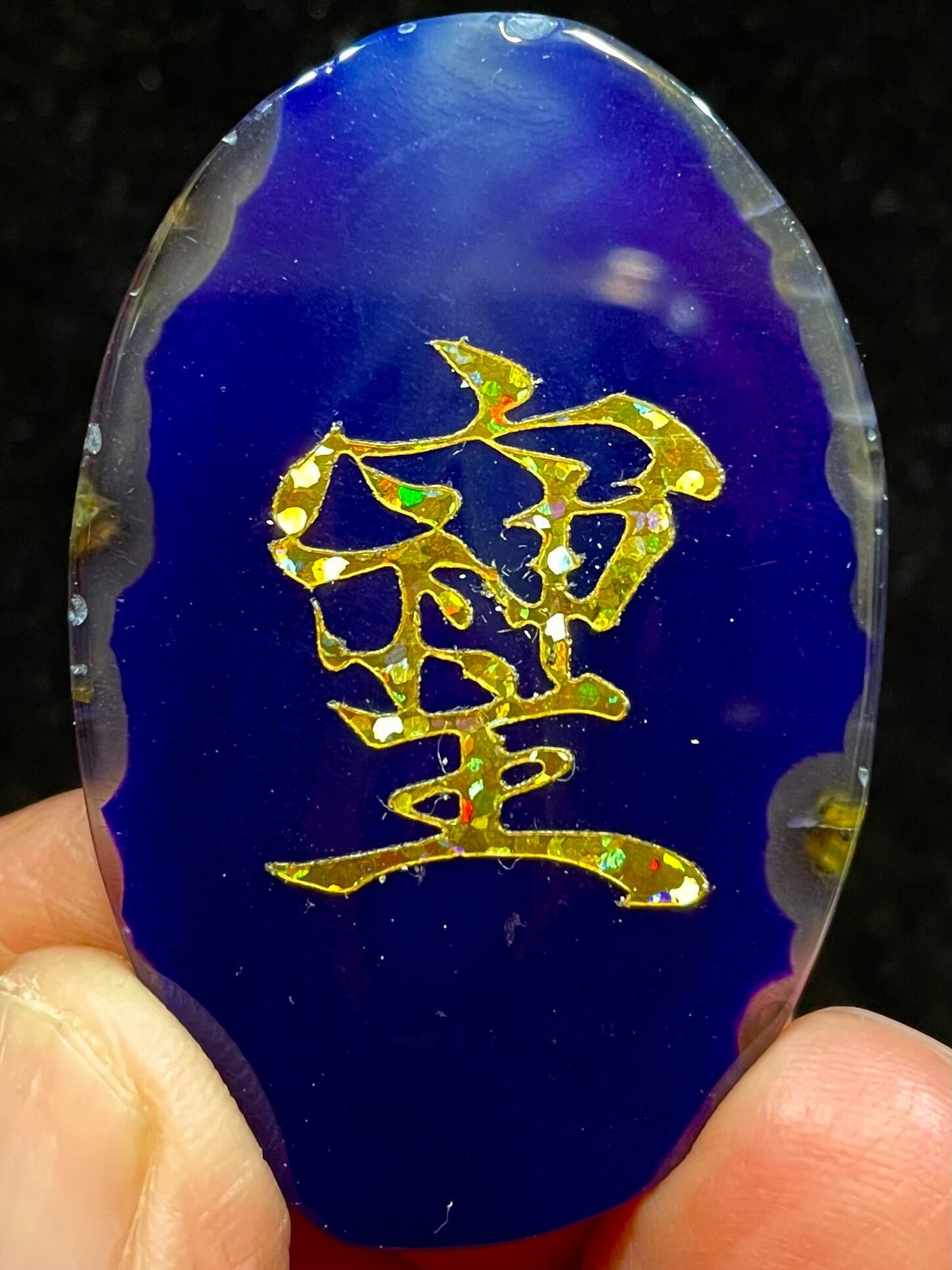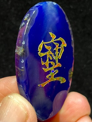 鮮やかなブラジル産アゲート(染色)に「そしじ」レインボー・ラメ入り高品質ステッカー(無防水)を貼っています。