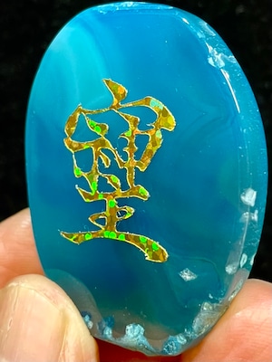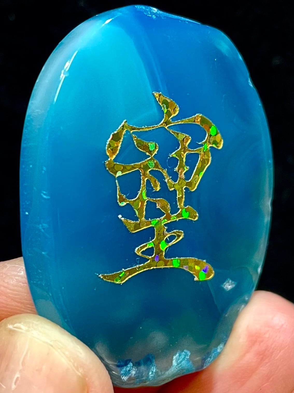 鮮やかなブラジル産アゲート(染色)に「そしじ」レインボー・ラメ入り高品質ステッカー(無防水)を貼っています。