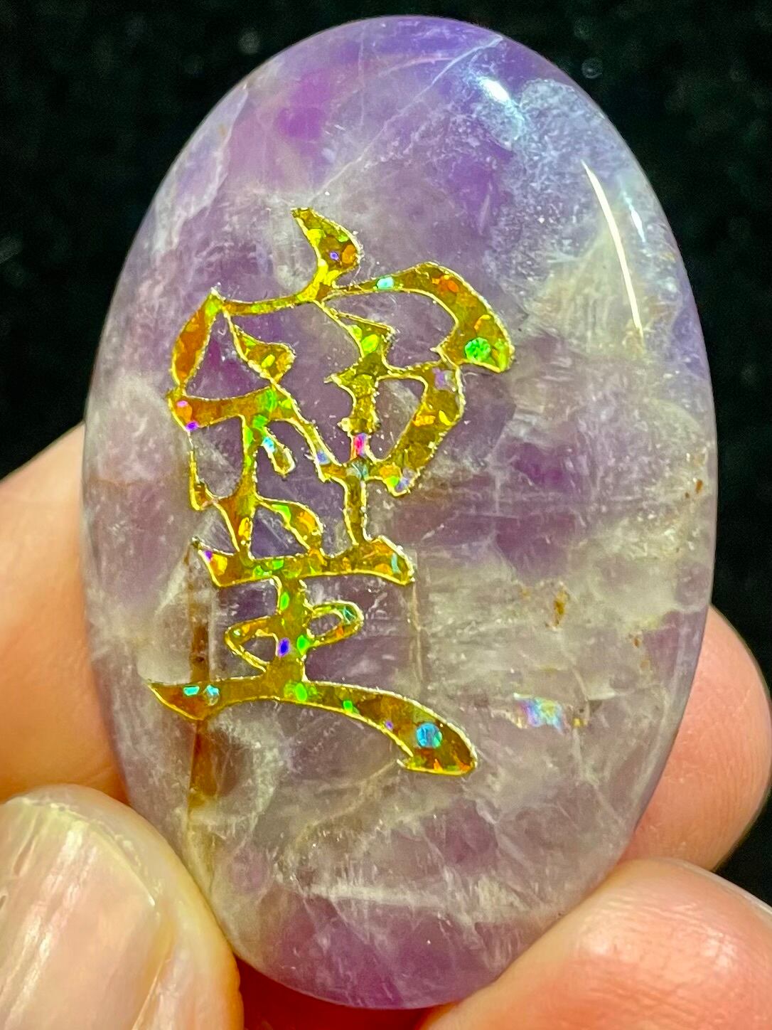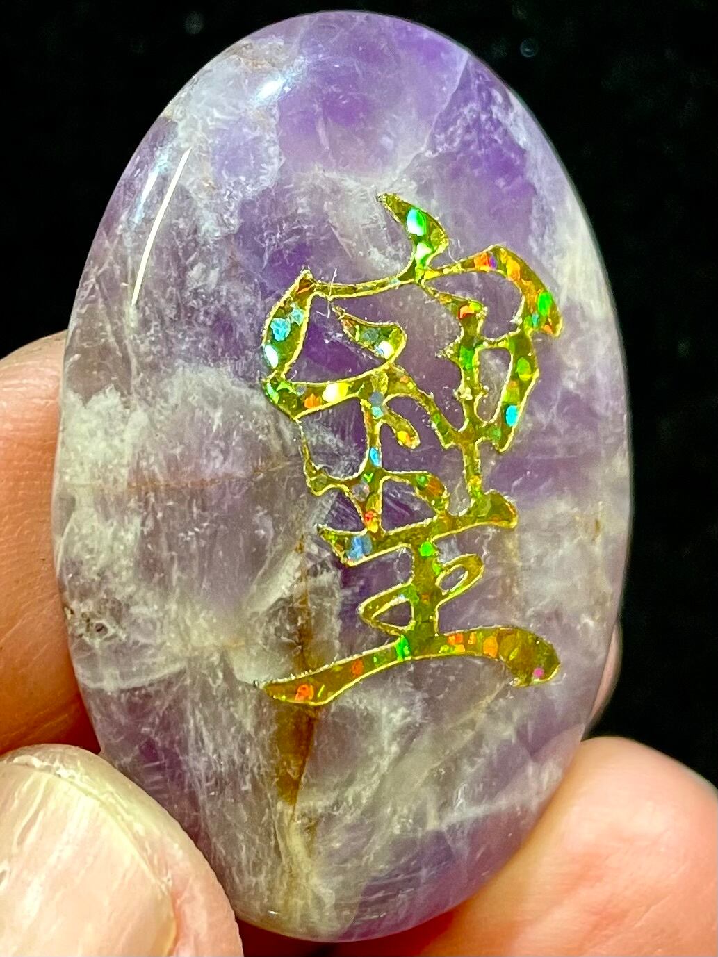 鮮やかなブラジル産アメジストに「そしじ」レインボー・ラメ入り高品質ステッカー(無防水)を貼っています。