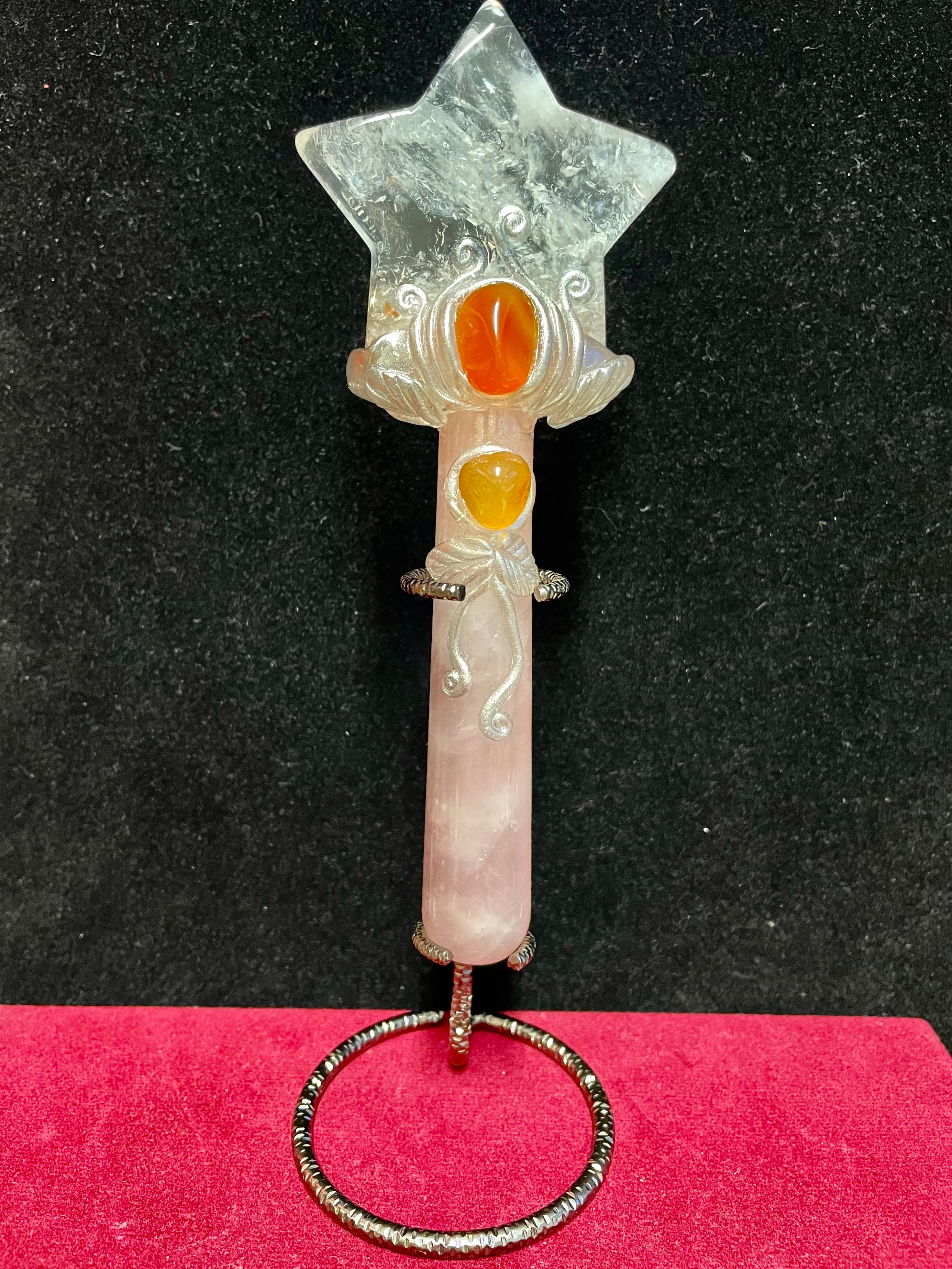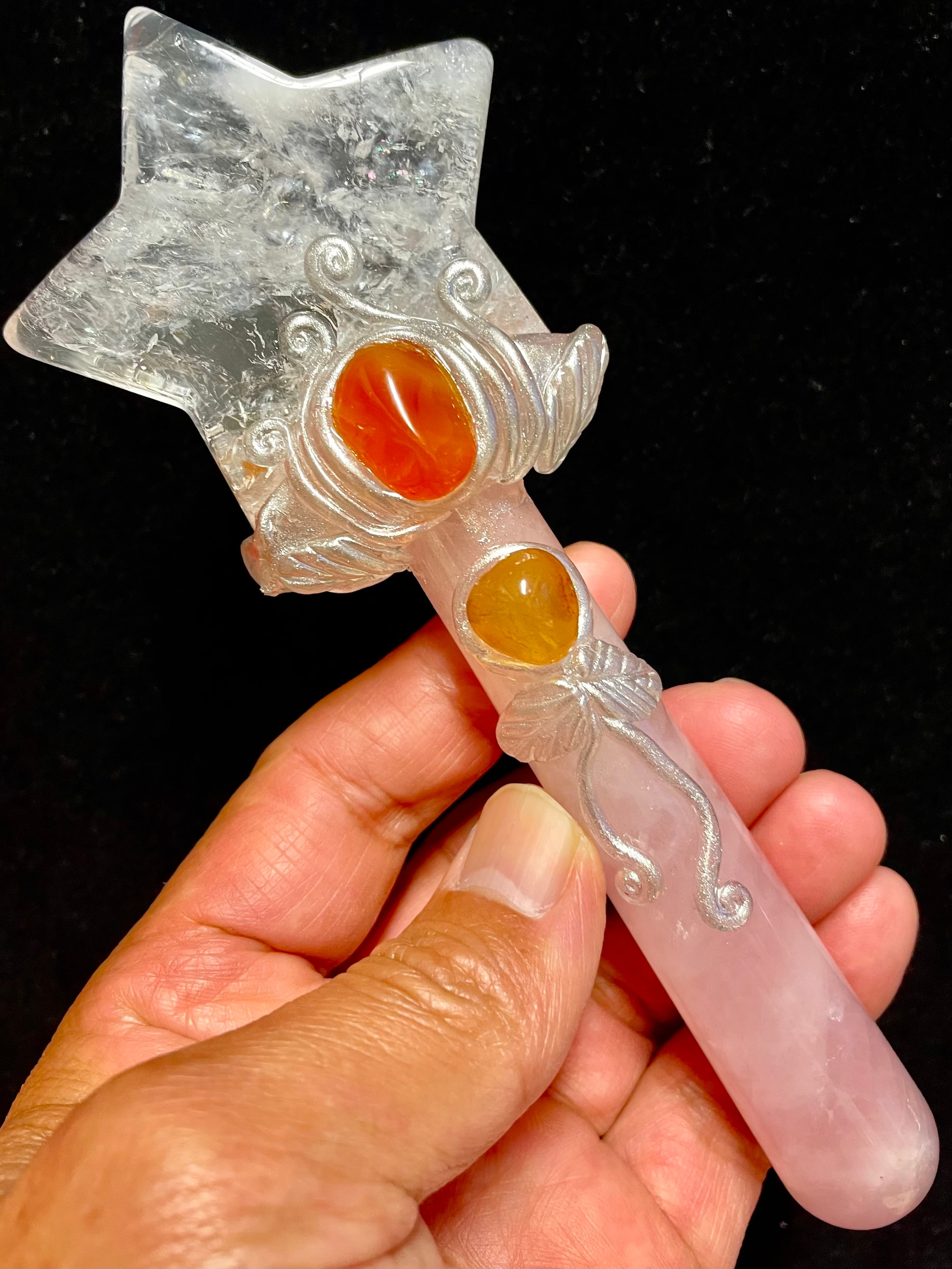 クオーツ、ローズクオーツ、カーネリアン等を活用したハンドメイドの「クリスタルワンド」です。