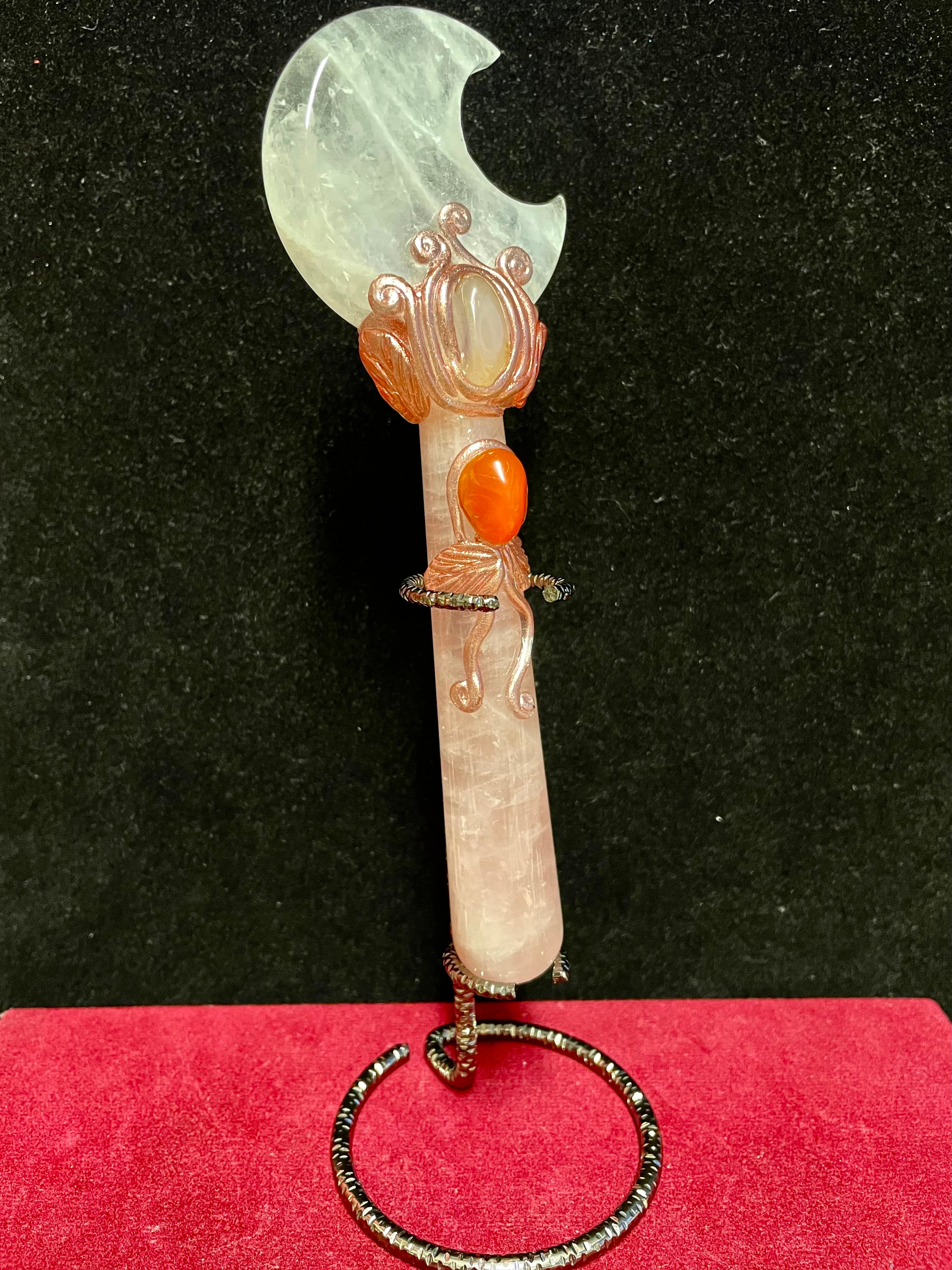 クオーツ、ローズクオーツ、カーネリアン等を活用したハンドメイドの「クリスタルワンド」です。