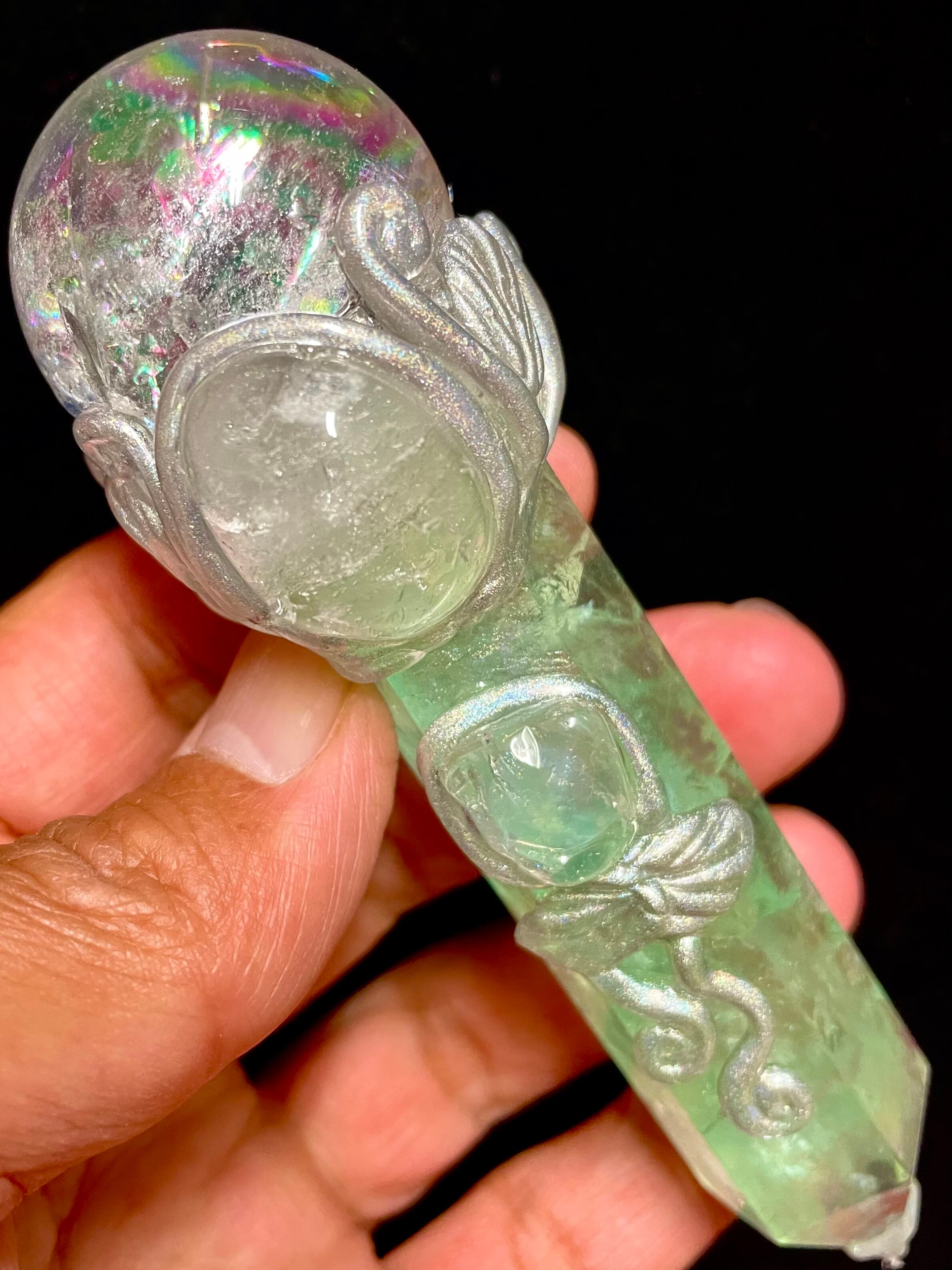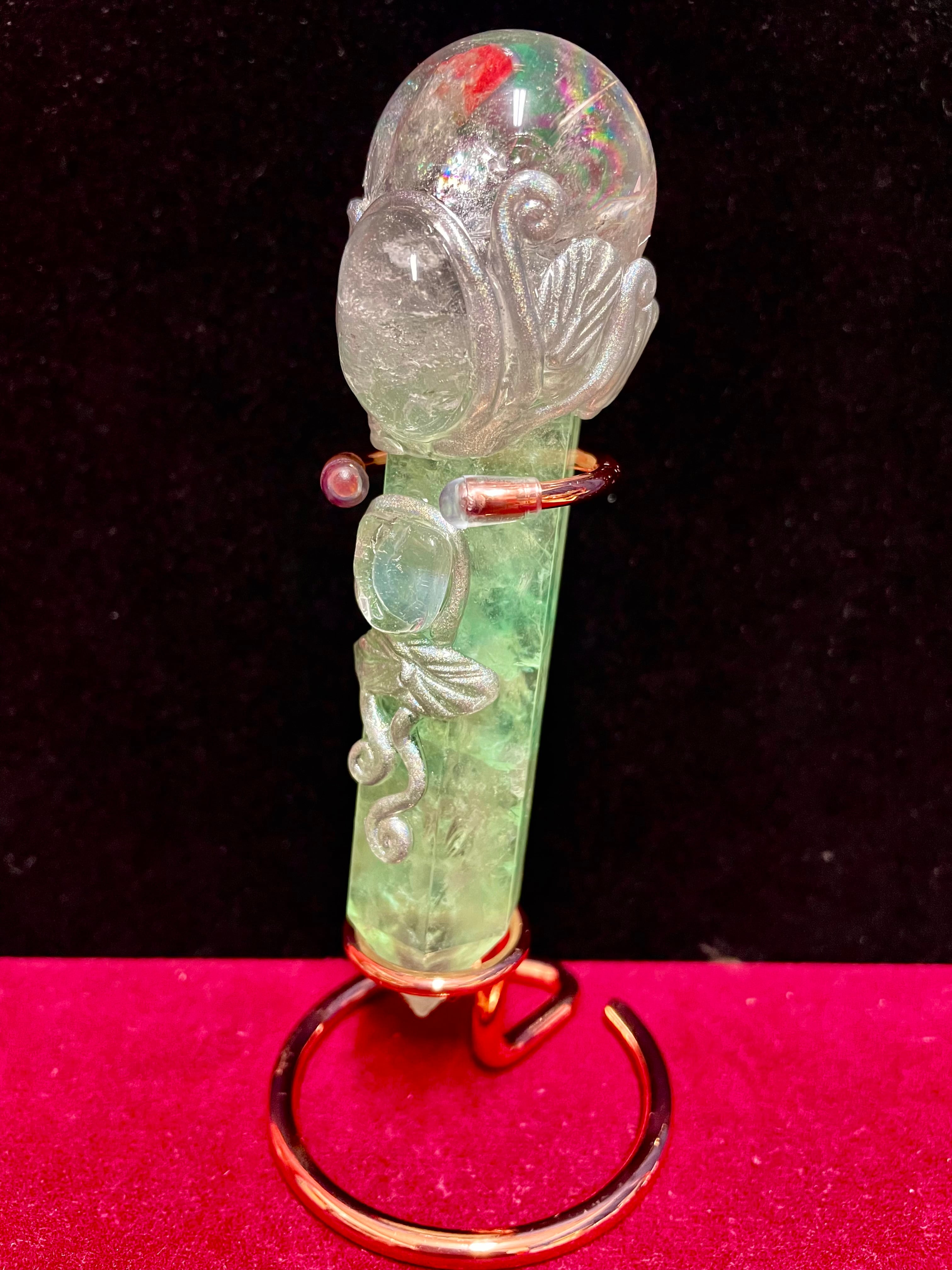 フローライト、天然アイリスクオーツ等を活用したハンドメイドの「クリスタルワンド」です。