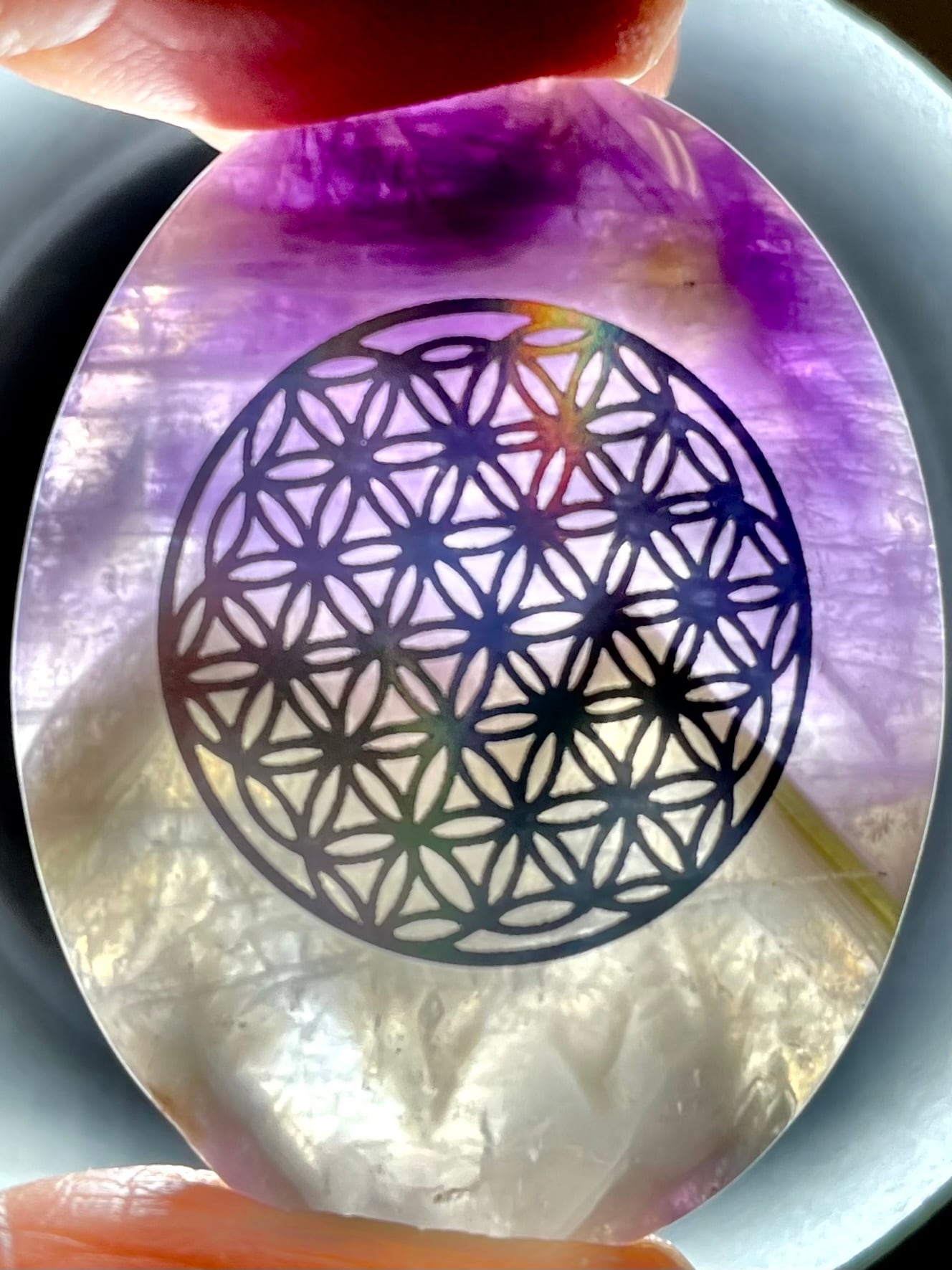 ブラジル産アメジストに「フラワーオブライフ」のラメ入りシールを貼っています。