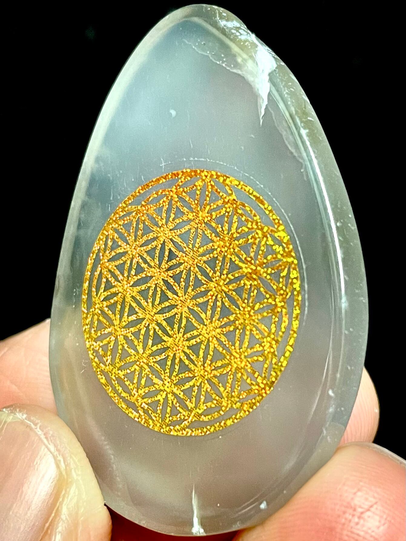 ブラジル産アゲートに「フラワーオブライフ」のラメ入りシールを貼っています。