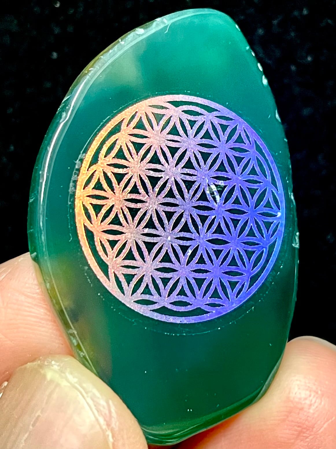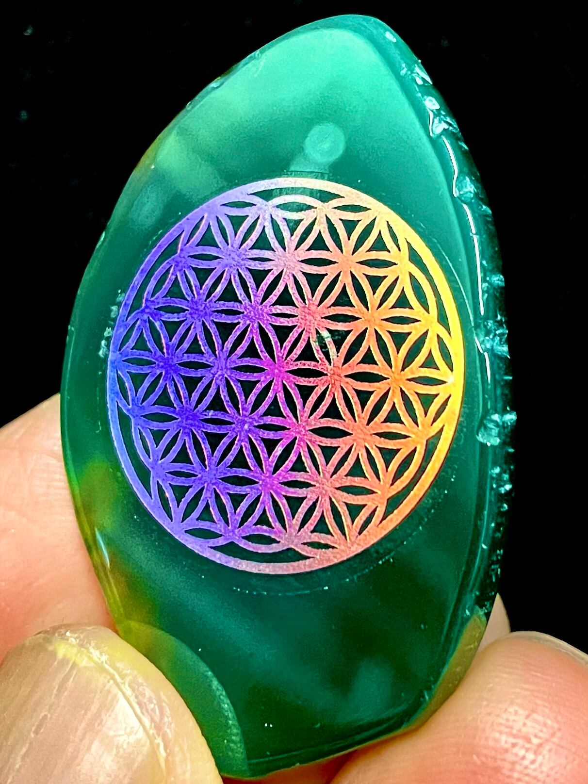 ブラジル産アゲートに「フラワーオブライフ」のラメ入りシールを貼っています。