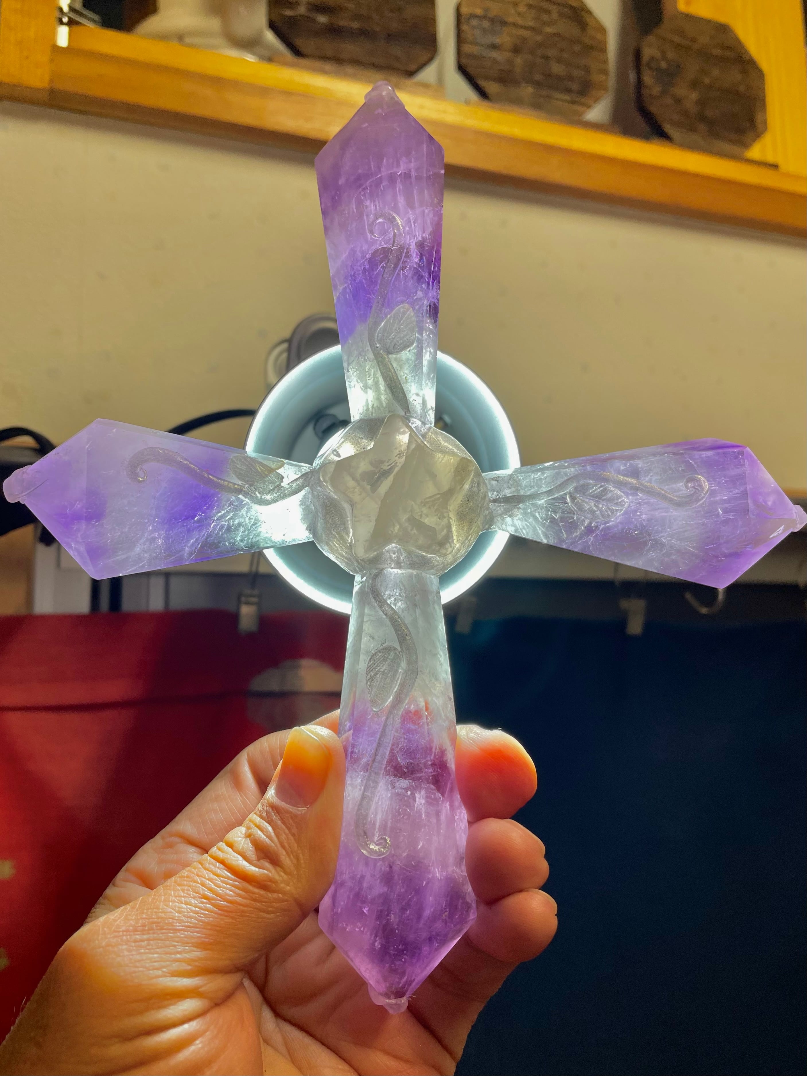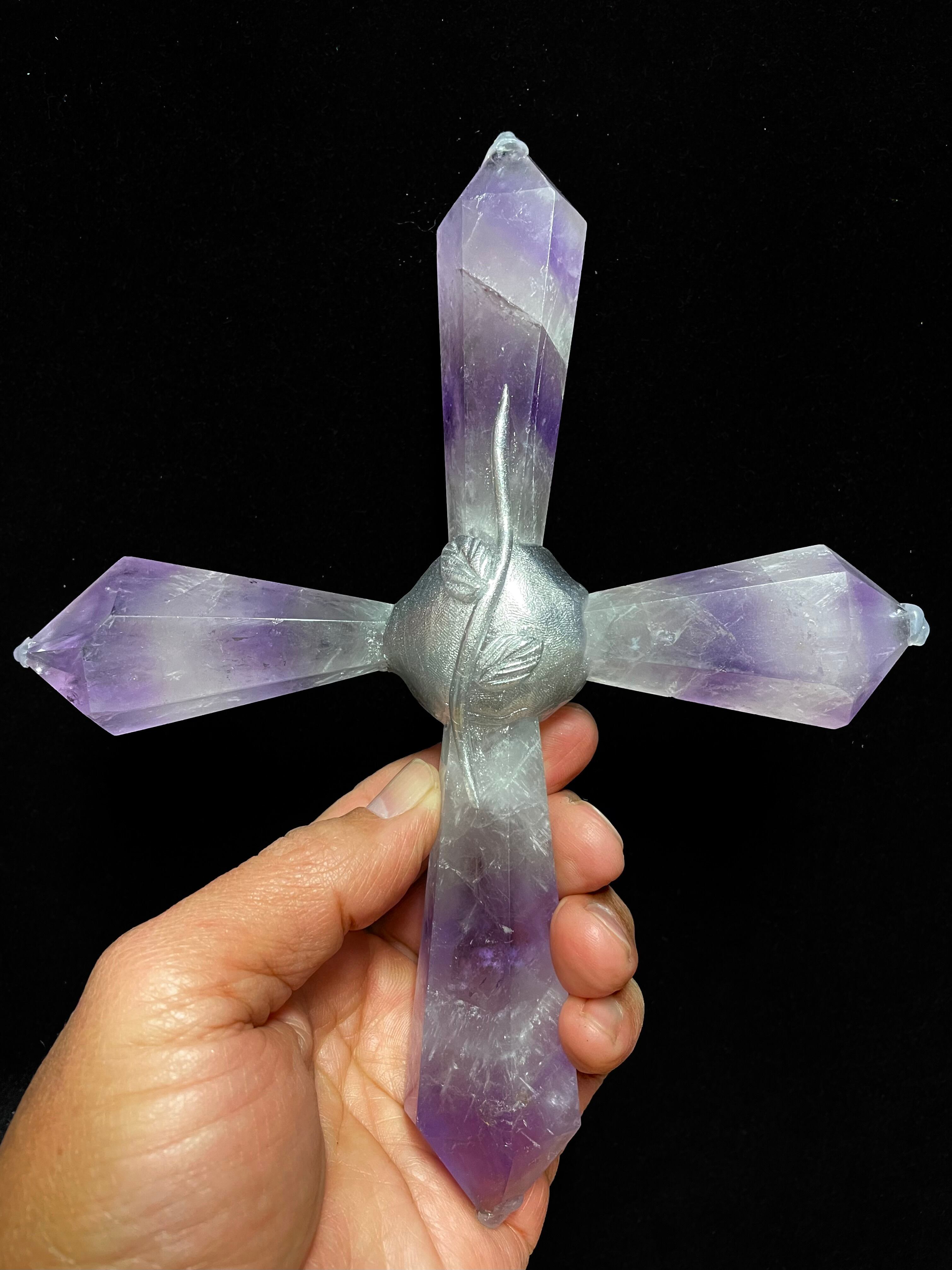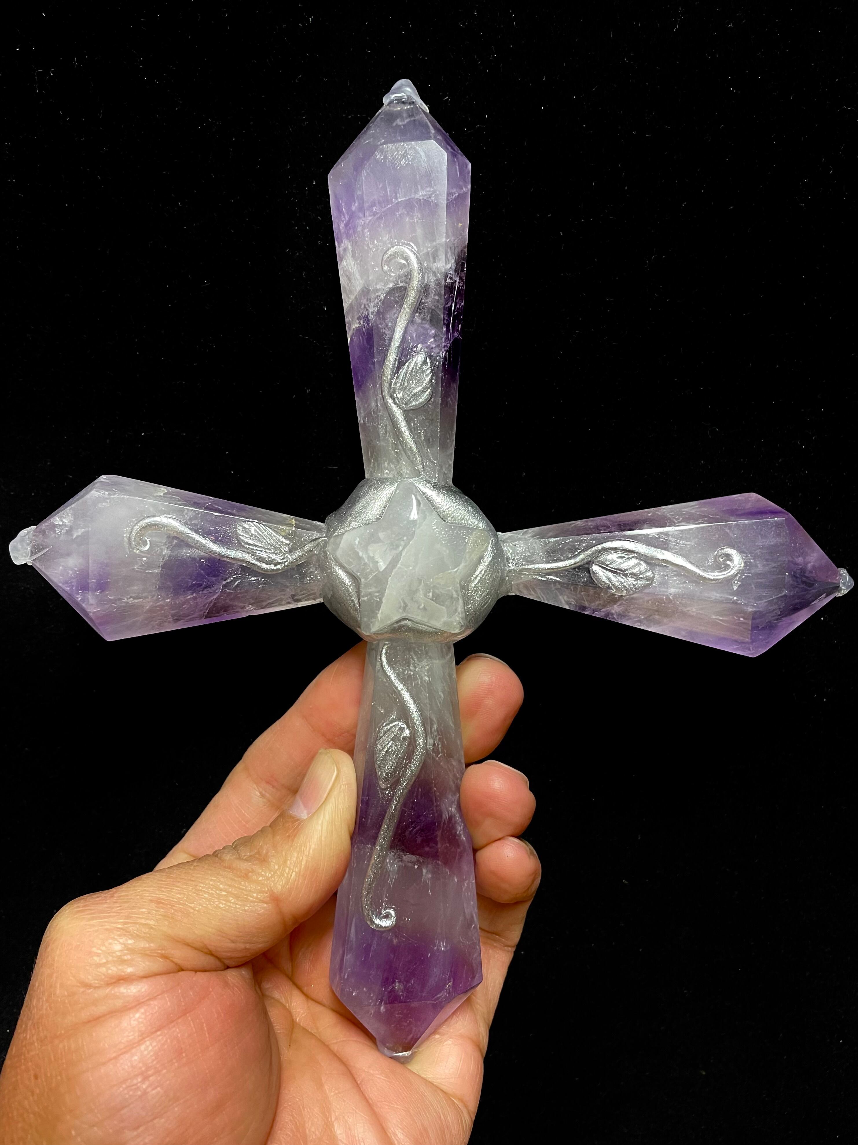 美しいアメジストを使用したハンドメイドのアート・クリスタルワンド「クロス」。