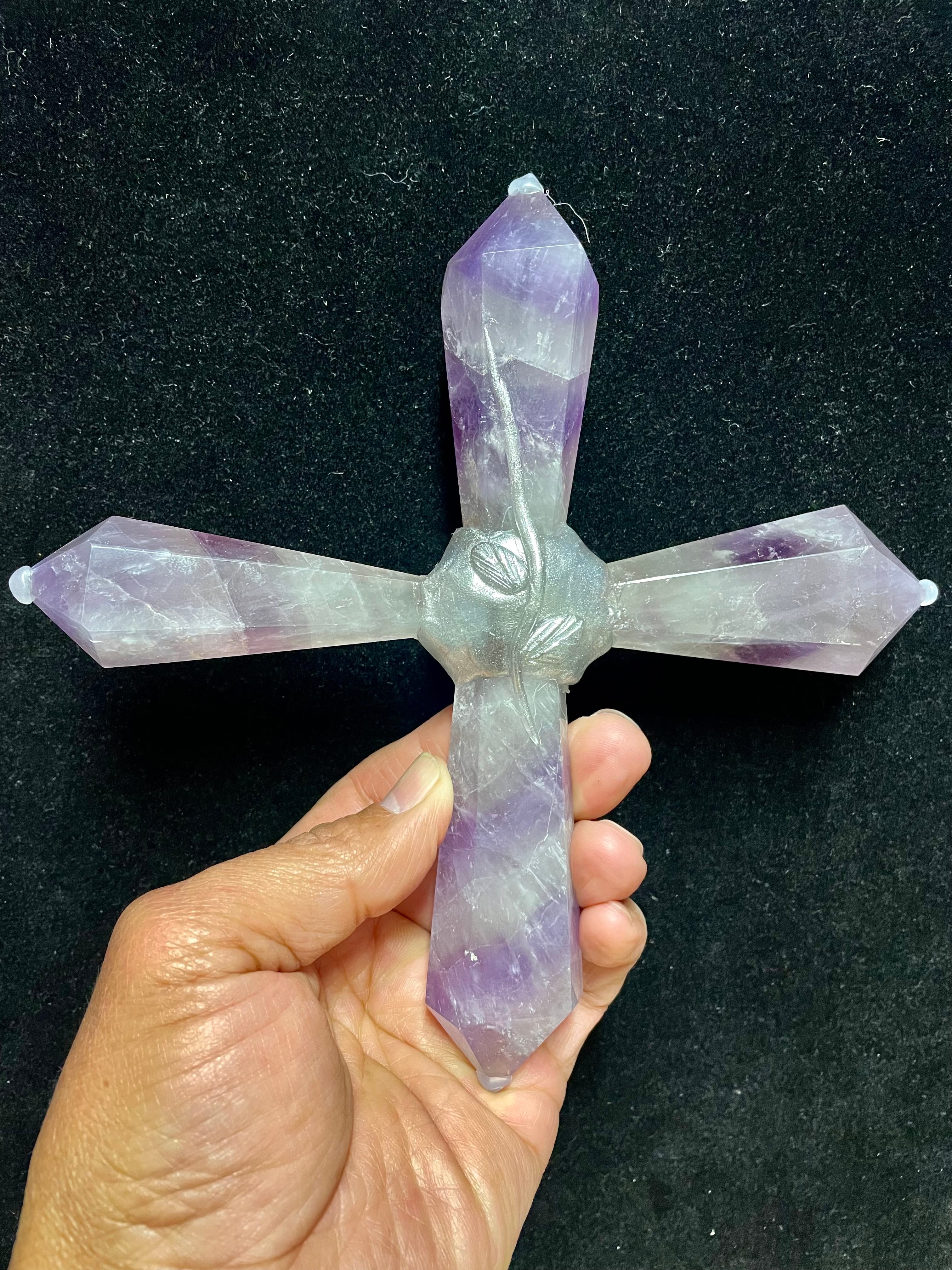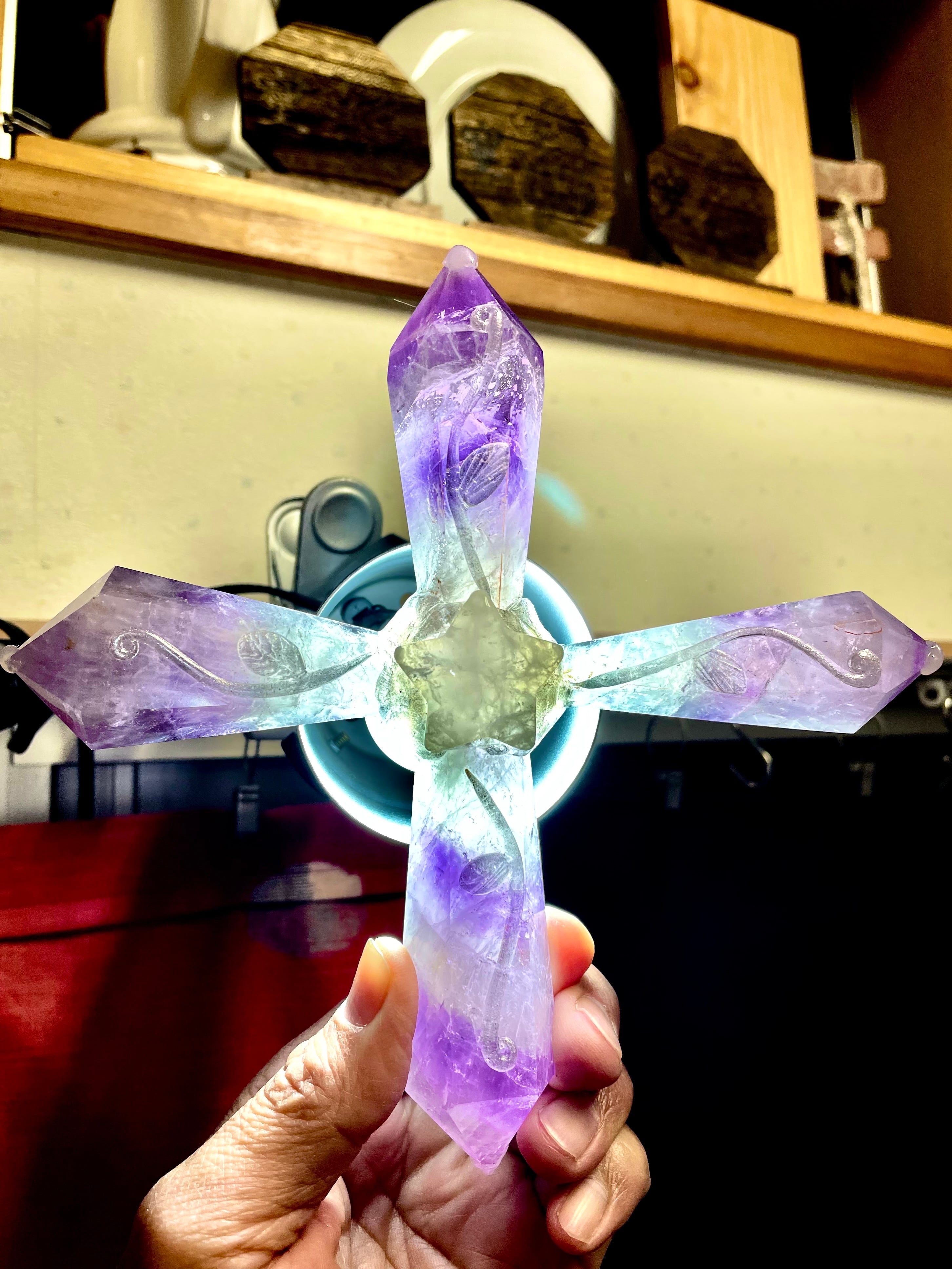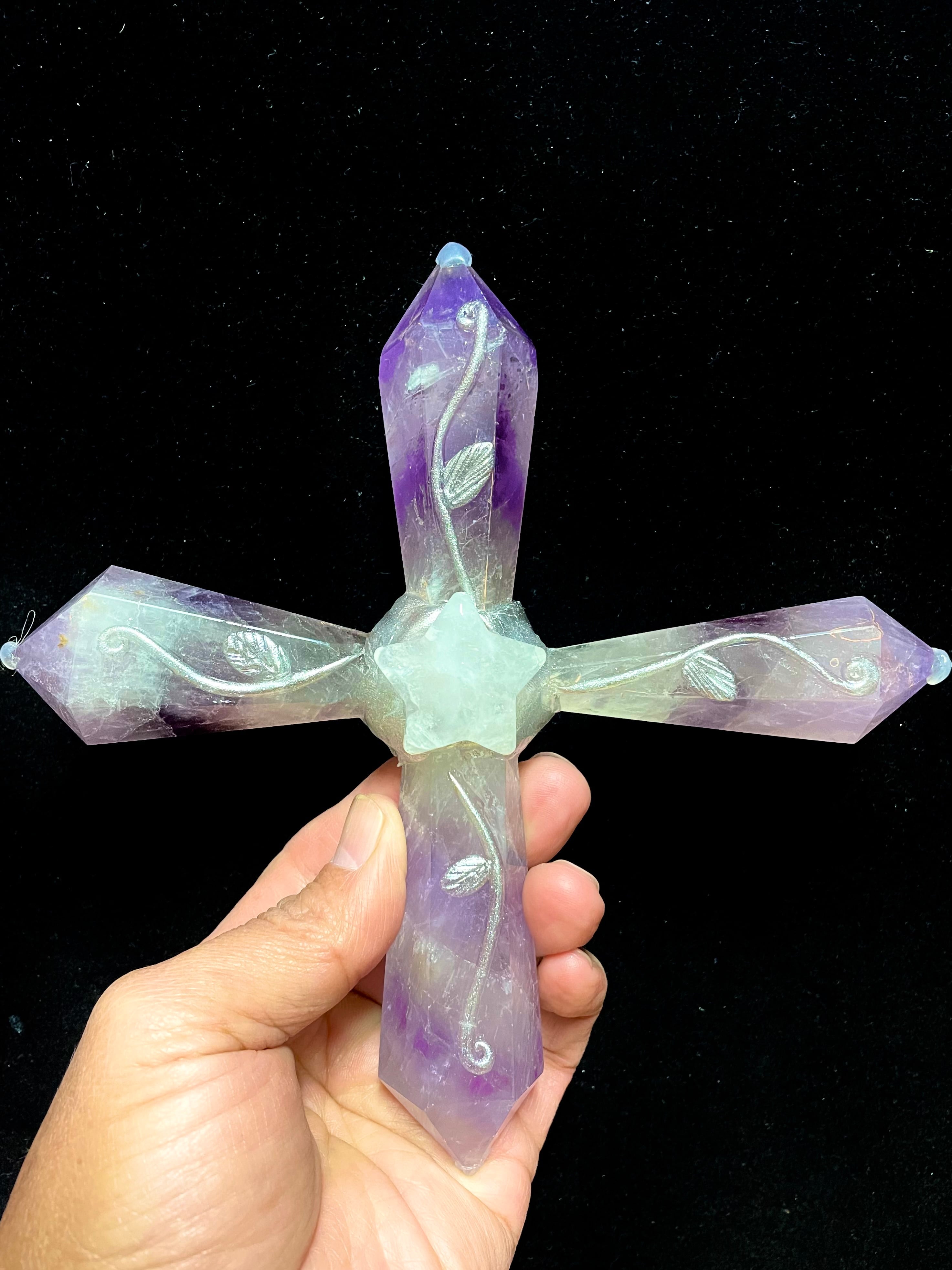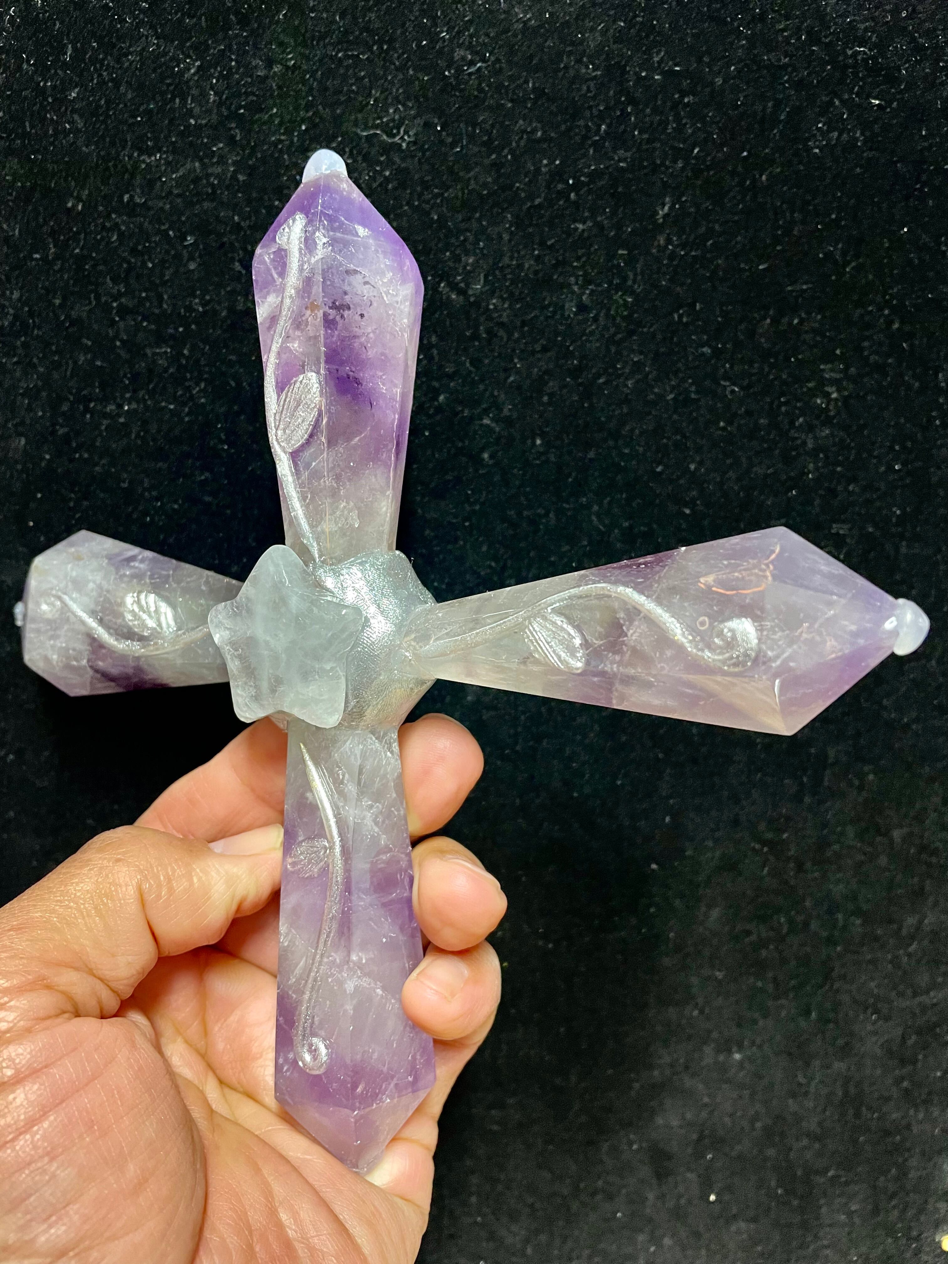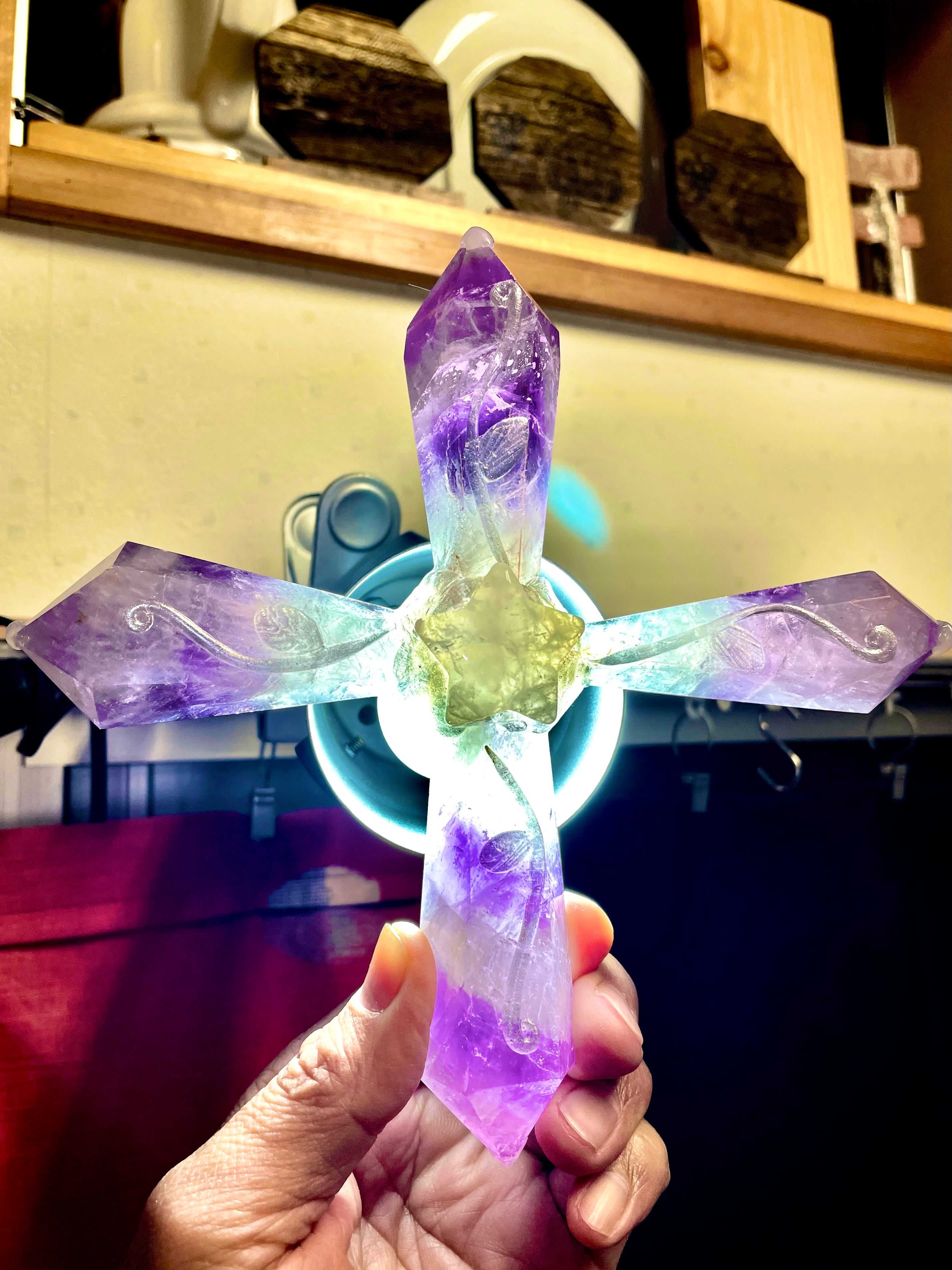 美しいアメジストを使用したハンドメイドのアート・クリスタルワンド「クロス」。