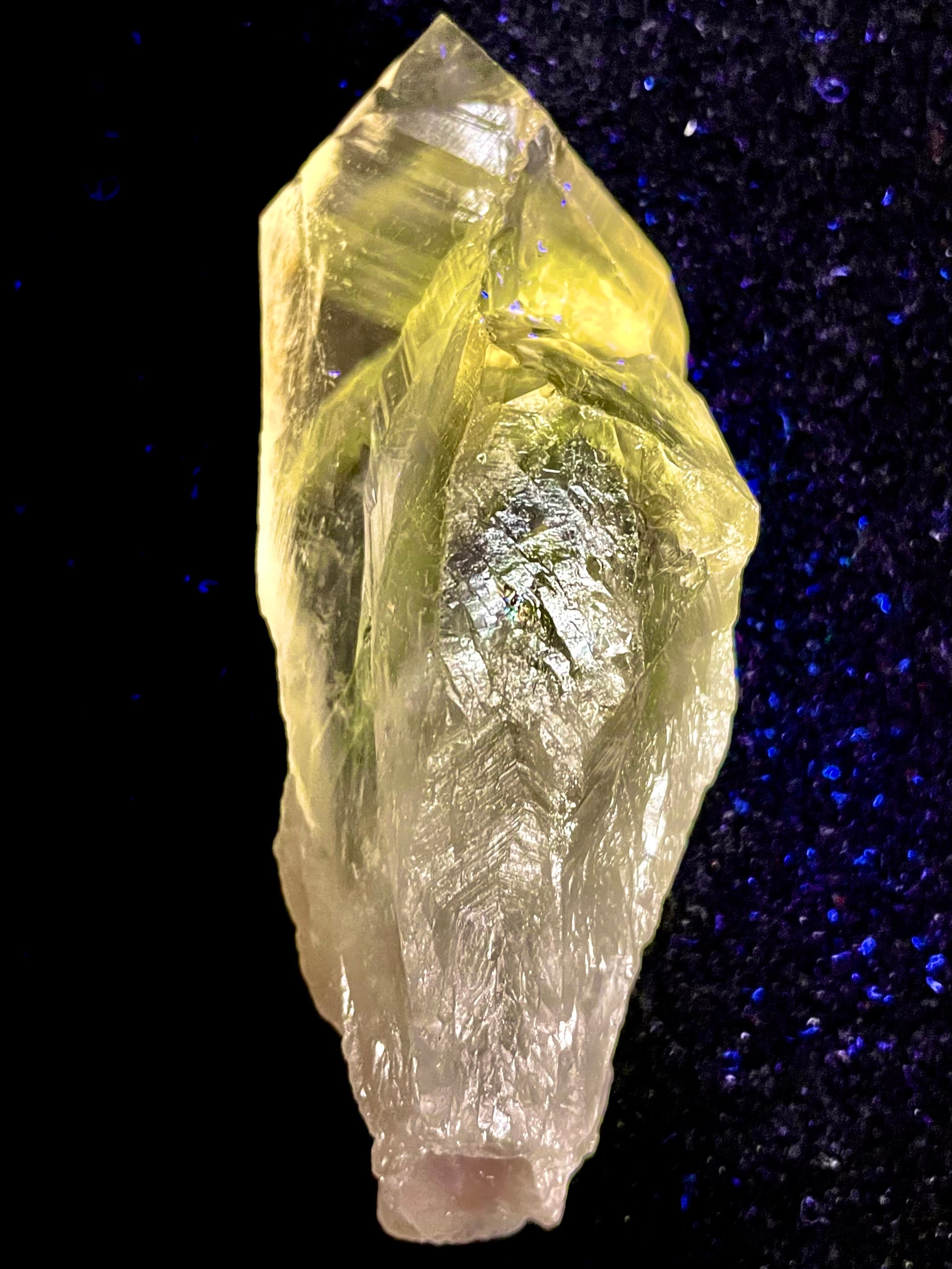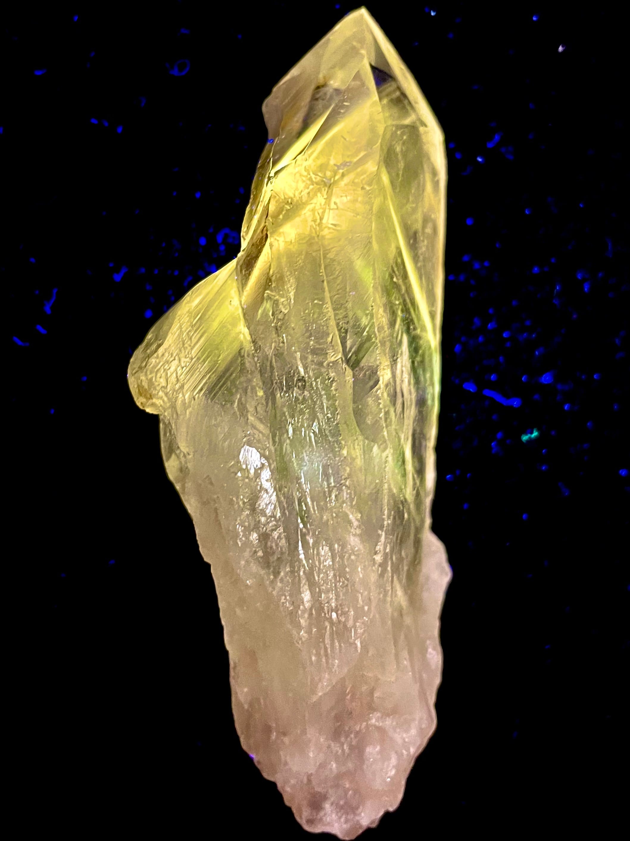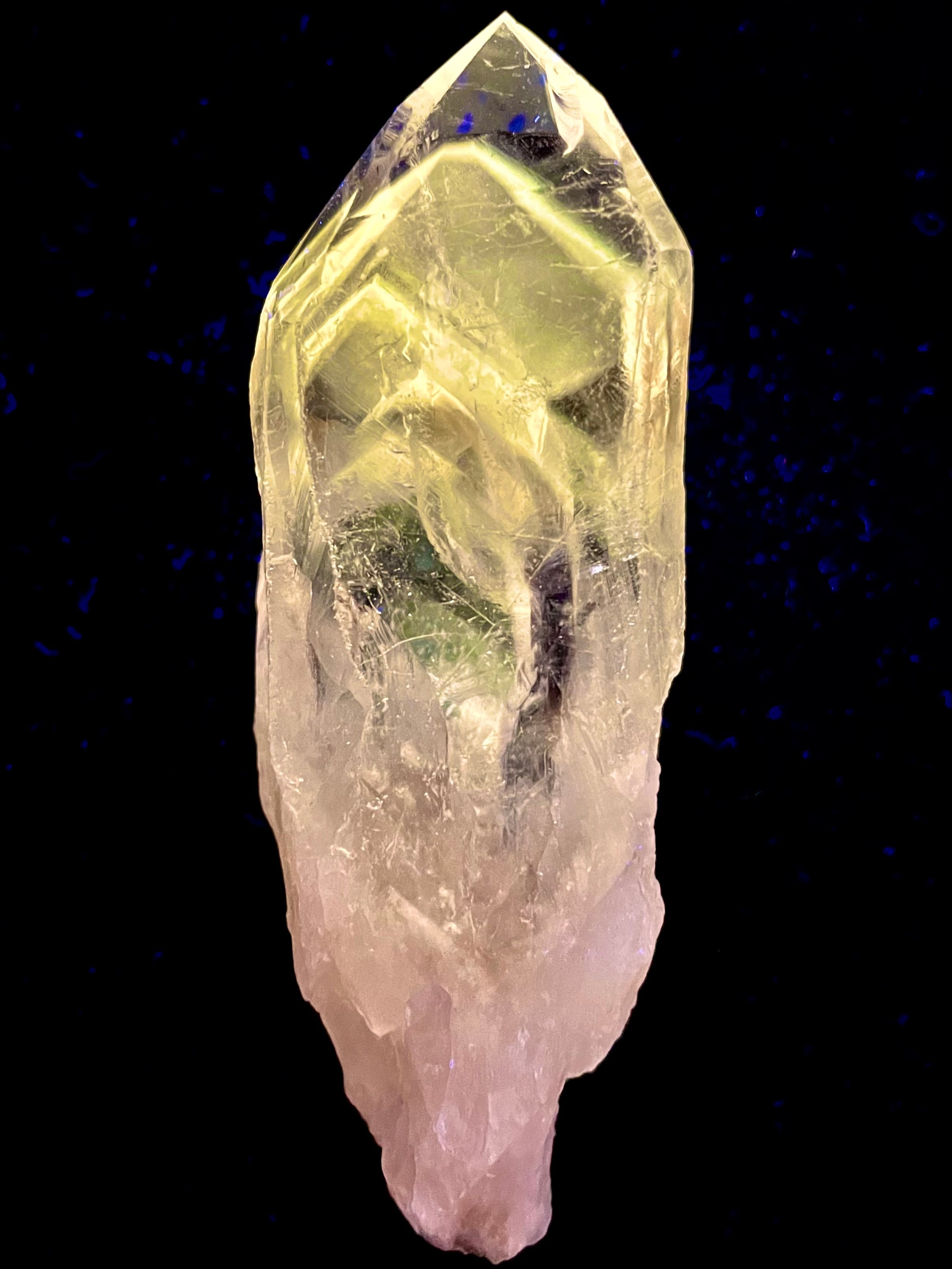 紫外線下で発光するパウエル石内包物は、この結晶の霊的意味の中核を成す。