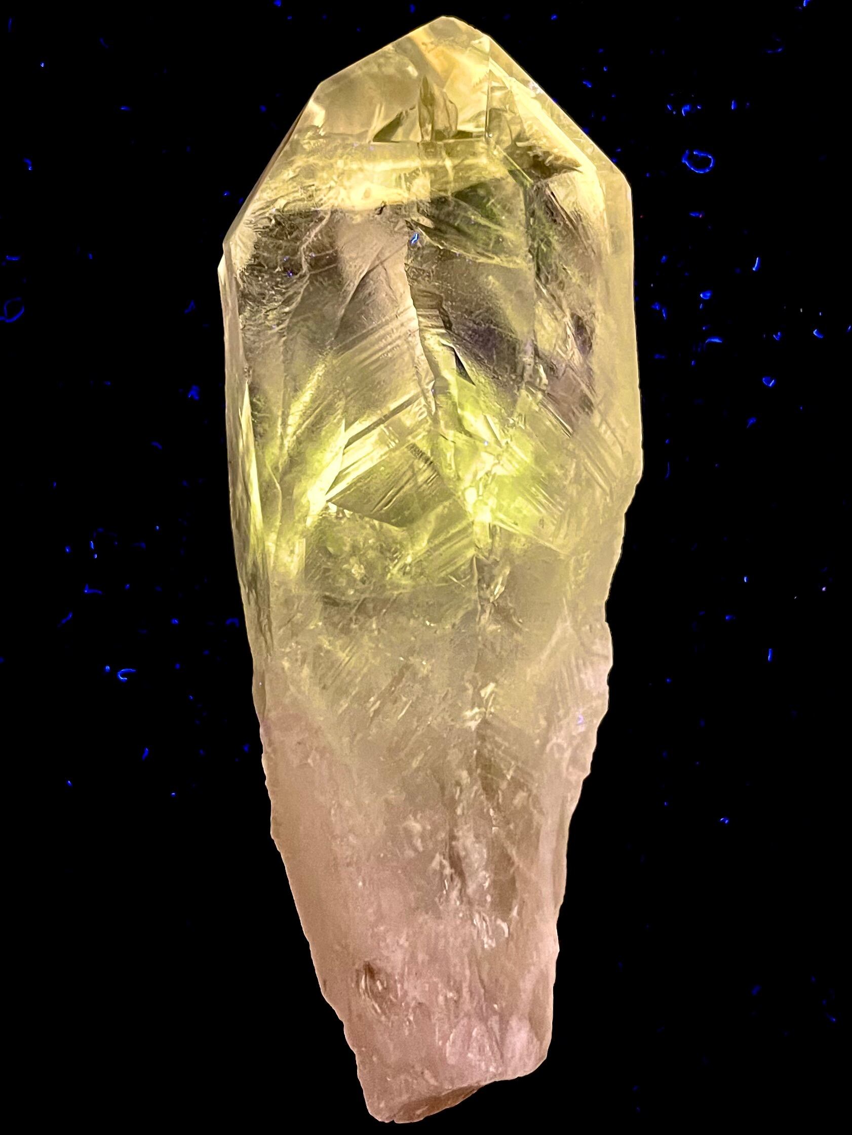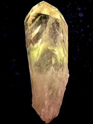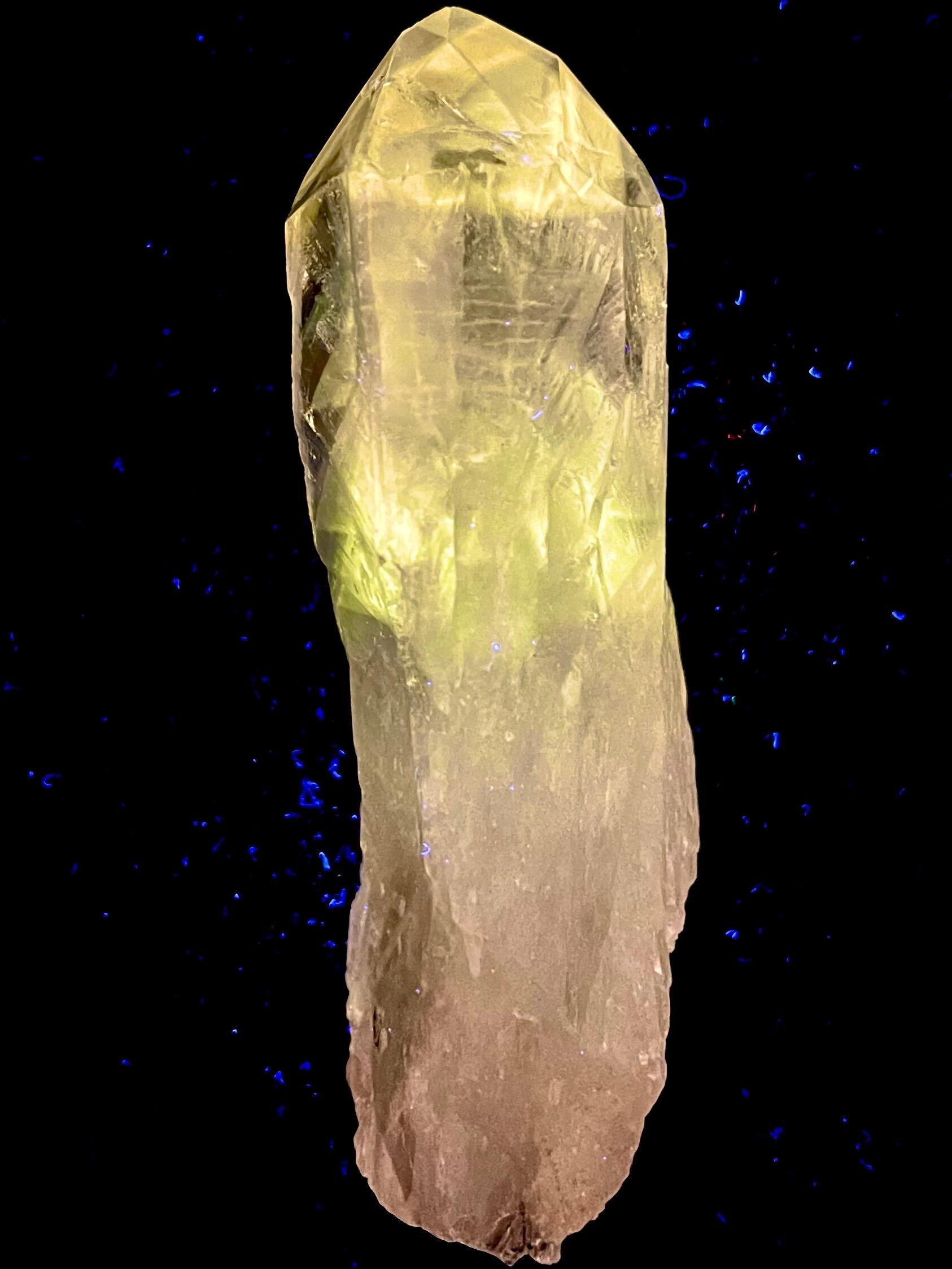 紫外線下で発光するパウエル石内包物は、この結晶の霊的意味の中核を成す。