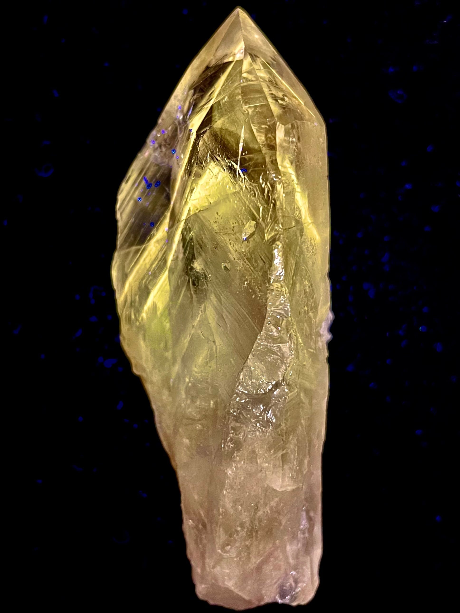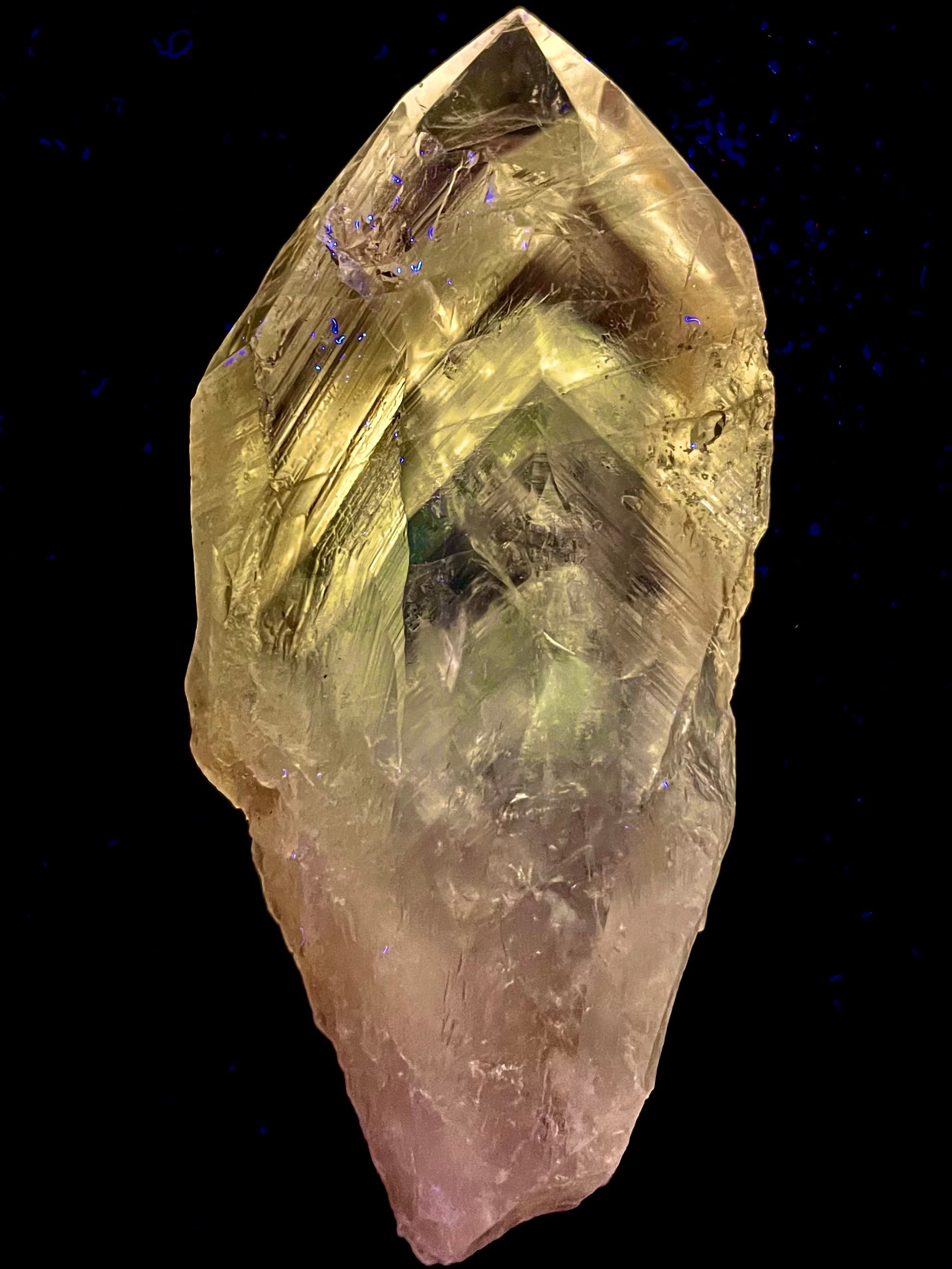 紫外線下で発光するパウエル石内包物は、この結晶の霊的意味の中核を成す。