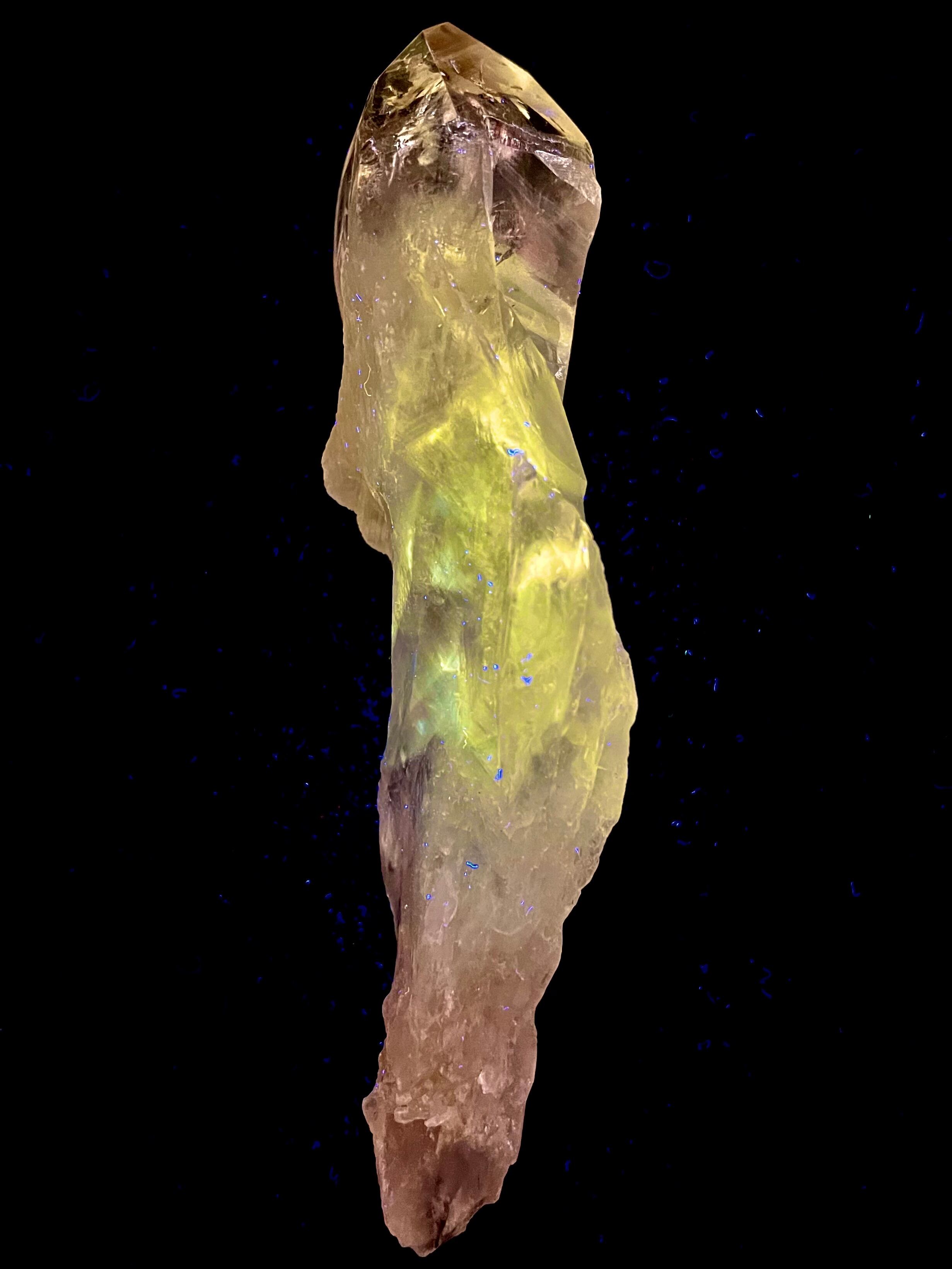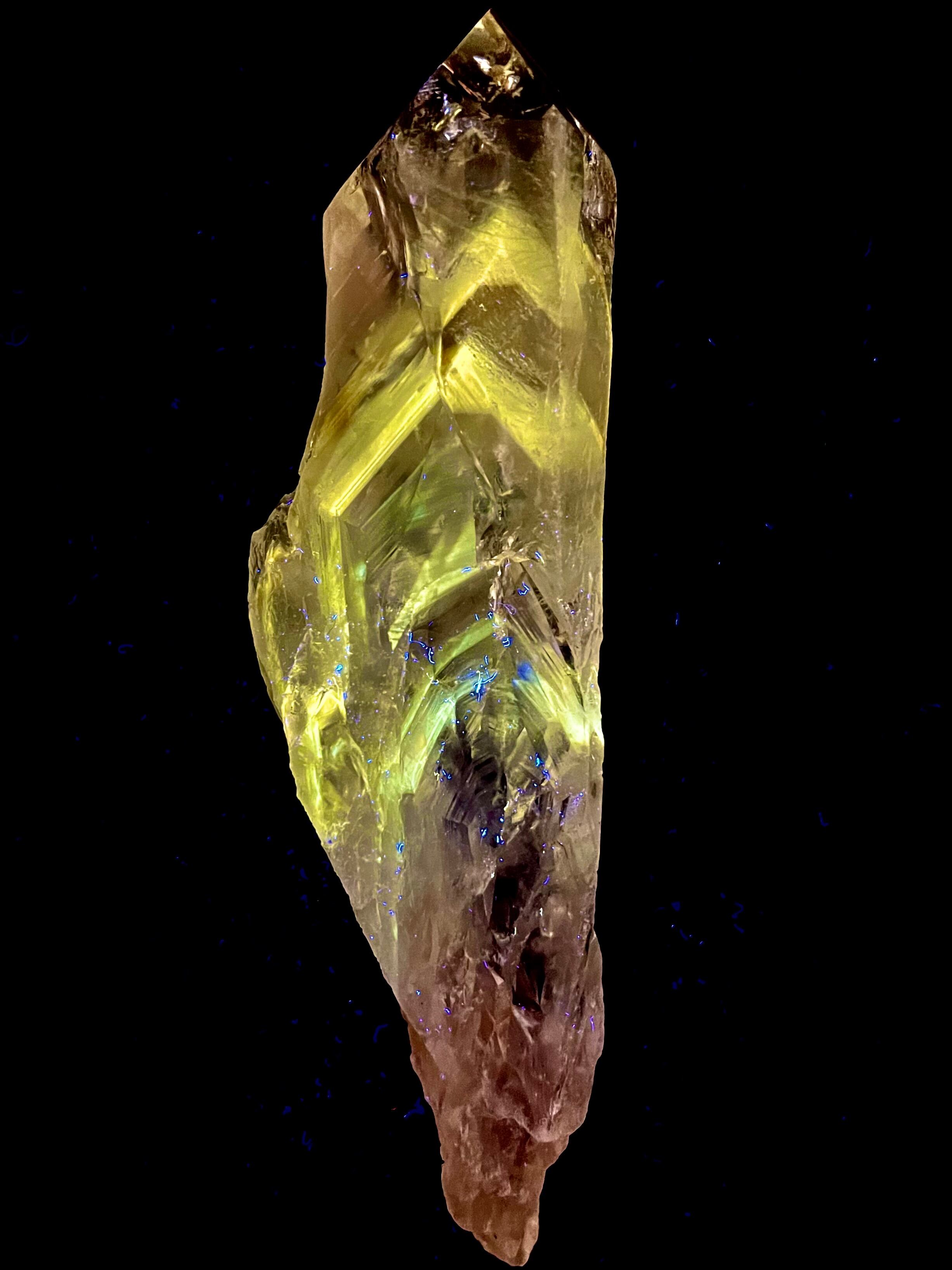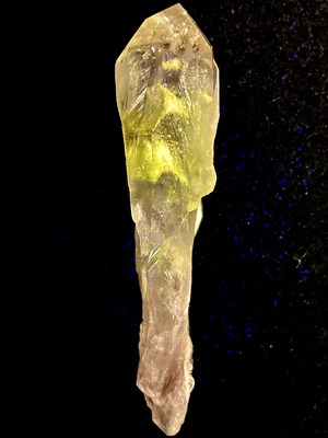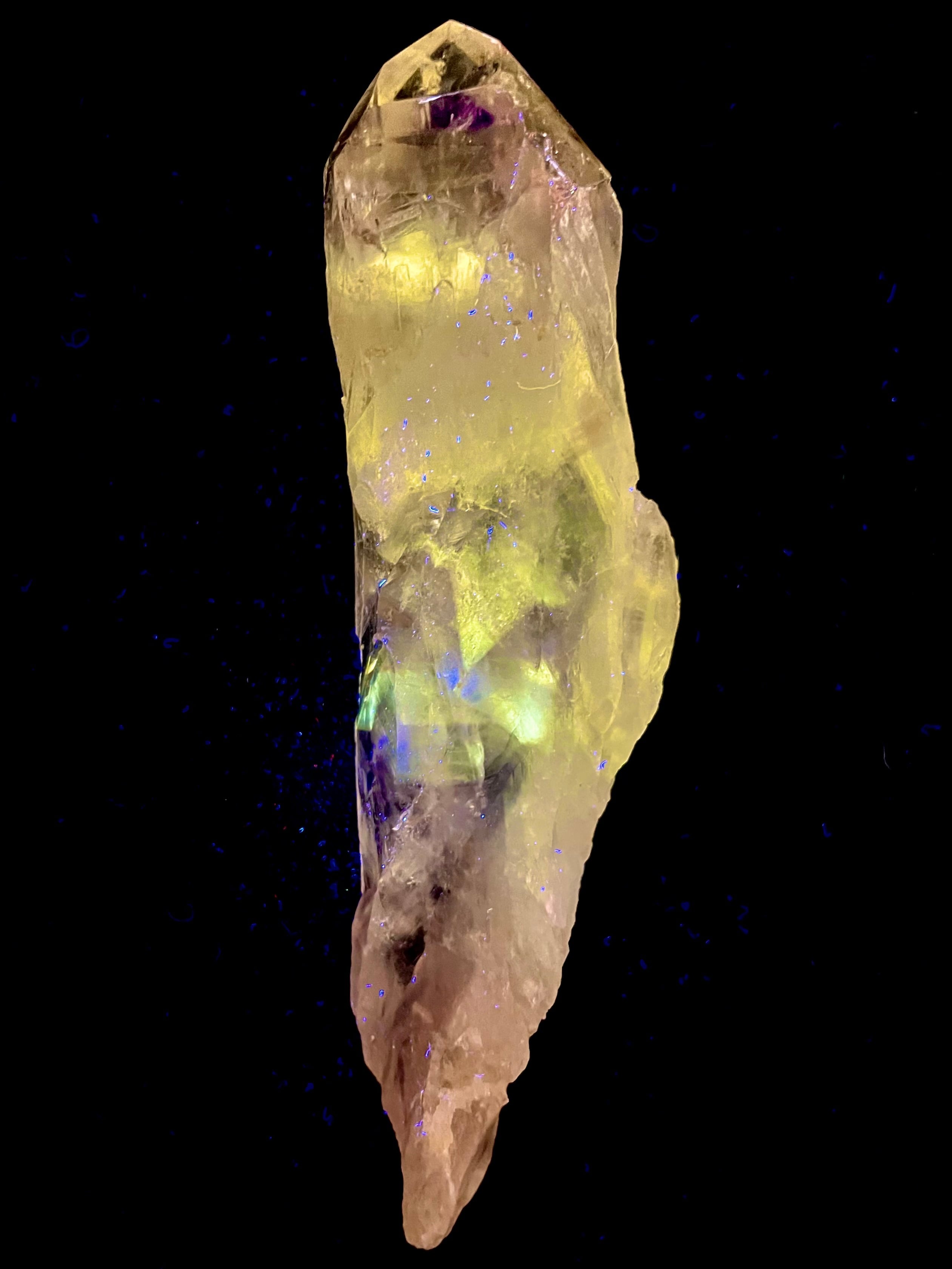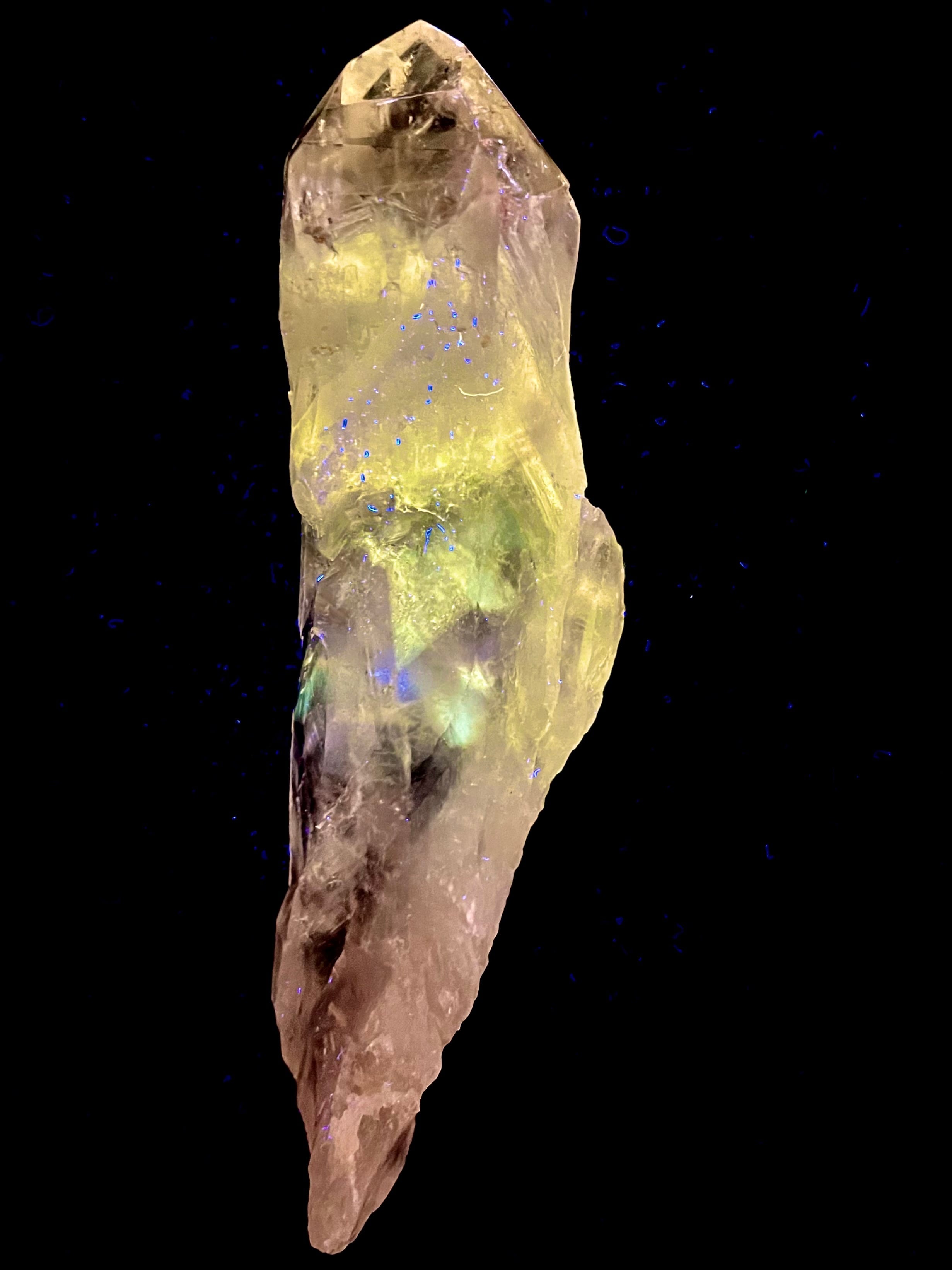 紫外線下で発光するパウエル石内包物は、この結晶の霊的意味の中核を成す。