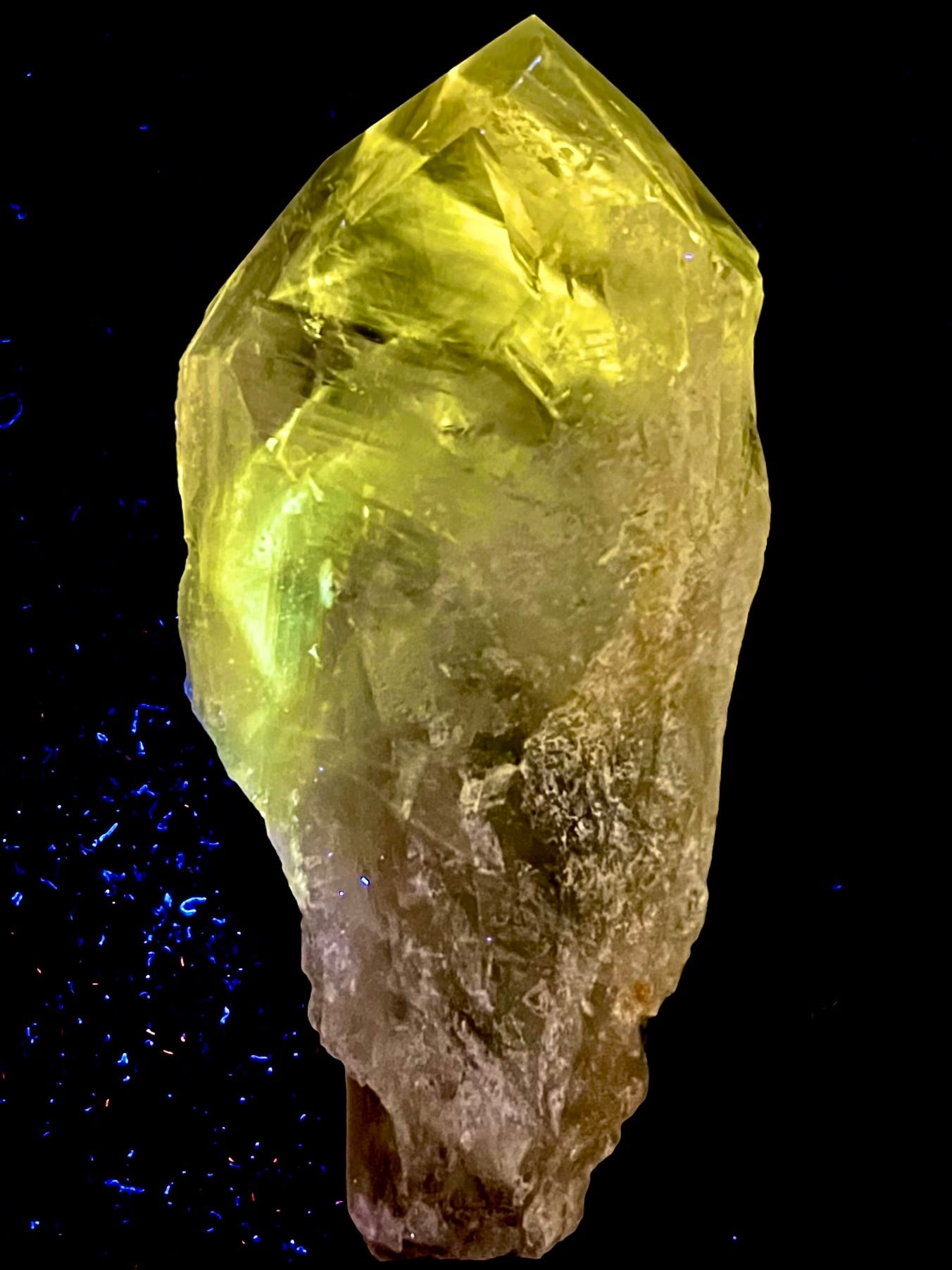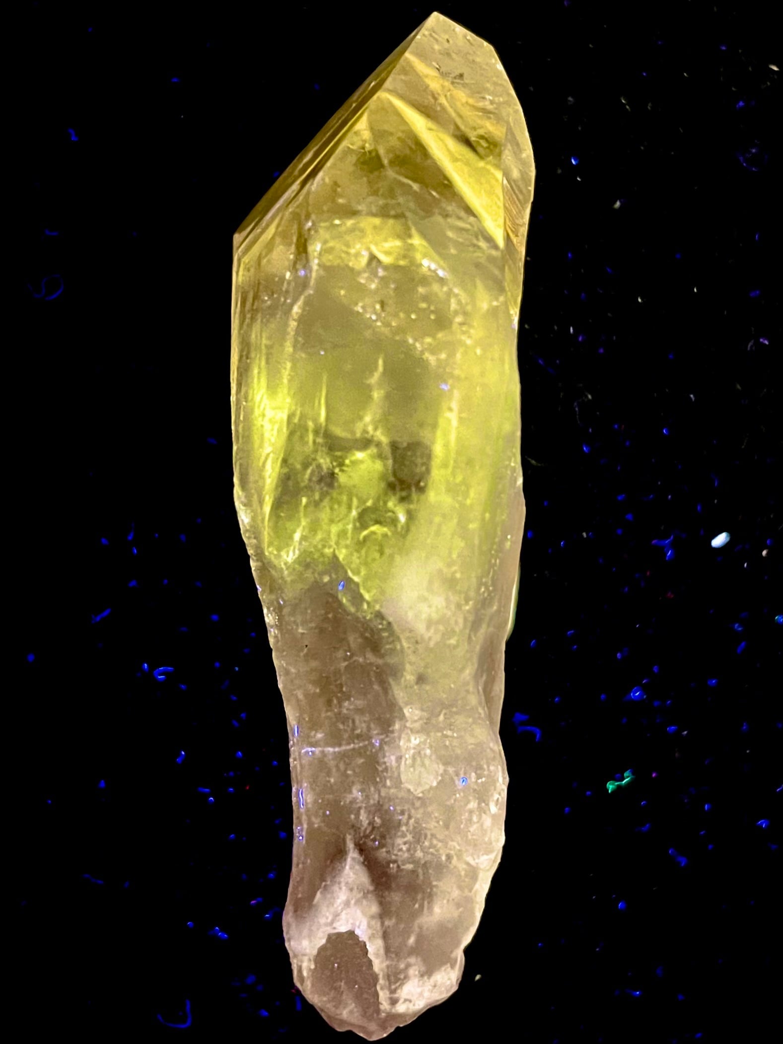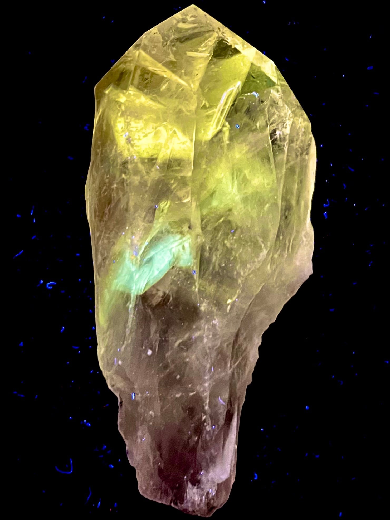 紫外線下で発光するパウエル石内包物は、この結晶の霊的意味の中核を成す。