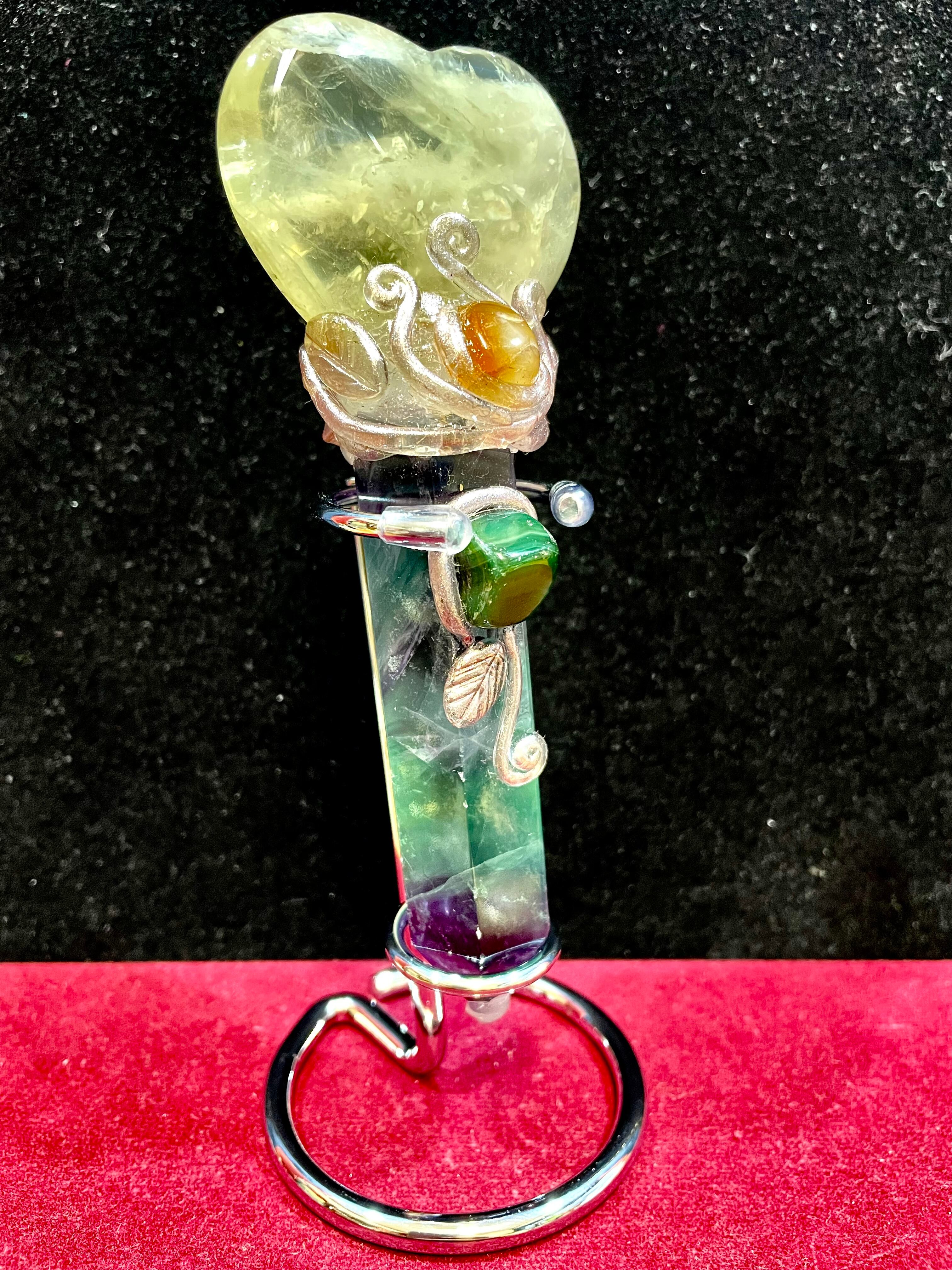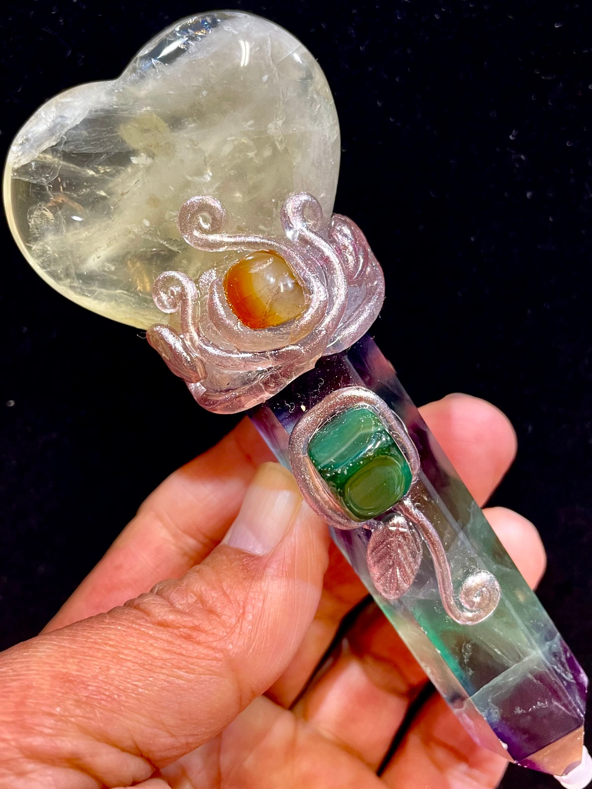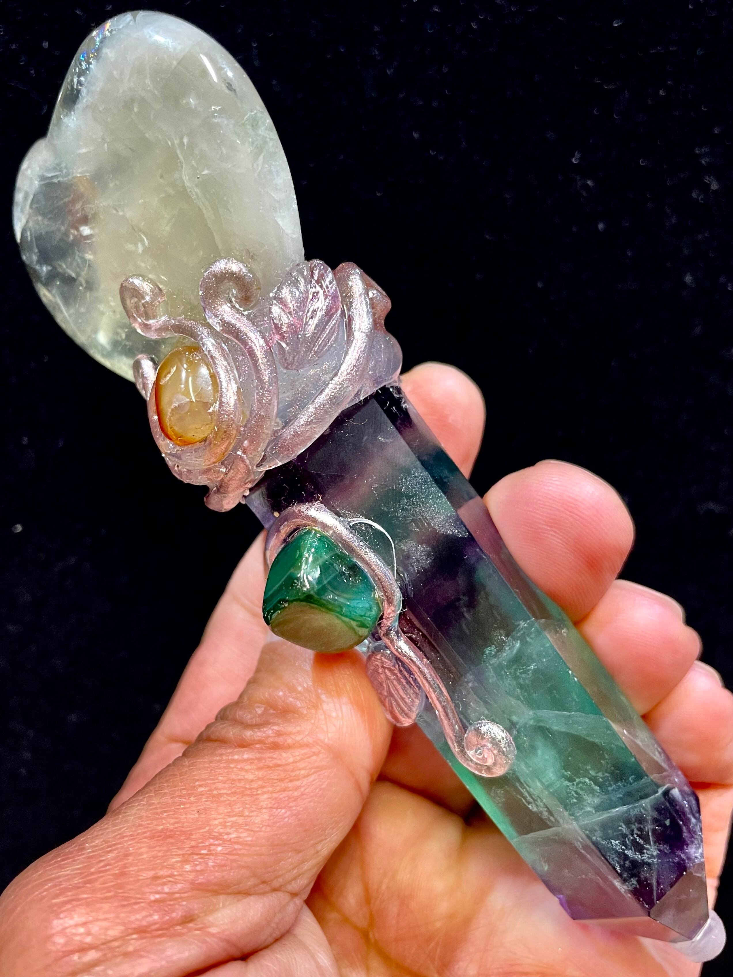 フローライト、マラカイト、カーネリアン等を活用したハンドメイドの「クリスタルワンド」です。