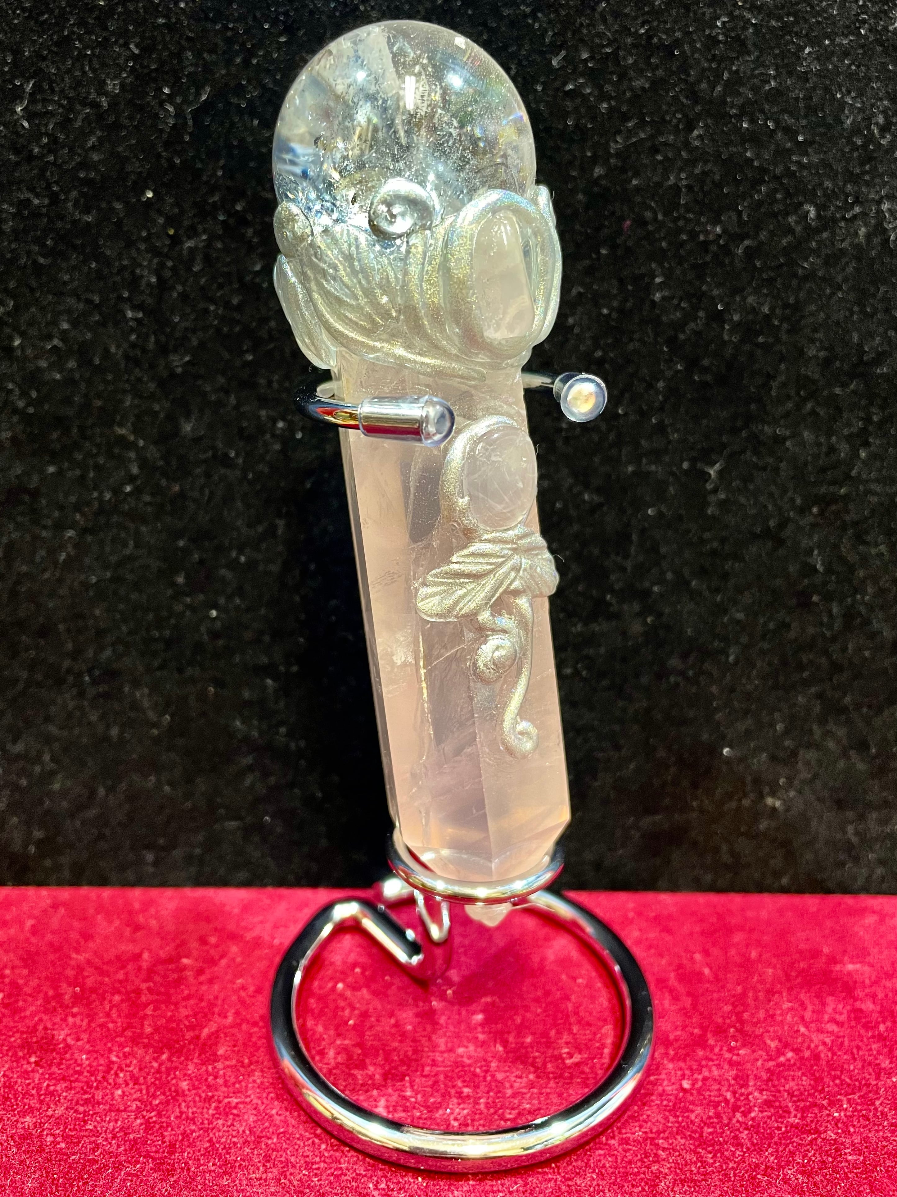 ローズクオーツ、アイリス・レインボークオーツ等を活用したハンドメイドの「クリスタルワンド」です。