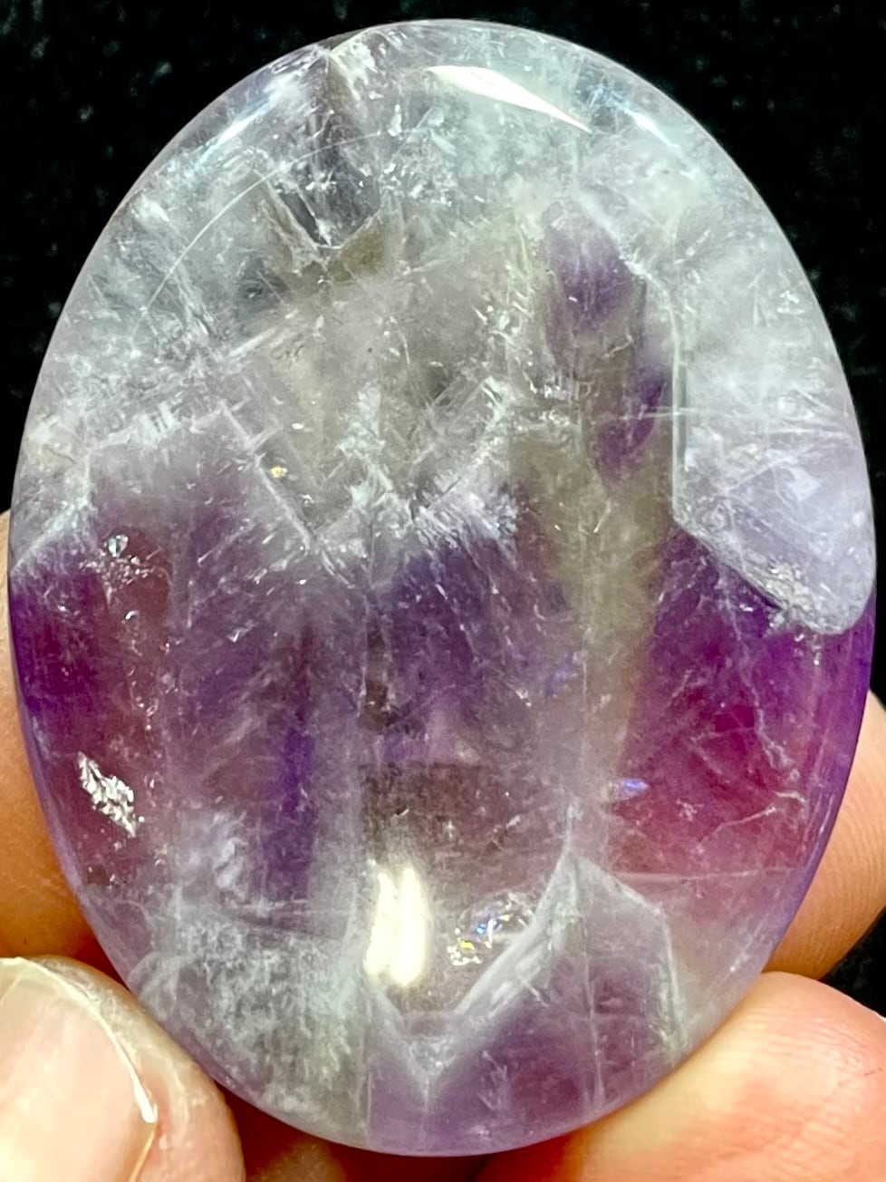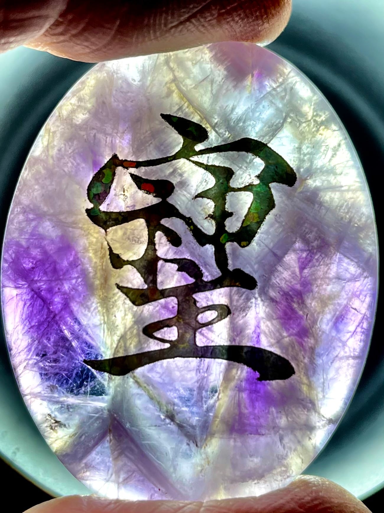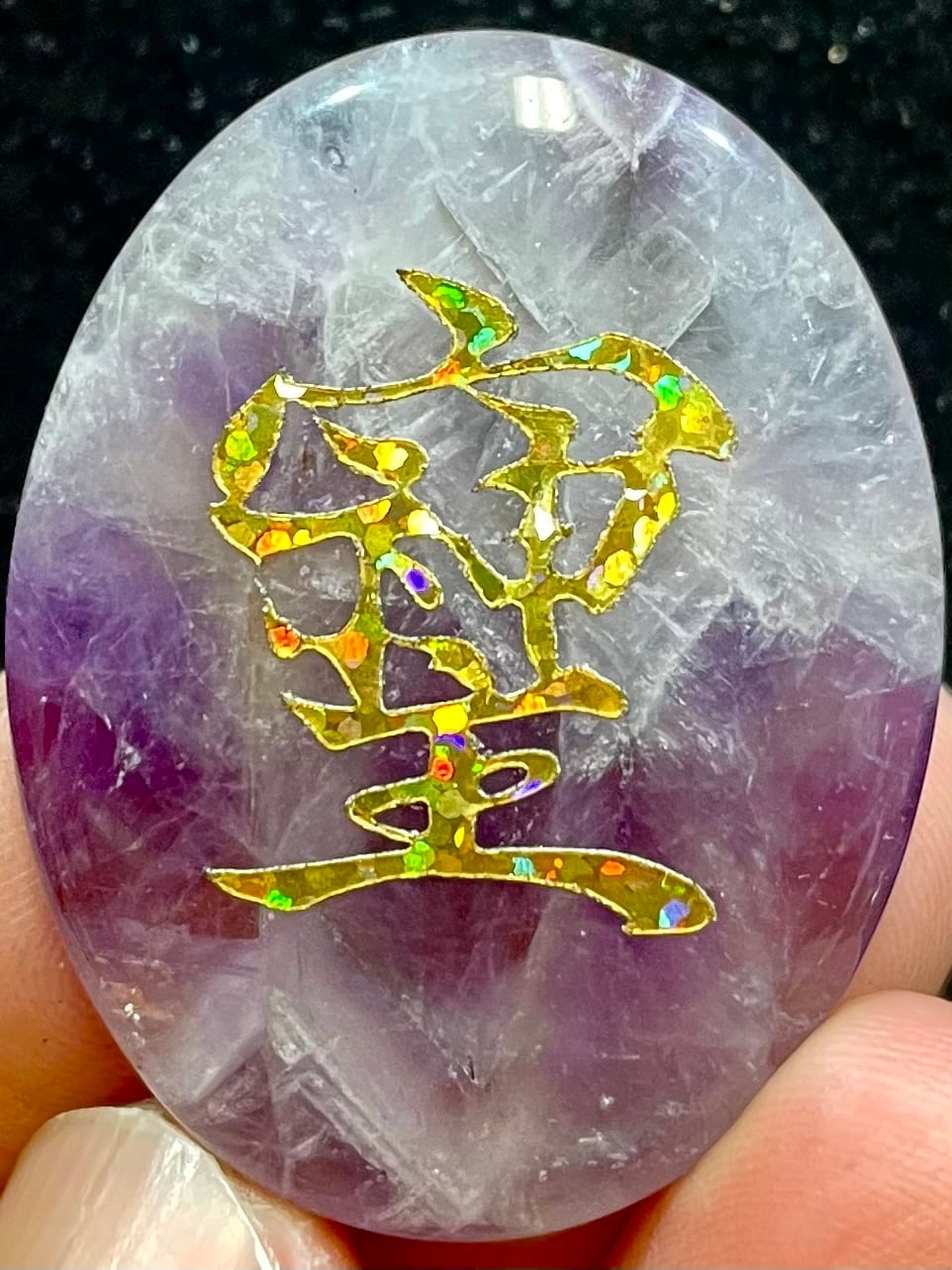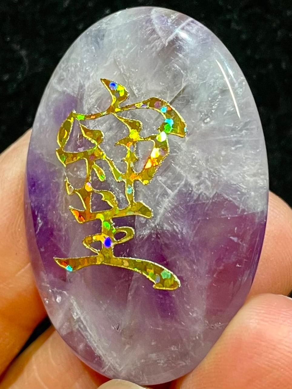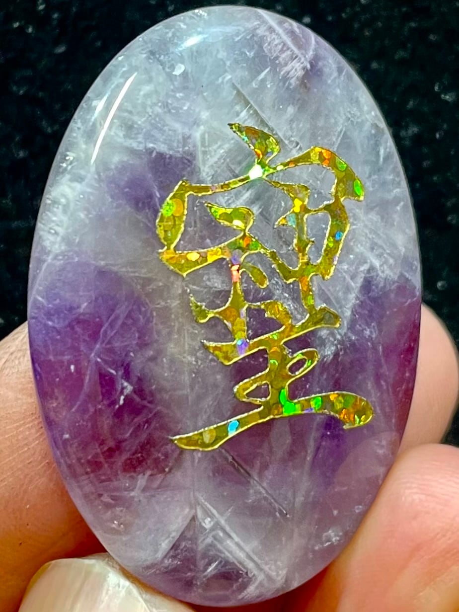 鮮やかなブラジル産アメジストに「そしじ」レインボー・ラメ入り高品質ステッカー(無防水)を貼っています。