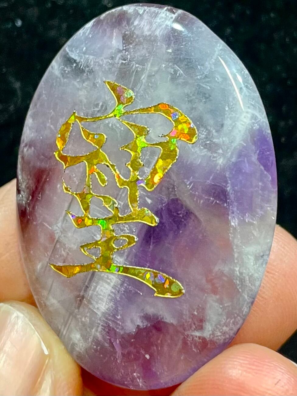鮮やかなブラジル産アメジストに「そしじ」レインボー・ラメ入り高品質ステッカー(無防水)を貼っています。