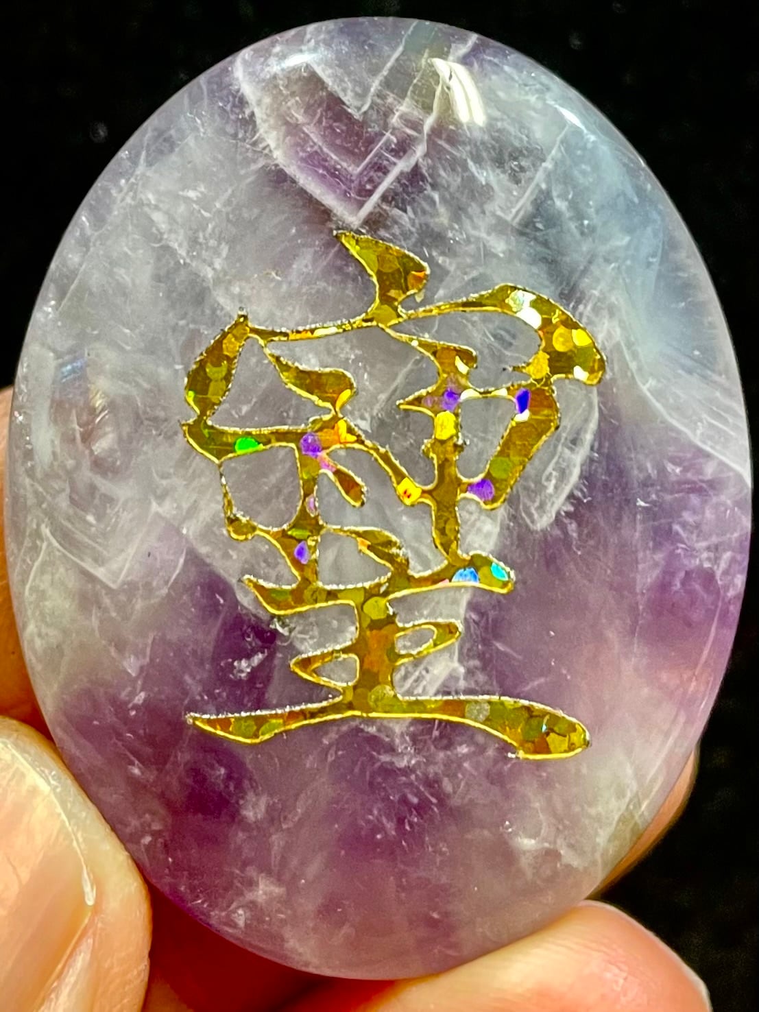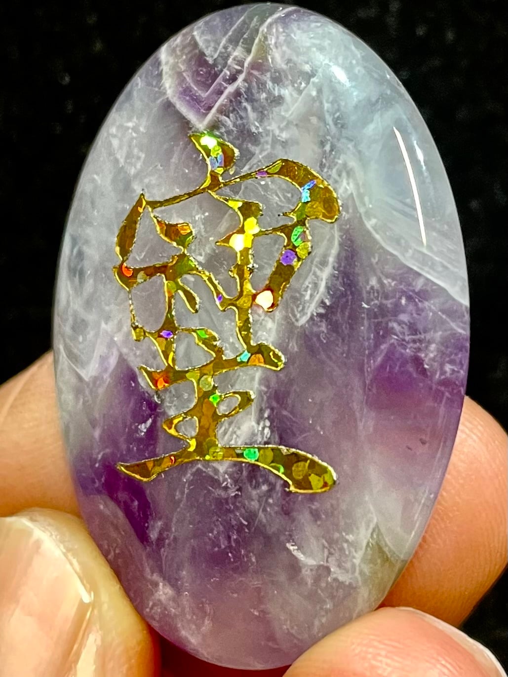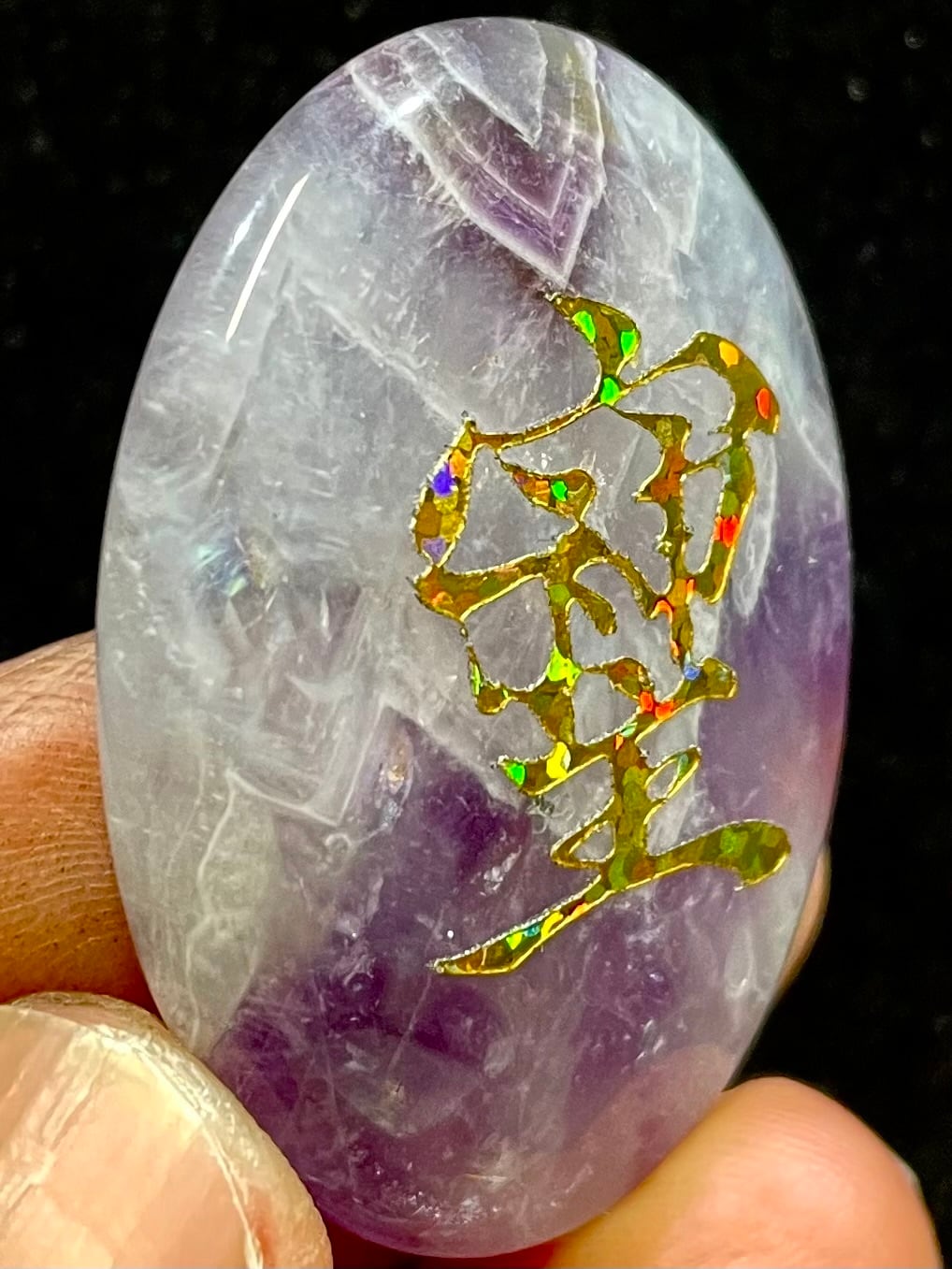 鮮やかなブラジル産アメジストに「そしじ」レインボー・ラメ入り高品質ステッカー(無防水)を貼っています。