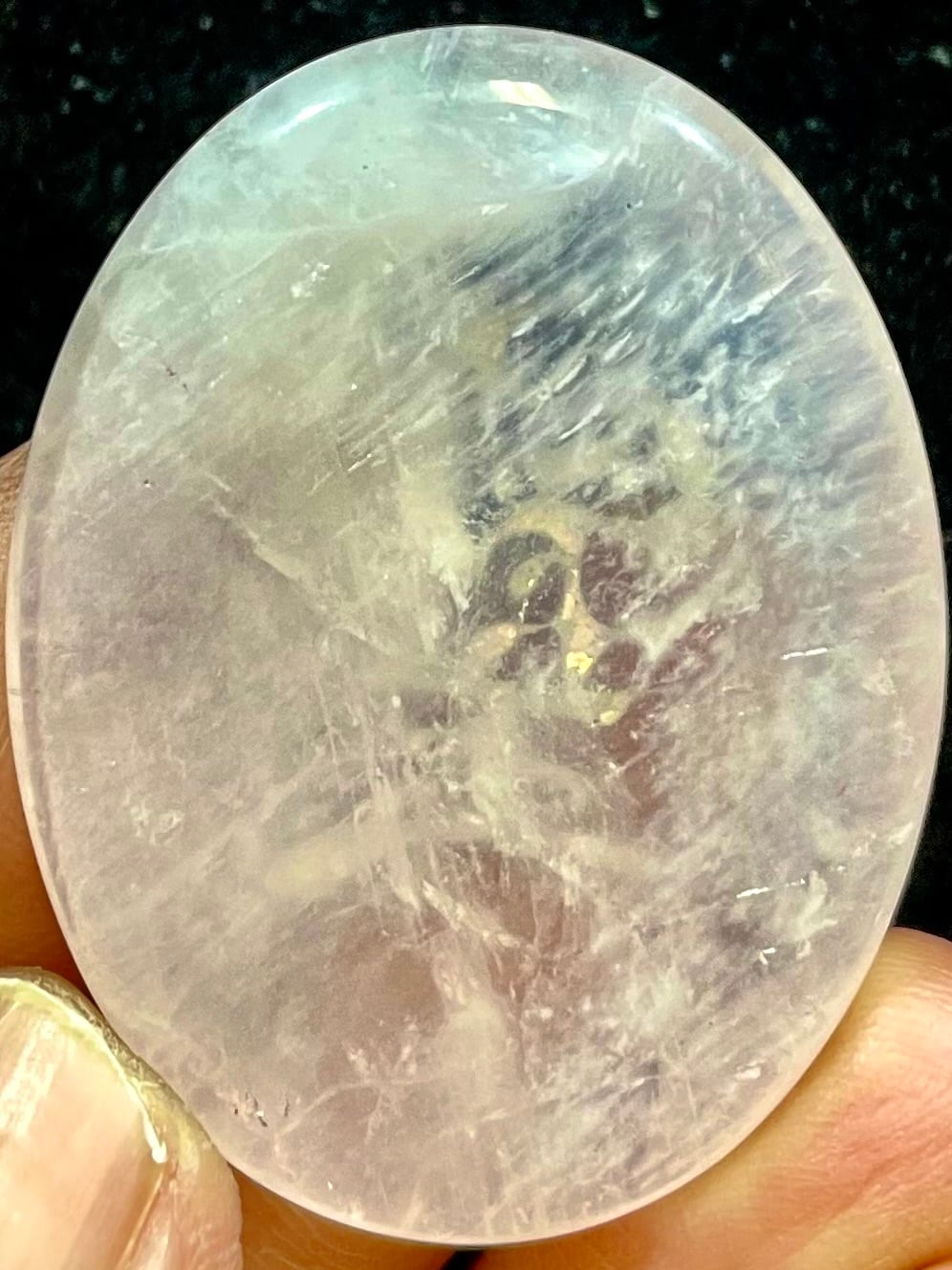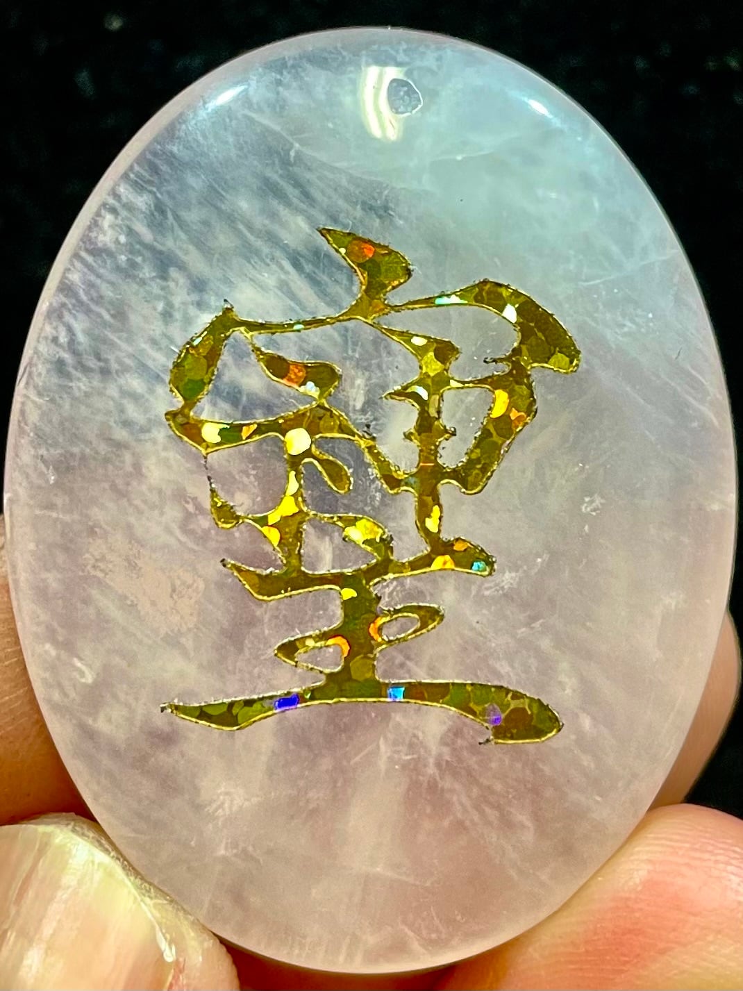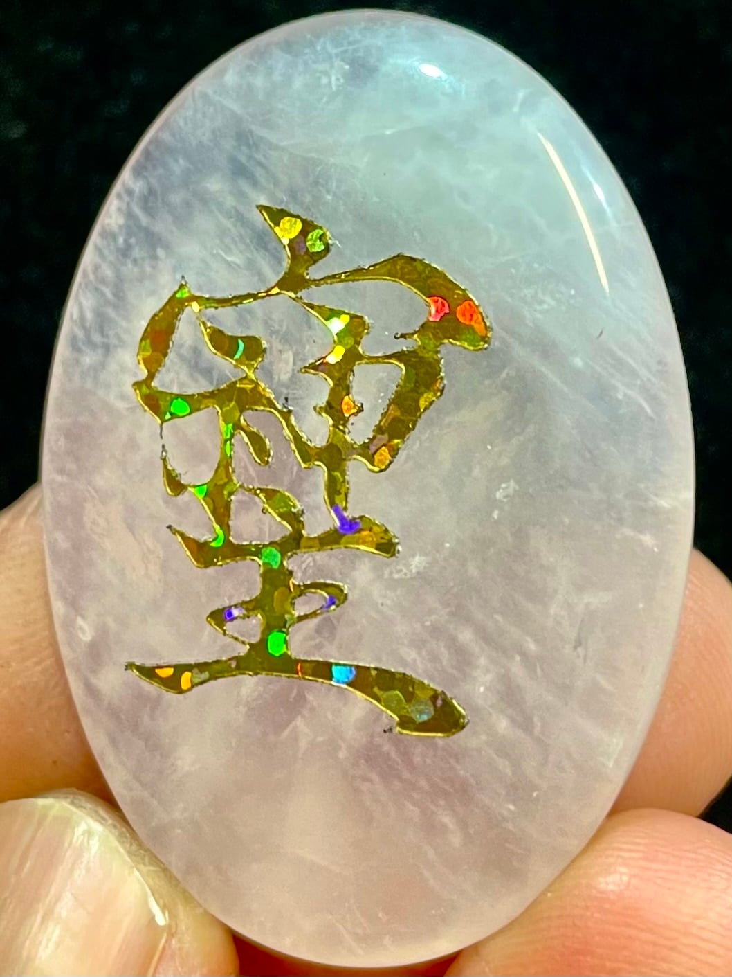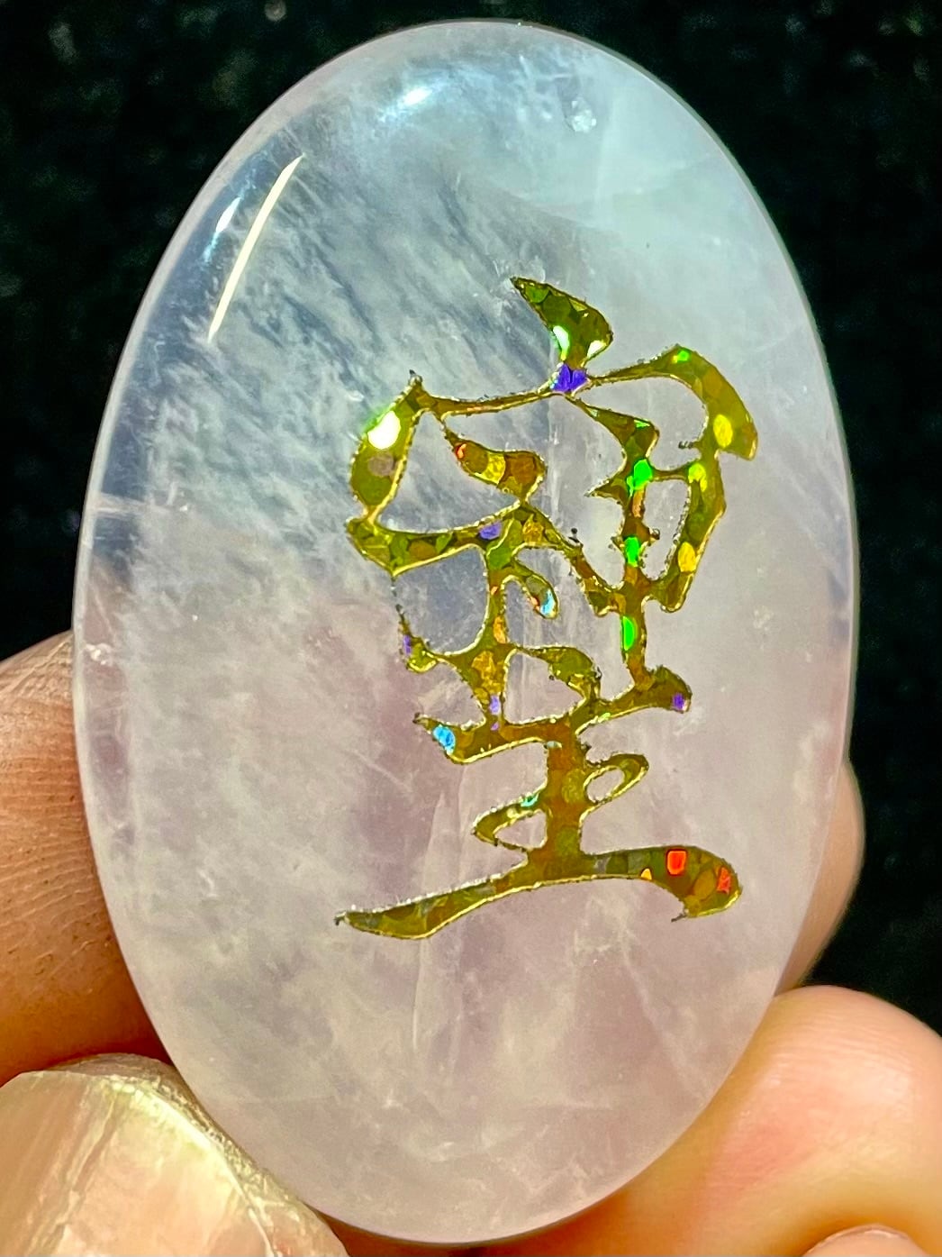 鮮やかなブラジル産ローズクオーツに「そしじ」レインボー・ラメ入り高品質ステッカー(無防水)を貼っています。