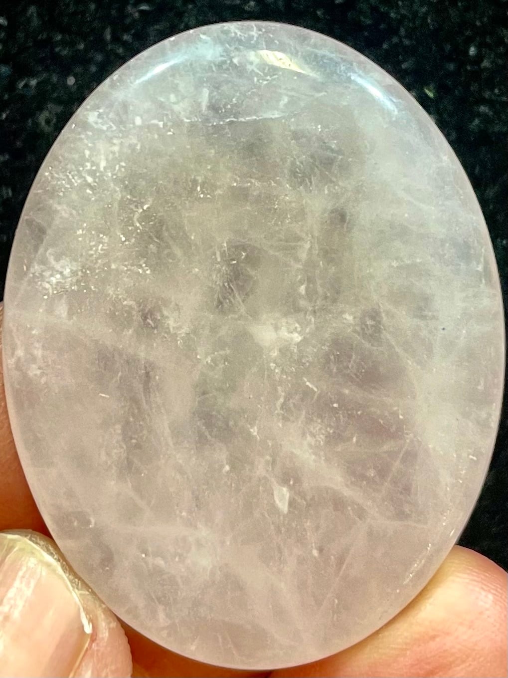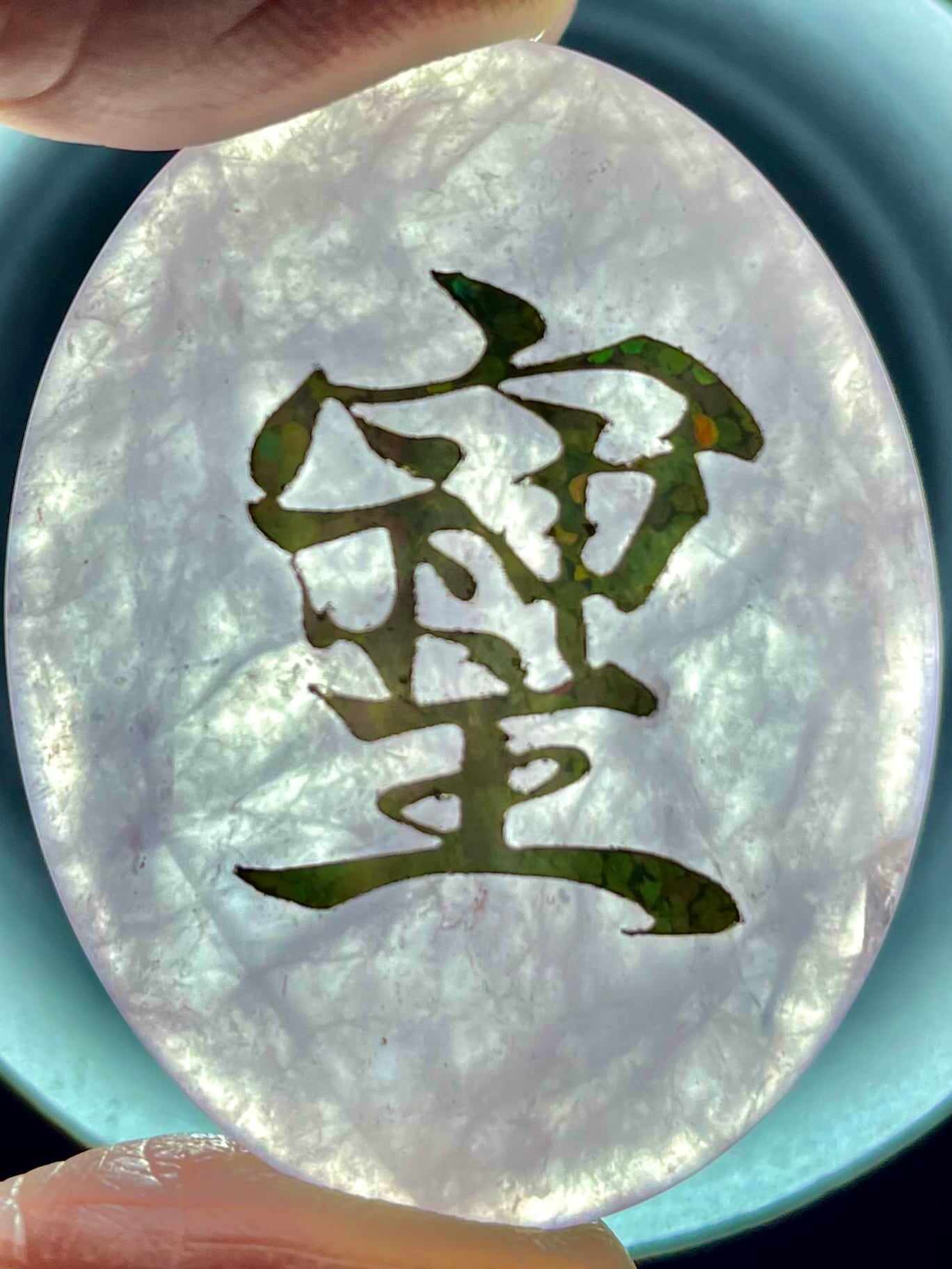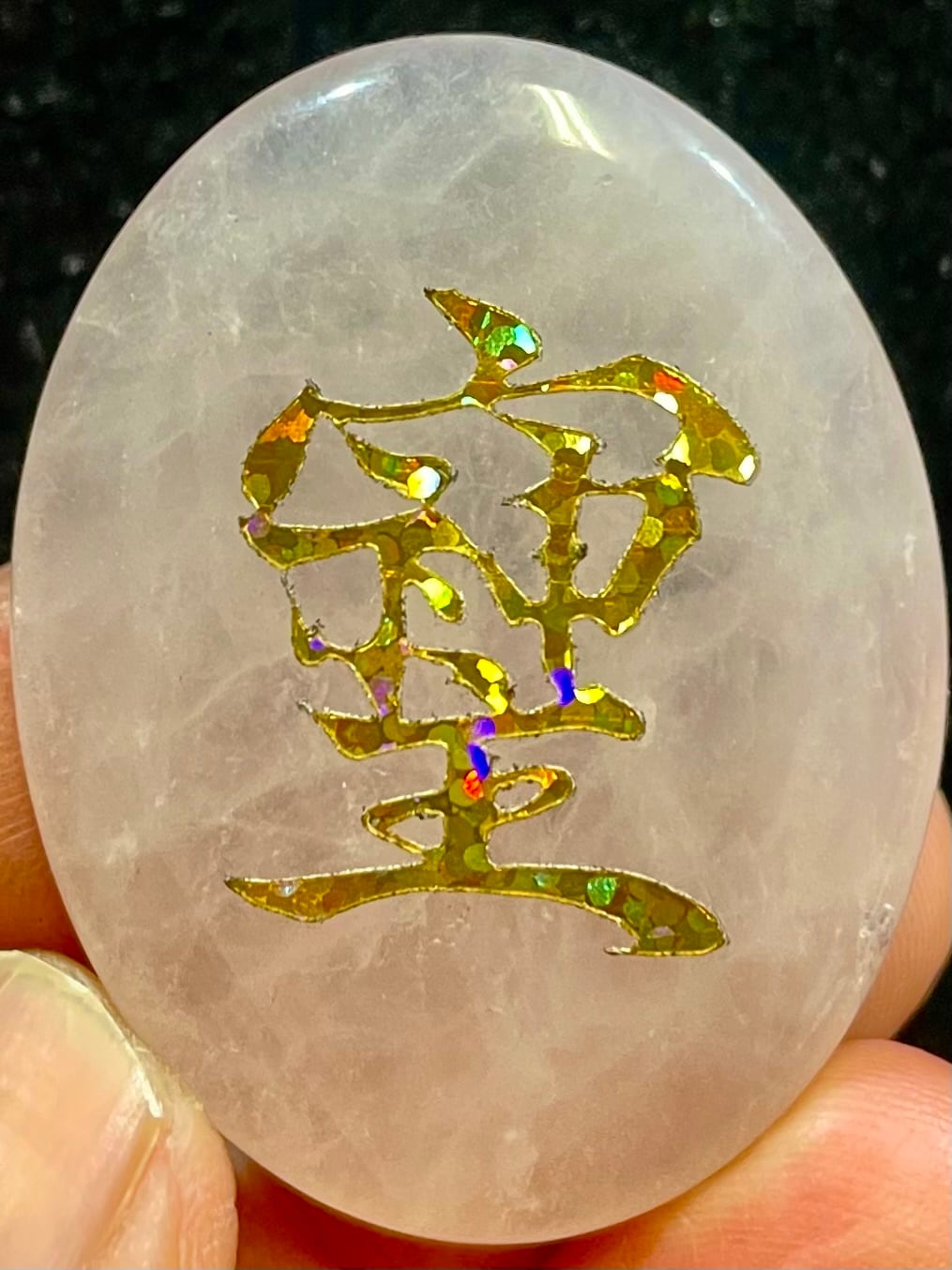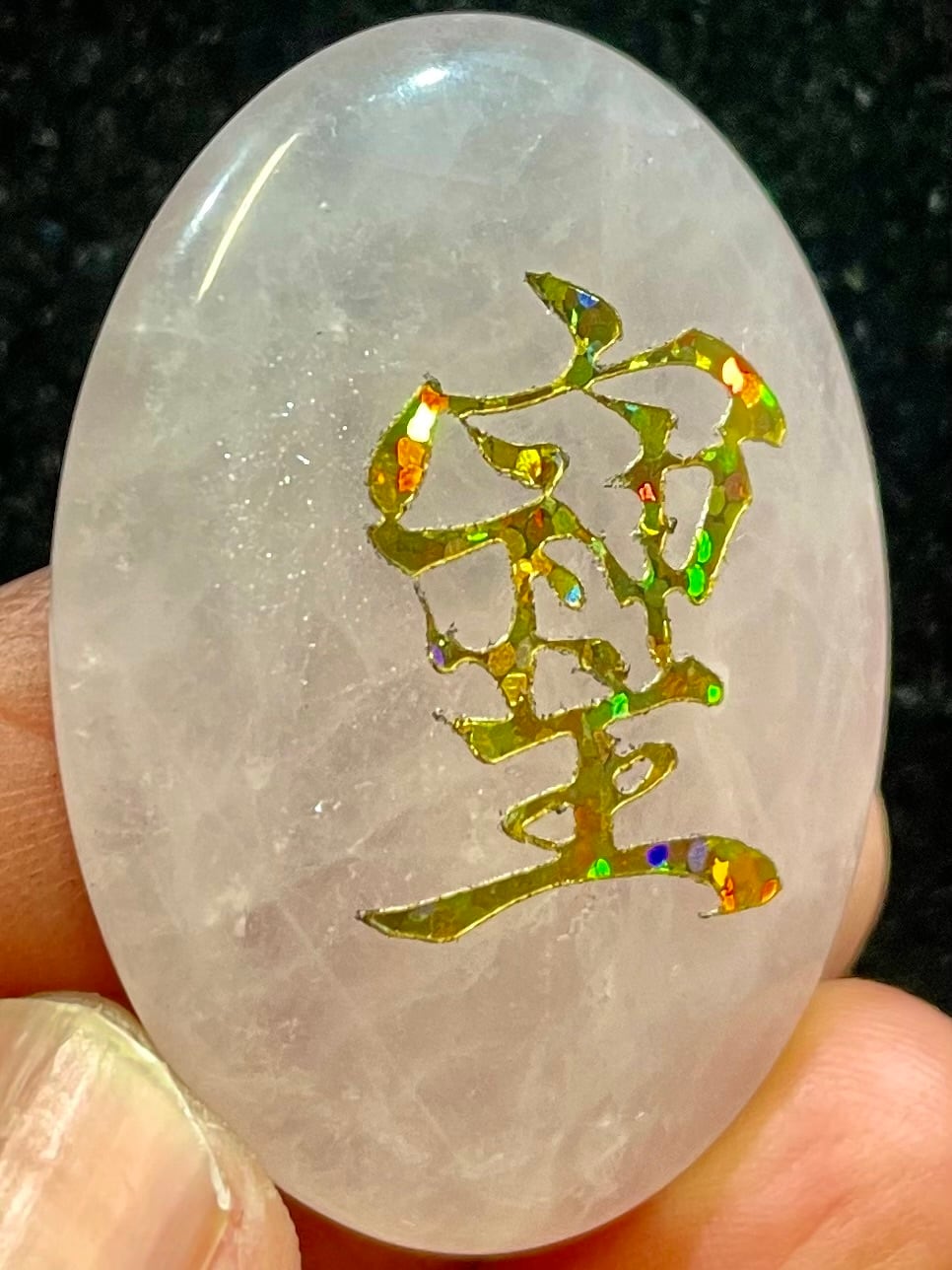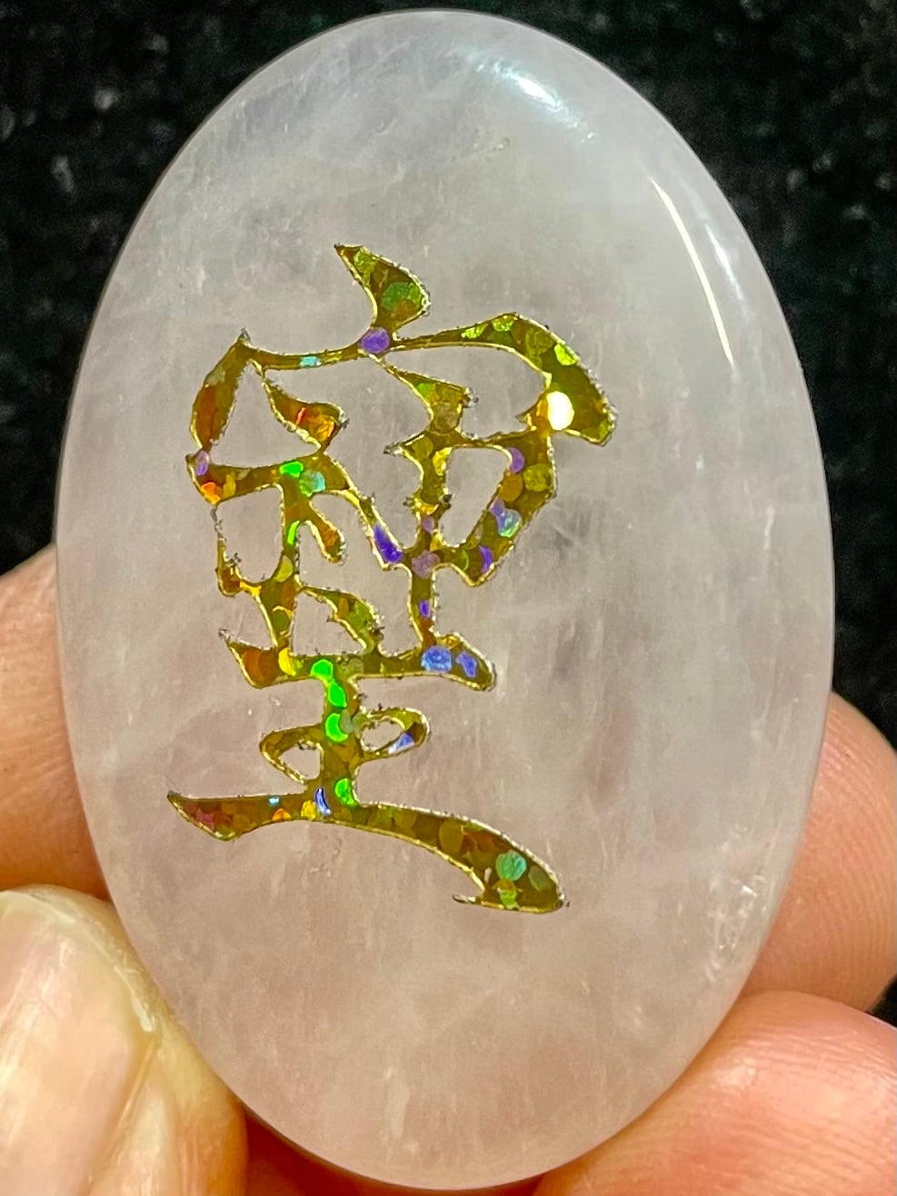 鮮やかなブラジル産ローズクオーツに「そしじ」レインボー・ラメ入り高品質ステッカー(無防水)を貼っています。