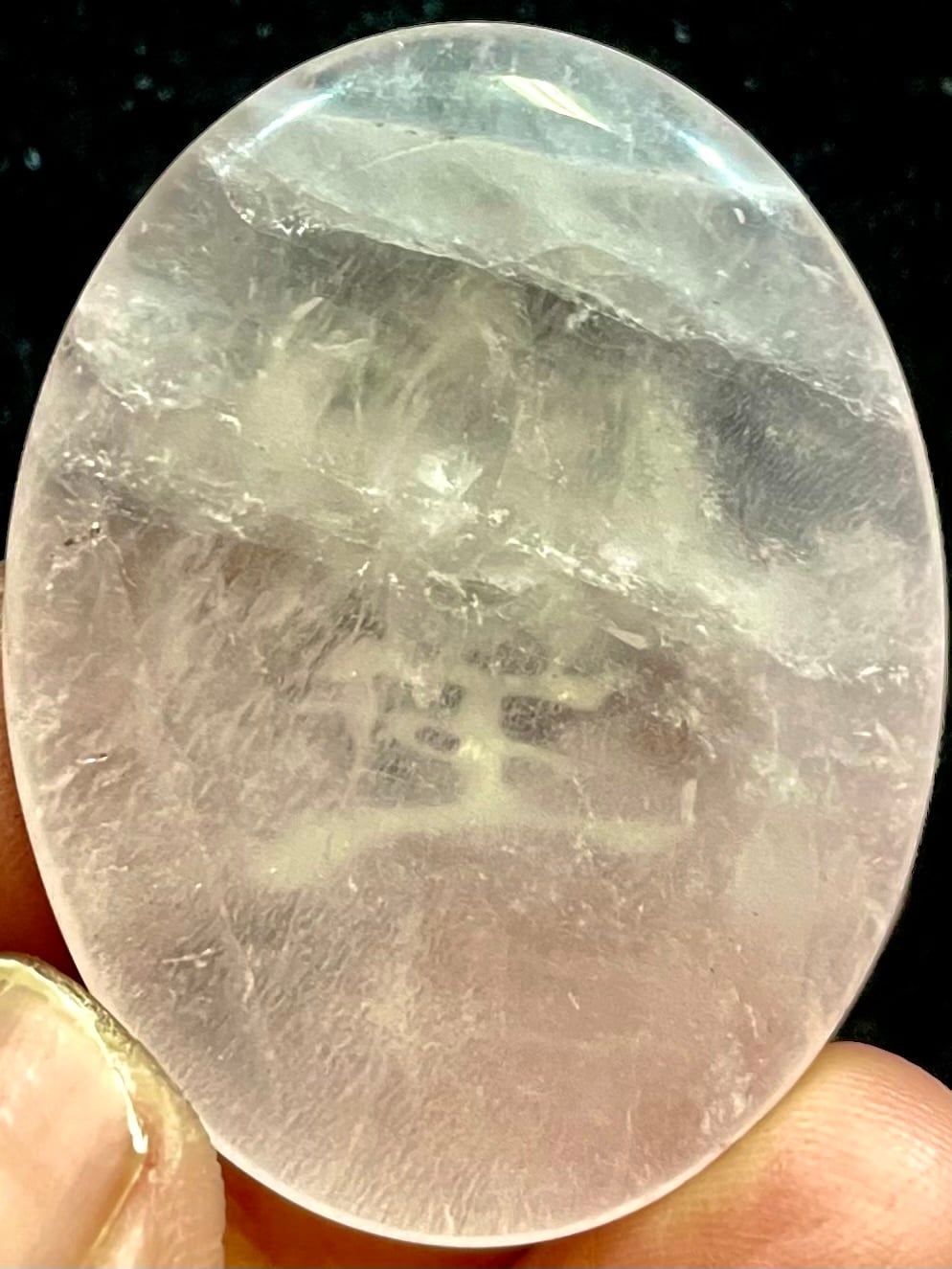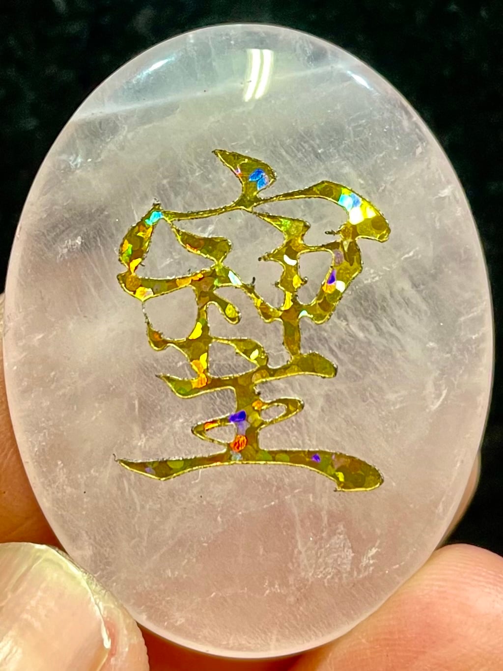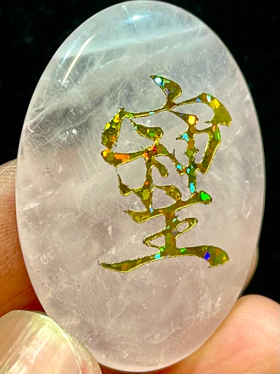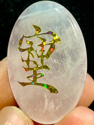 鮮やかなブラジル産ローズクオーツに「そしじ」レインボー・ラメ入り高品質ステッカー(無防水)を貼っています。