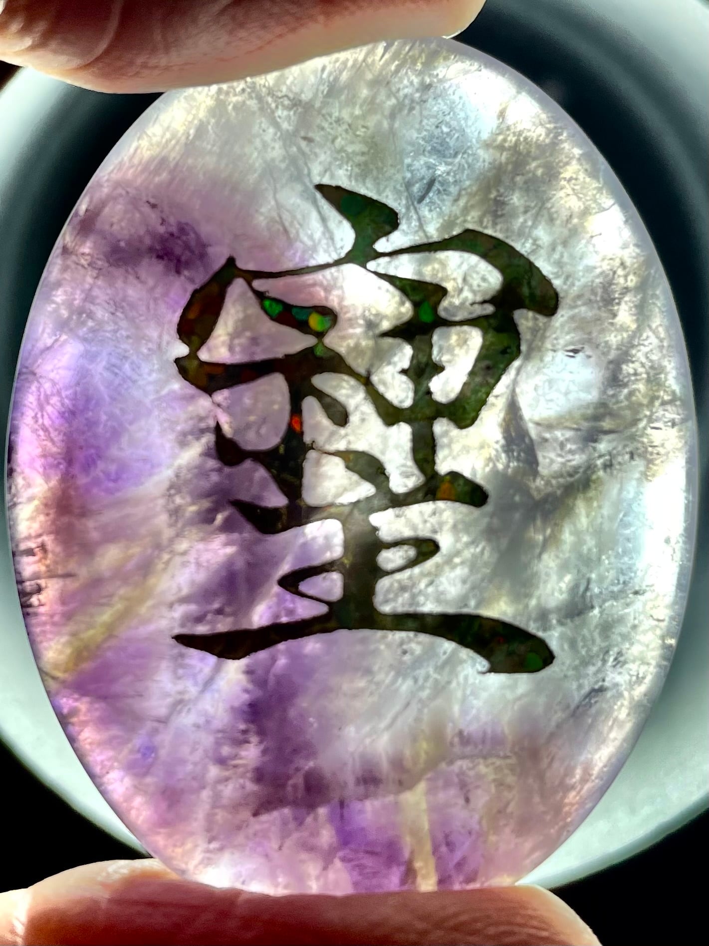 鮮やかなブラジル産アメジストに「そしじ」レインボー・ラメ入り高品質ステッカー(無防水)を貼っています。