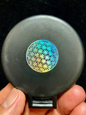 大変便利な携帯用「コンパクト・ミラー」に、エネルギーレベルを上げるといわれている「フラワーオブライフ」のシール。