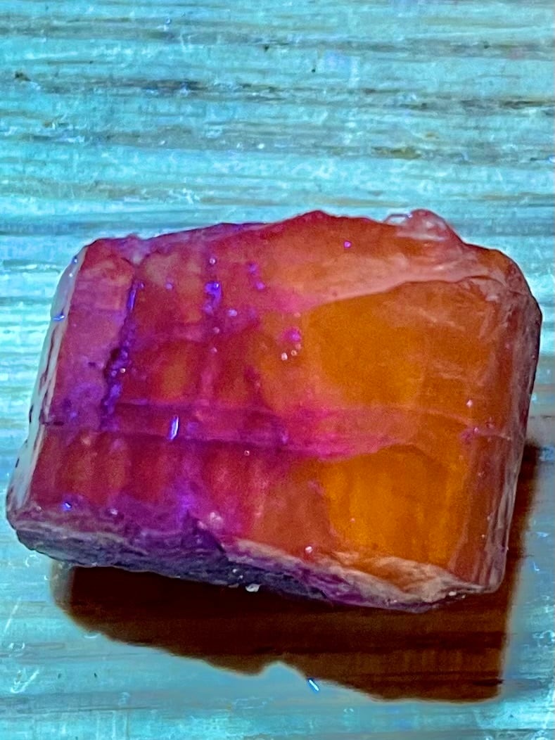 アフガニスタン産パープルスキャポライトは「マリアライト」とも呼ばれ、ブラックライトでオレンジ色に蛍光します。