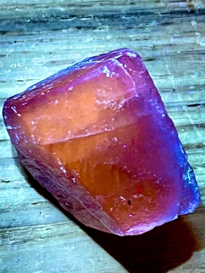 アフガニスタン産パープルスキャポライトは「マリアライト」とも呼ばれ、ブラックライトでオレンジ色に蛍光します。